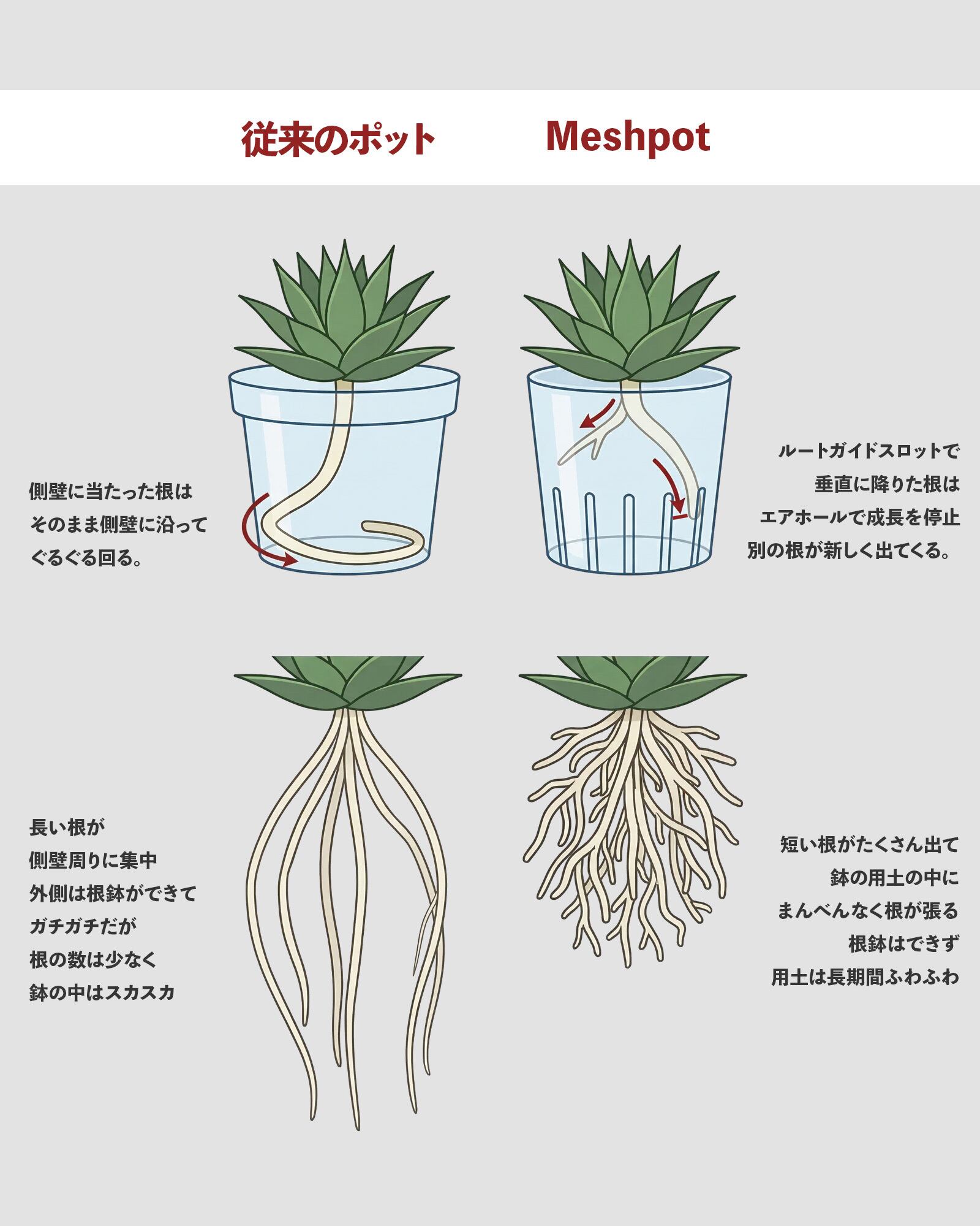 Meshpotは中国で企画開発されたプラスチックポットブランド。まず目を引くのが側面に空いた穴「エアホール」でその抜群の通気性と排水性はすぐ理解できますが、真の実力は側面に設置された縦方向の壁「ルートガイドスロット」。このスロットが伸びた根を回り込ませずそのまま下に導き、高い位置にあるエアホールからいち早く根がでてくるので、むやみな根回りを防ぎ、根鉢を健康な状態に保ちます。同じサイズのプラポットだと植え替えてから鉢底から根を出すまで半年くらいかかるところ、このポットだと最短1週間で根が出てくるので根鉢の状態も早く正確に掴むことができます。多肉栽培の新しいスタンダードになる予感しかしないNEWタイププラポットです。ぜひ手にとってお試しいただければと思います。