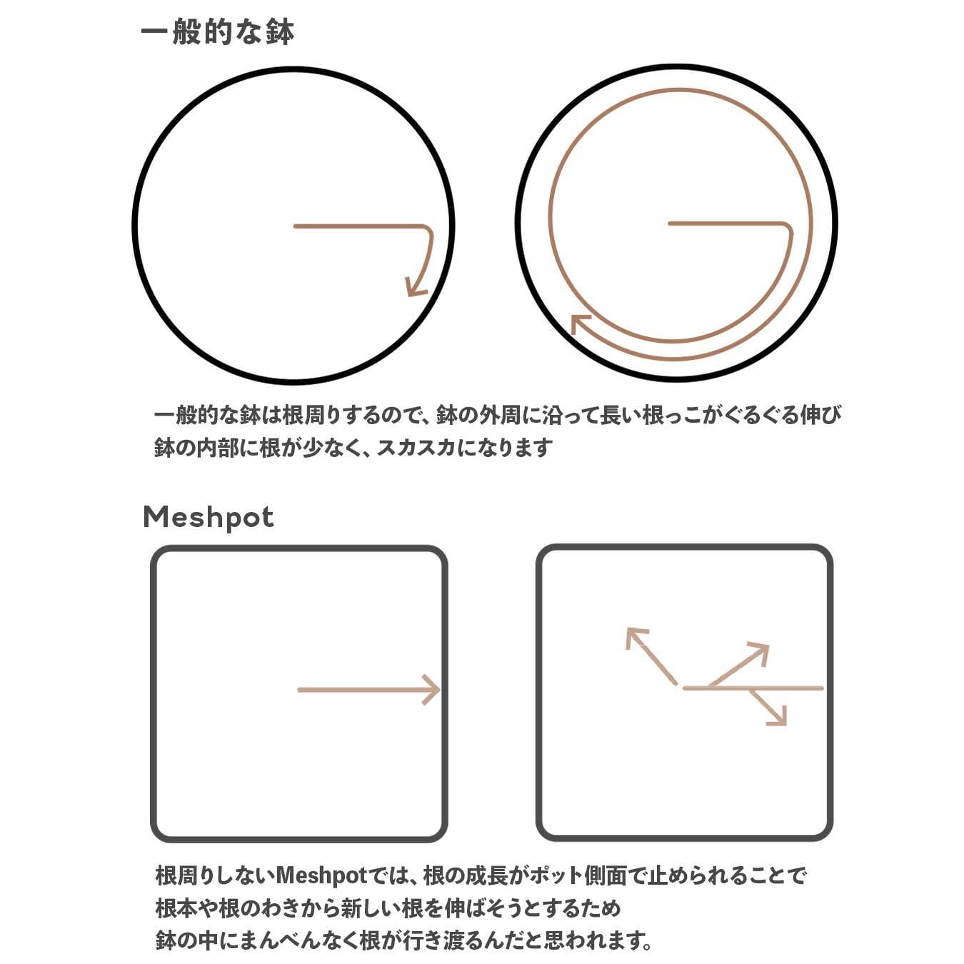 Meshpotは中国で企画開発されたプラスチックポットブランド。まず目を引くのが側面に空いた穴「エアホール」でその抜群の通気性と排水性はすぐ理解できますが、真の実力は側面に設置された縦方向の壁「ルートガイドスロット」。このスロットが伸びた根を回り込ませずそのまま下に導き、高い位置にあるエアホールからいち早く根がでてくるので、むやみな根回りを防ぎ、根鉢を健康な状態に保ちます。同じサイズのプラポットだと植え替えてから鉢底から根を出すまで半年くらいかかるところ、このポットだと最短1週間で根が出てくるので根鉢の状態も早く正確に掴むことができます。多肉栽培の新しいスタンダードになる予感しかしないNEWタイププラポットです。ぜひ手にとってお試しいただければと思います。