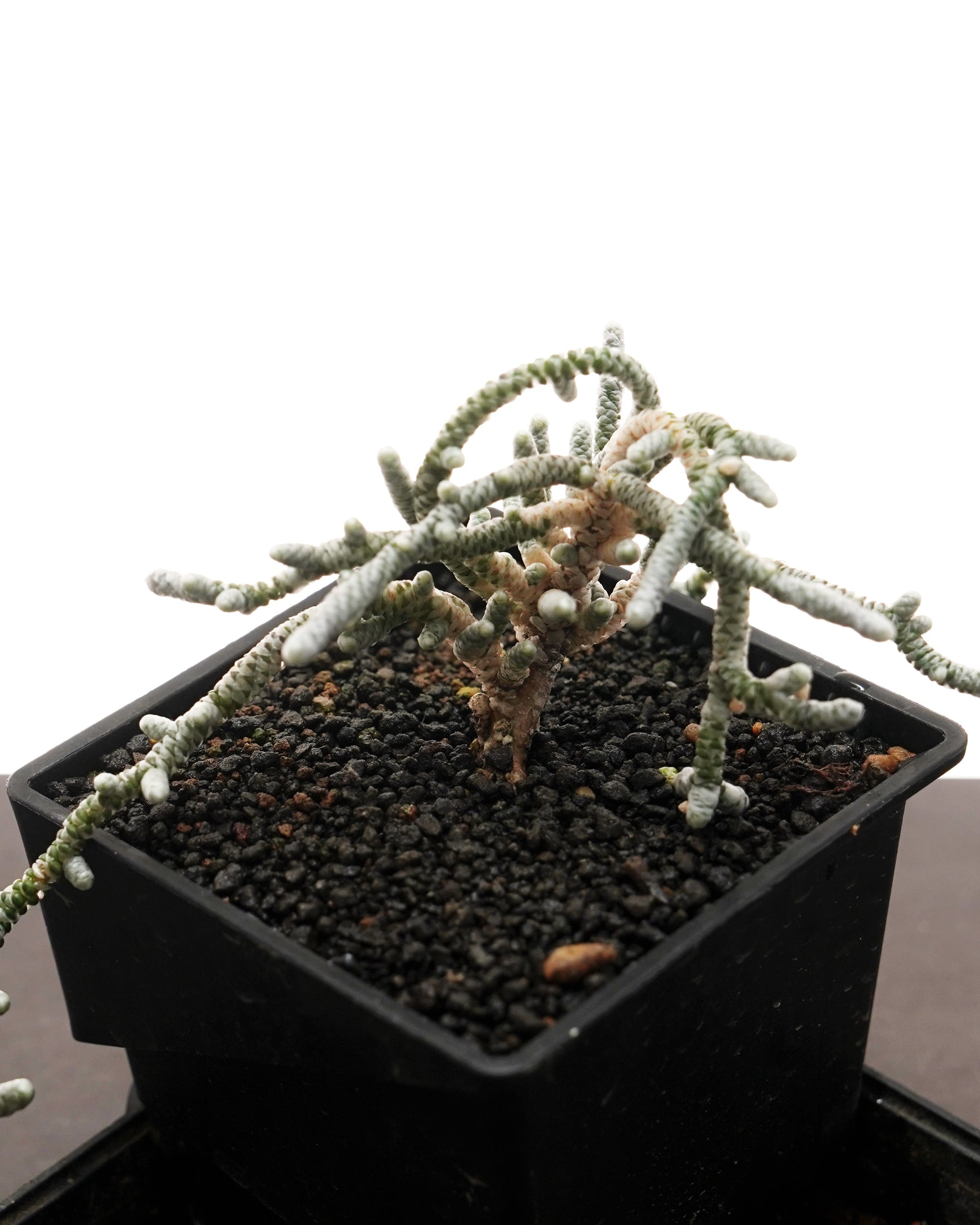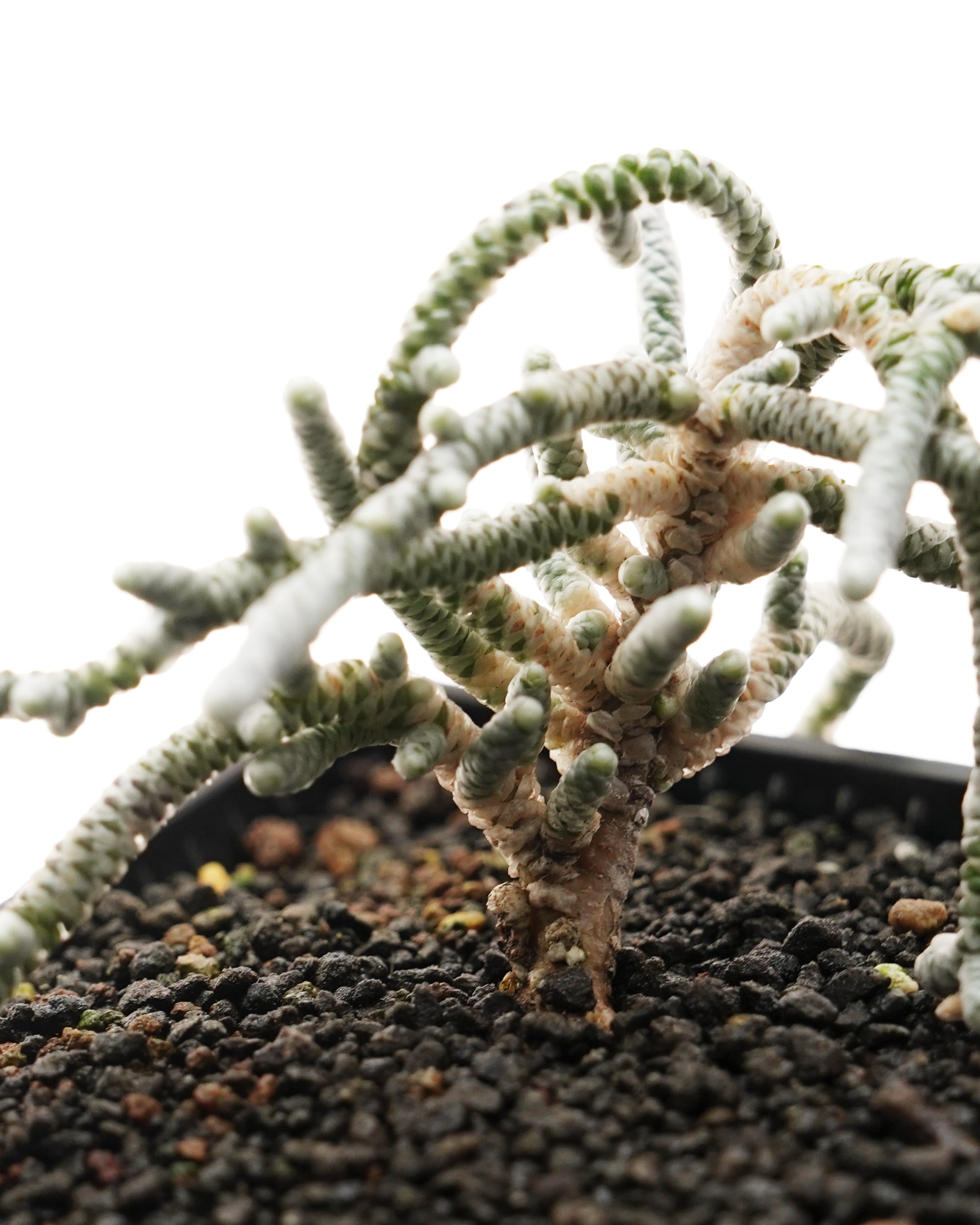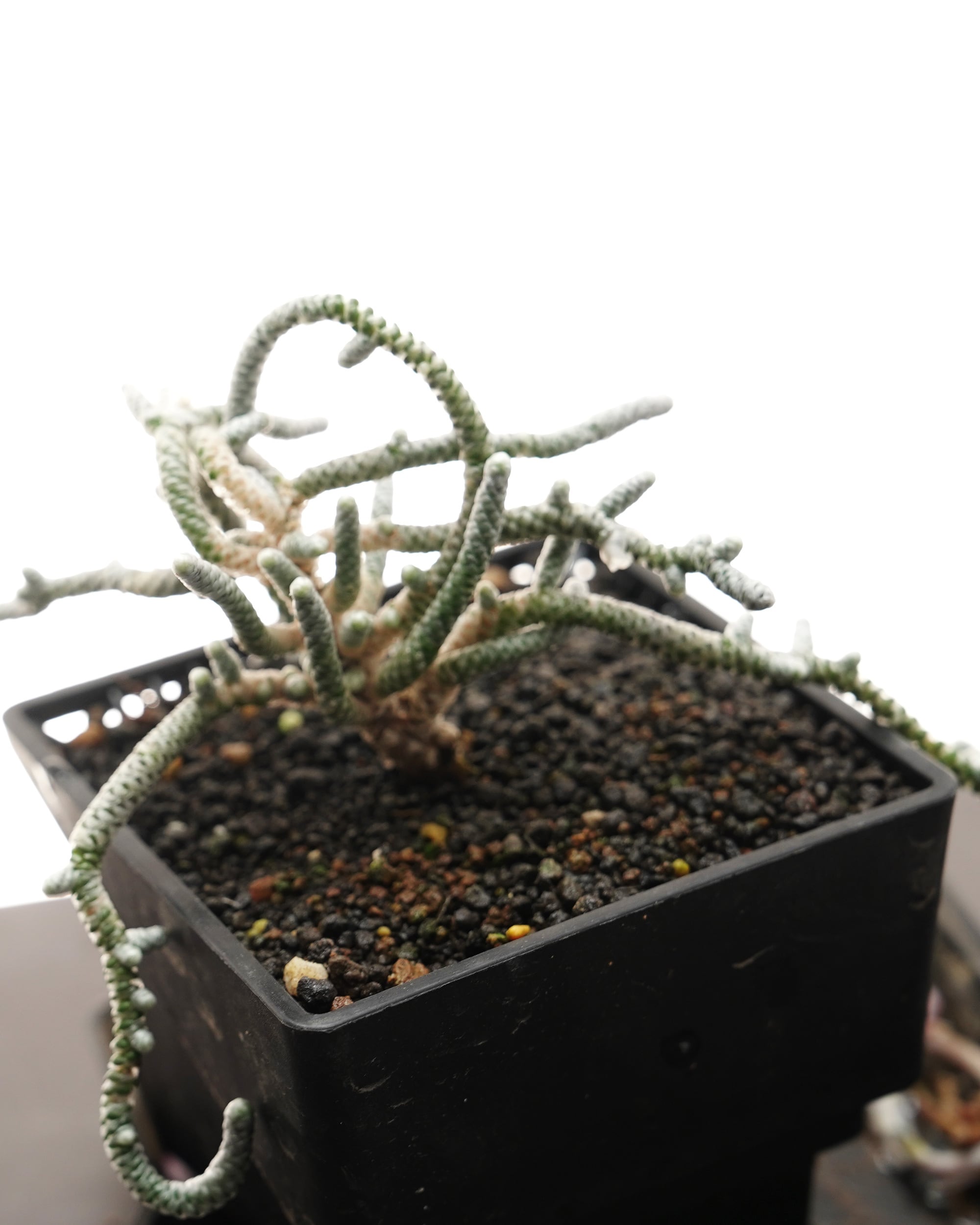 #国内で流通しているパピラケアの多くは枝挿しだと思います(ムーミンの「ニョロニョロ」のような太めの枝がいきなり用土から生えている)が、こちらは実生と思われます。細いと言われるコーデックスがどう発達するか、その違いを観察しても面白いかもしれません。