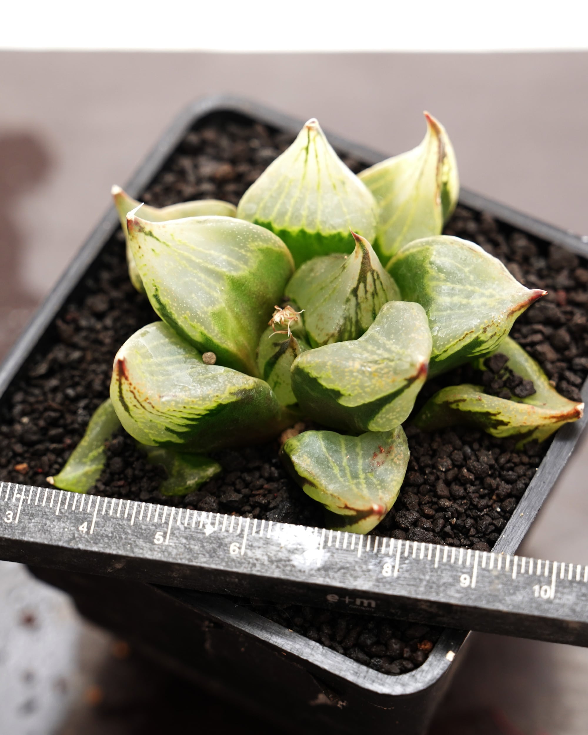 ダークトーンのボディは極太に膨らんで、裏側にもある大きな窓をいっぱいに掲げる、とてもパワーあふれるハオルチア。コンプトニアーナ H. comptoniana のミュータント(枝変わり変異種)とのこと。当初「A型コンプト」「B型コンプト」「C型コンプト」というタイプがあって、そのB型から派生した名残で今も「B型コンプト ミュータント」の名前で流通していることがあります。厳密に言うと「B型コンプト大型ミュータント」というタイプ違いもあるけど市場では区別されていない予感。