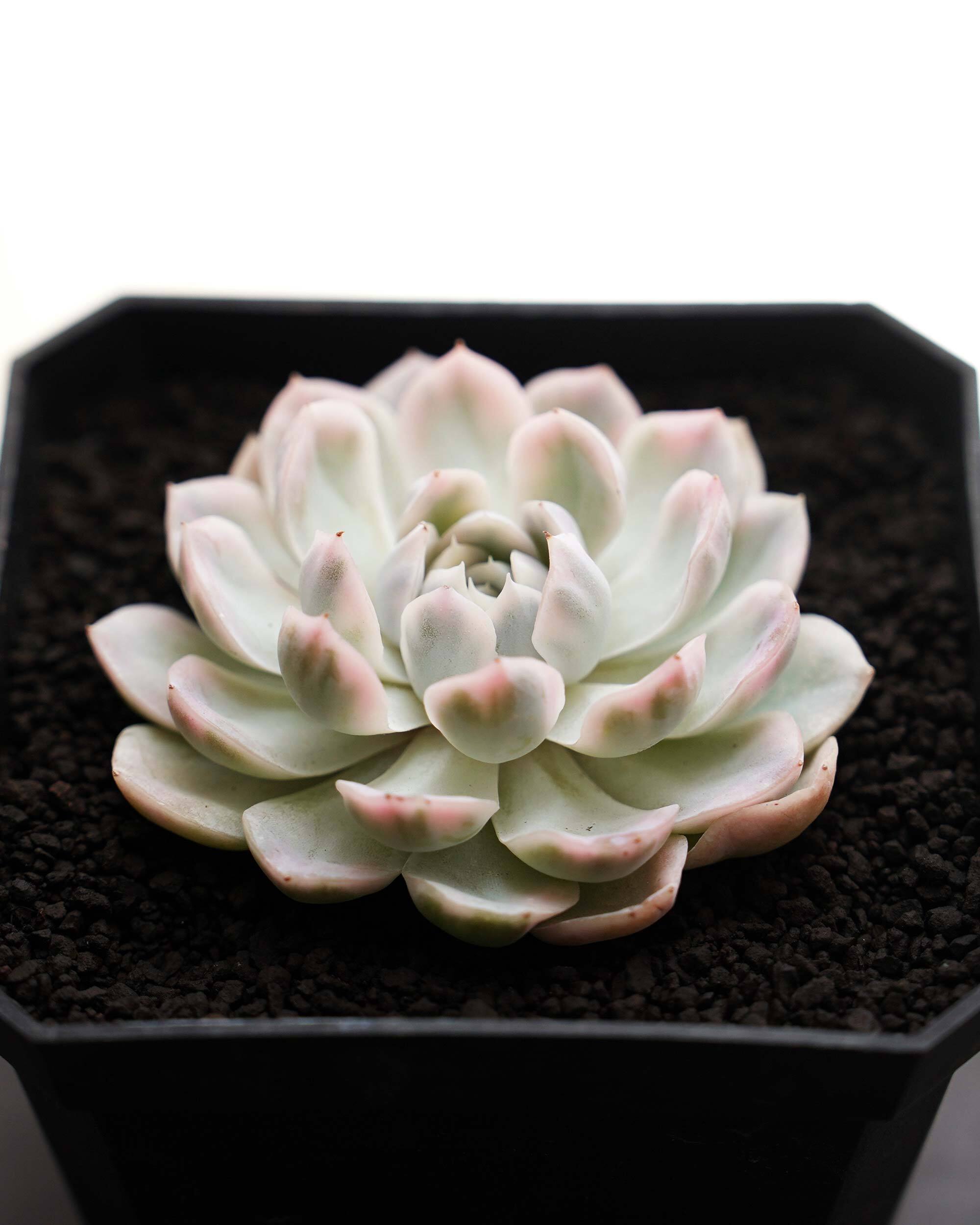 またまた上品で美しい斑入りタイプが登場です。コロンとまんまるな葉っぱをランダムストライプな覆輪斑で着飾り、可愛い中に幻想的で浮遊感のある、まるで妖精さんのようなエケベリア。カタチからすると「ミニマ錦 E. minima f.variegata」に似ているけどあちらは黄色みが強くカジュアルな印象。色柄で言うと「インブリカータ錦 E. 'Imbricata Variegated'」に似ているけどフォルムのかわいさが段違い。全体的に「モンロー錦 E. 'Monroe Variegated'」がかなり近いけど、葉先の透明感とそれが強調するランダムエッジの質感が一枚上手。2025年の顔になっていただきたいところです。由来は未明ですがメキシカン「スノーボール」 E. 'Mexcan Snowball' の錦、つまりエレガンスの錦(E. elegans f.variegta)じゃないかと思っているけどどうなんでしょうか。エレガンス系の錦といえば「ツインベリー錦 E. 'Twin Berry Variegated'」が先行していてたしかにフォルムは良く似ています。