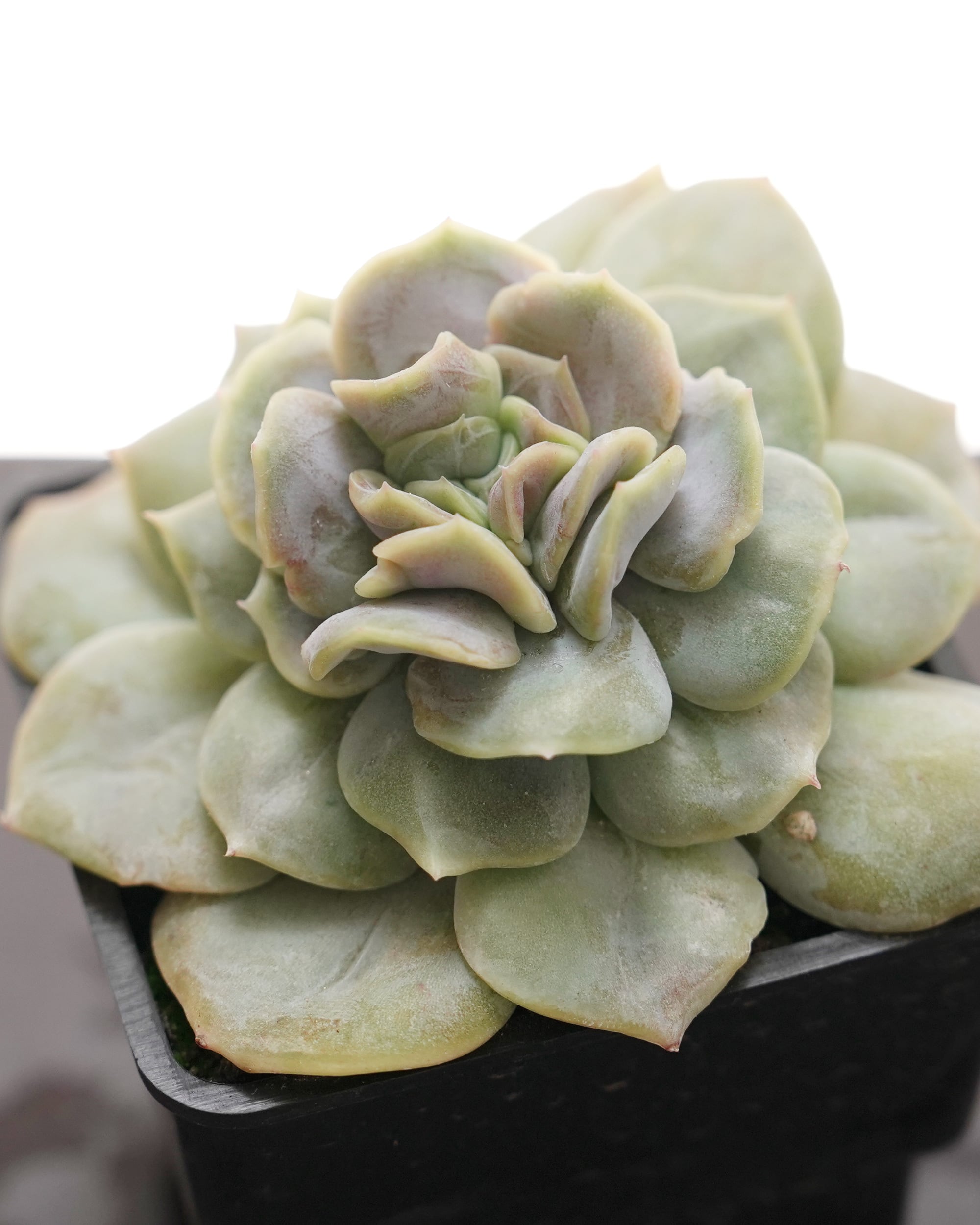 ぱっと見では「グリーンのリラシナ?」なんですが、その葉っぱがうねうねと波打っているのが大きな違い。メイン画像はまだそれが弱いけど、がんばれば「ツナミ E. 'Tsunami'」くらいうねってくれるんじゃないかと期待して見守っているところ。ググった限りでは2025年現在うちにしかない劇レアっコですが、また違う名前で先に流通しているコがいないとは言い切れません。……と思っていたらやっぱり、どうも「ユンヤオ E. 'Yunyao'」は同じものっぽい。