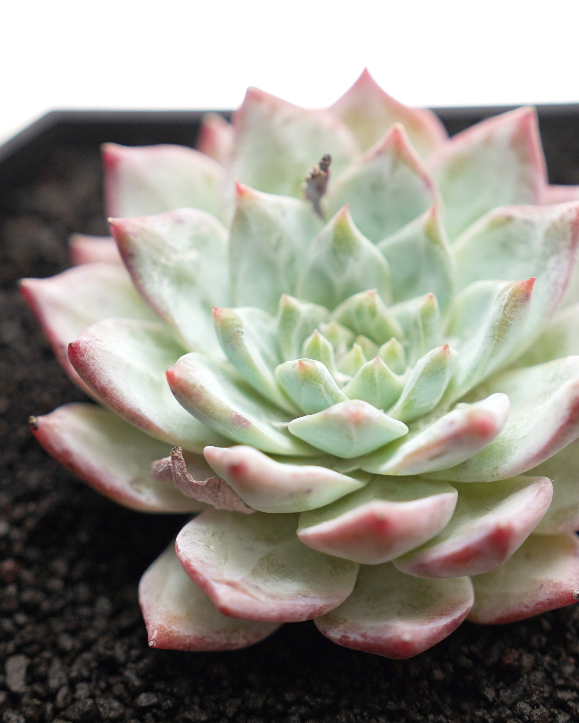 しっかりとパウダーをまとったペールカラーのグラデーションが目を引く、F. Reaineltさん作出のハイブリッド。カンテ E. cante とサブセシリス E. peacockii 'Subsessilis' の交配種というのが通説ですが、羽兼さん曰く「コロラータ✕ピーコッキーのほうが有望」とか(ICNも「カンテちゃうで」と)。やや幹立ちする性質があるのと、葉っぱが垂れ下がりやすいのですが、季節が巡ってくると垂れた葉っぱは枯れて元気なロゼットを開いてくれます。