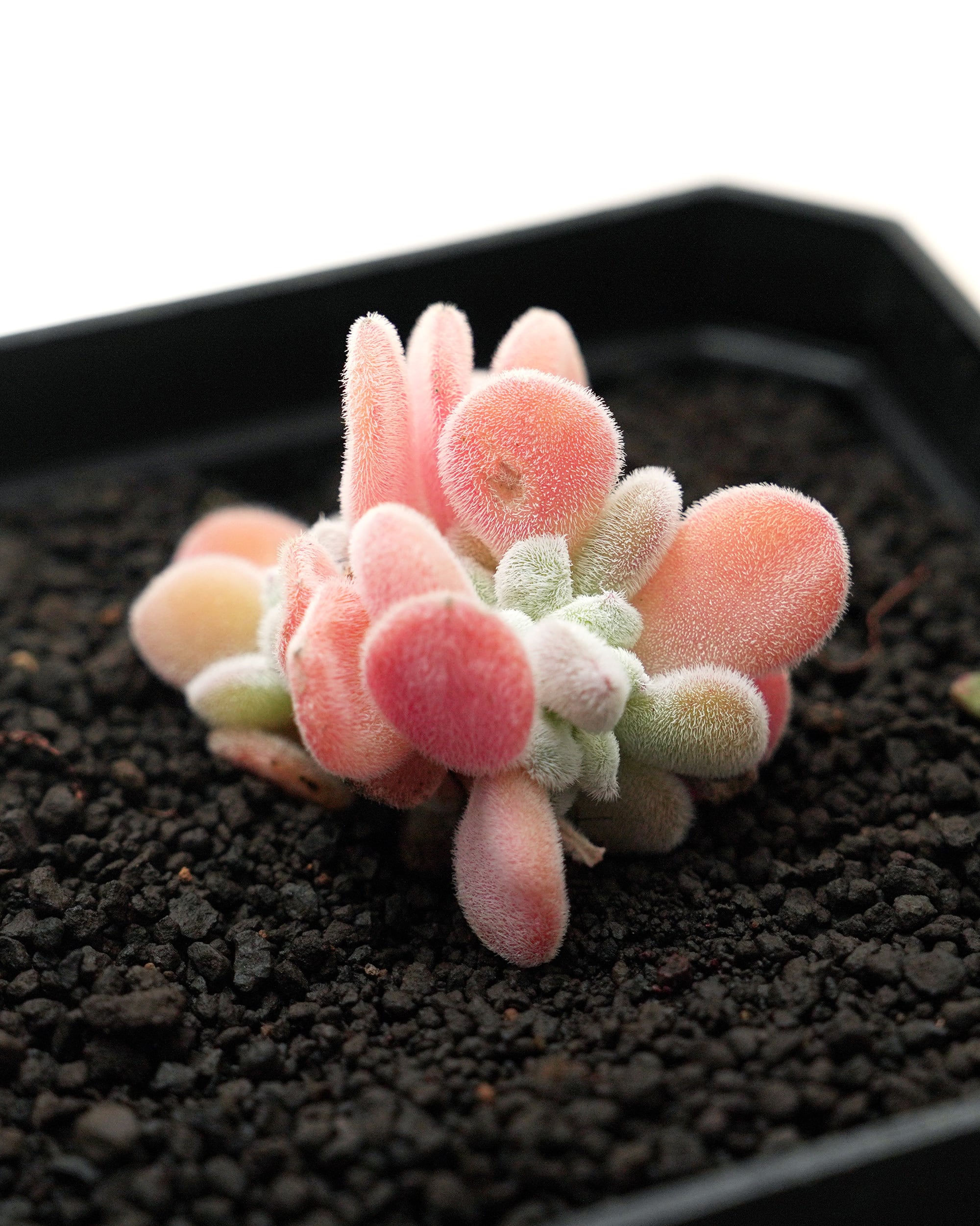 もけもけエケベリア「フロスティ E. 'Frosty'」の綴化品種。5~8mmくらいまで小型化したもけもけの葉っぱが、綴化種らしく帯状にチラチラと連なって展開していく様のかわいらしさといったら。寄せ植えで「パーティション」のように使うと、壁として両脇の苗をしっかりと支えつつ、全体の良いアクセントになってくれます。ただ、成長するとそのままその壁がそそり立っていくので定期的な仕立て直しは必須かも。