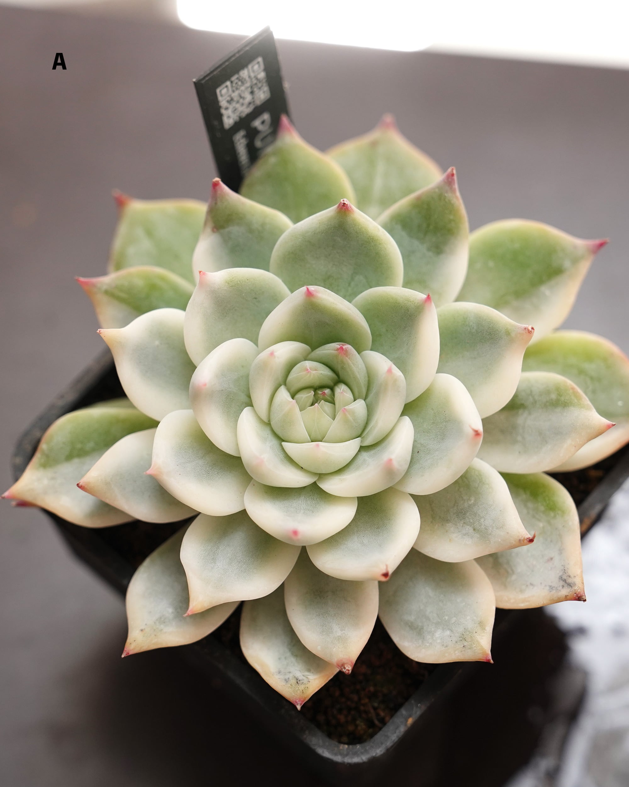 2023年から2025年に入ろうとしている現在でもまだ、レアで羨望の対象になっている「チワワエンシス錦」にはどうも2タイプあるようで、1つは淡いアイボリーの覆輪斑が全体に回っているもの(S. Slightタイプ Echeveria chihuahuaensis 'S. Slight Variegated' )、もう1つはコントラストの強いストライプで模様に偏りが出るもの。こちらはその後者タイプで、「H. Variegated(半覆輪斑)」や「Y. Yang(陰陽)」と呼ばれて流通しています。同じ親からの増殖子株でも模様にはバラツキがあります。おそらく白覆輪タイプから枝変わりしたもの(逆かもしれないけど)。比較的お手頃価格。