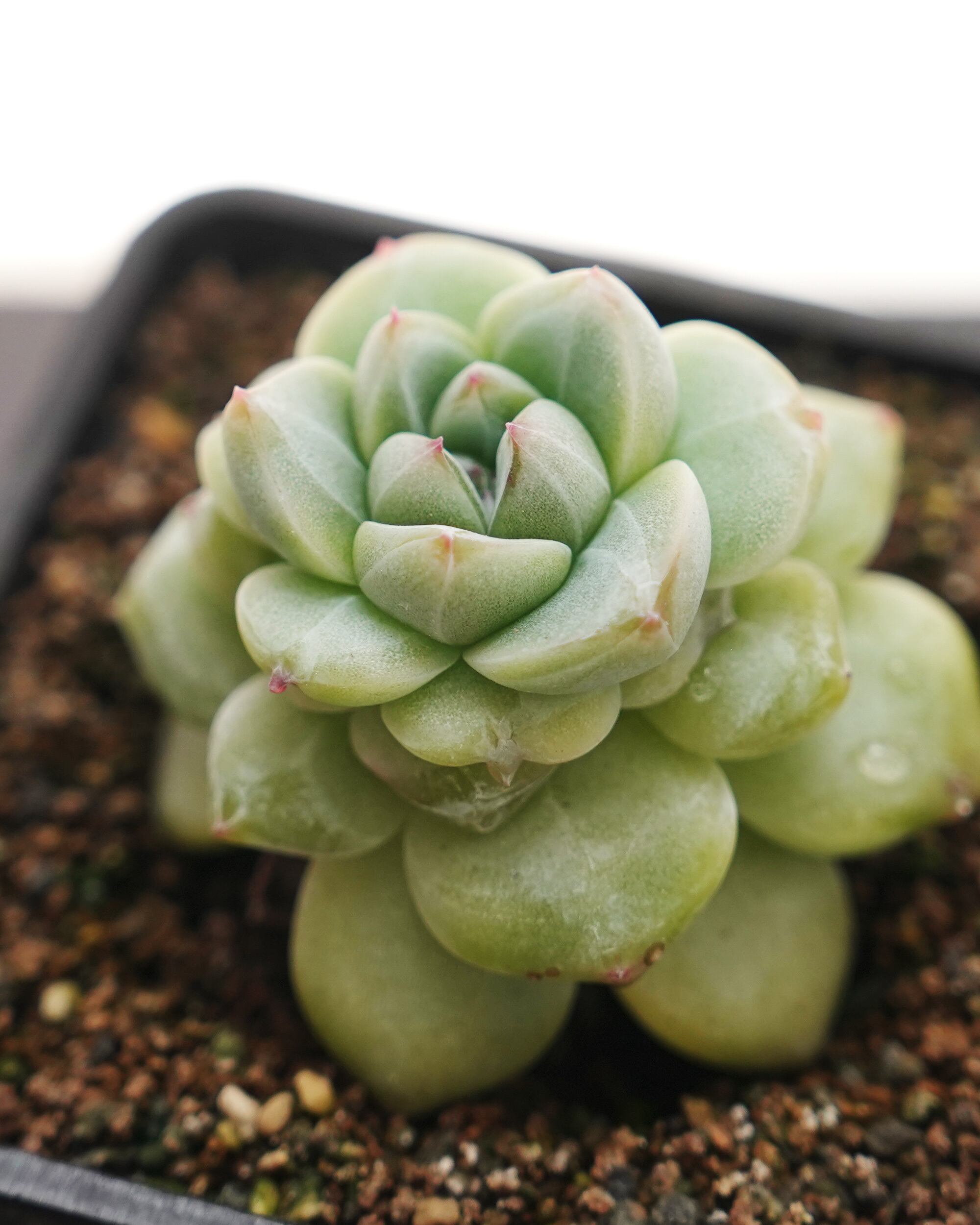 エケベリア史上「最高硬度」というダイヤモンドのようなキャッチコピーを付けたくなる、淡いエメラルドカラーがかわいい宝石エケベリア。ぱっと見では琥珀系に似た透明感のある短い葉っぱが詰まったエケですが、水を吸った時の硬さが半端なく、押してもよじっても微動だにしません。そういう意味では「インス E. 'Ying Su'」の真逆にいるコ。揃えて扱ってみると面白いかも。調子がいいとDETAILのような新葉がでてくるけど、その堅い葉っぱを押しのけるパワーが必要なのでキレイな形の維持は難しいみたい。「Fortitude」は「不屈の精神/毅然とした」と言った意味の英単語であって『怪獣8号』ではないと思います。