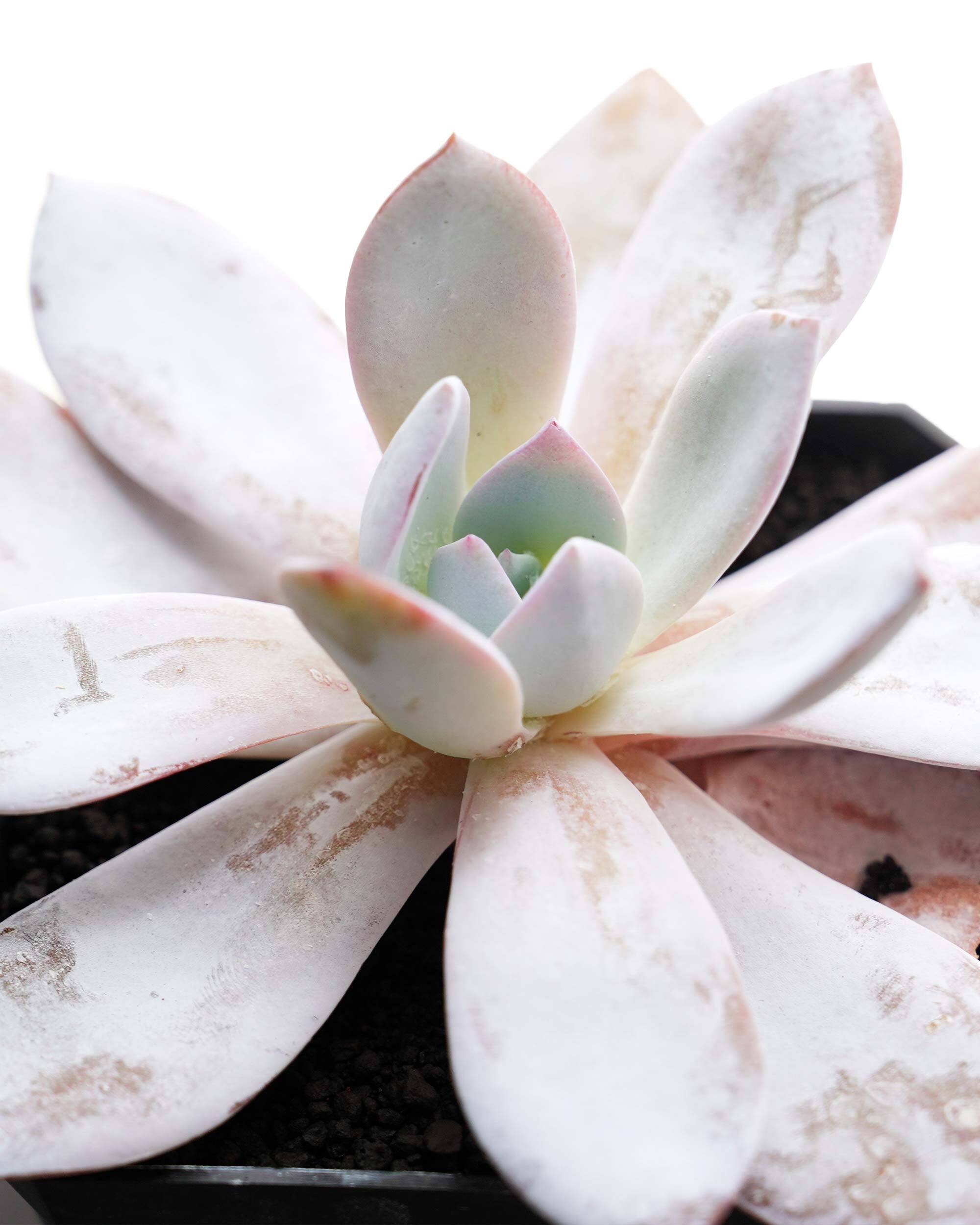 葉先が先がシュッと細くなるユリのように優雅なフォルムを描きながらもホワイトパウダーと肉厚の葉っぱが多肉らしくも美しい、エケベリアの女王の愛娘という王家の血筋らしい気品。カンテ E. cante とラウイ E. laui のハイブリッド。韓国 エアマジックナーサリー産(C. Chang-jo & A. Air-magic nursery, K. Korea)。白鳳 E. 'Hakuhou' に似ているけど、こちらのほうが小ぶりで細身で赤みを帯びたカラリング、何よりホワイトパウダーの厚みからくる白い輝きは別格です。