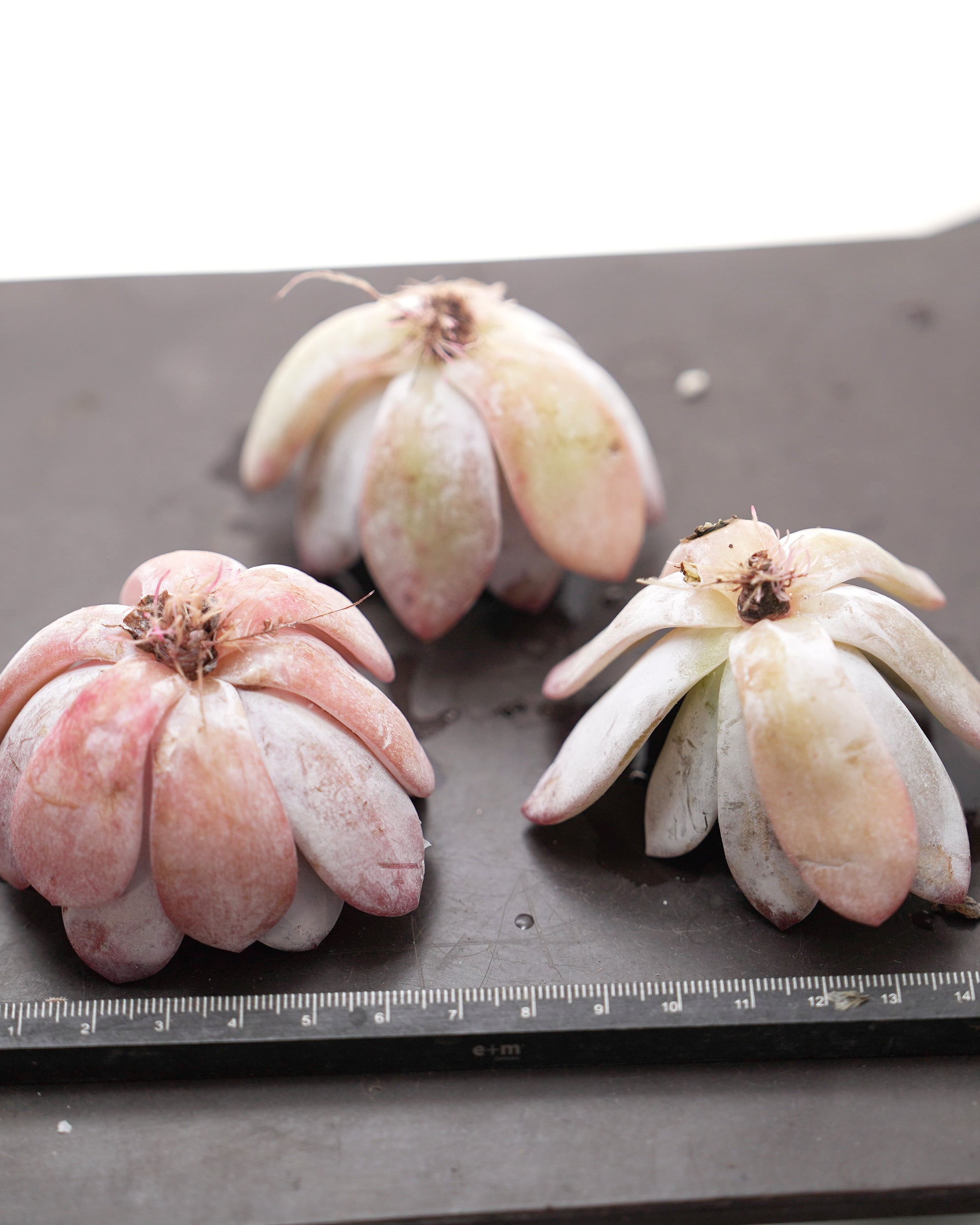 まんまるなフォルムは白いワックスで厚く覆われていて、とにかく白い。全多肉の中で別格の、トップクラスの白さです。ワックスが厚いから光に強く、逆に強い光がないときれいに育ちません。カット苗は発根しにくくてやや難モノ。そのエケベリアらしくないフォルムから想像しやすいだけでなく花の特徴が似ているのでパキフィツムに血縁が近いんじゃないかと勝手に思っています。「ラウイ」という名は、ドイツ出身の植物学者アルフレッド・ラウ氏に因んでいて、他の属にも同じ名前のコが多くいます。