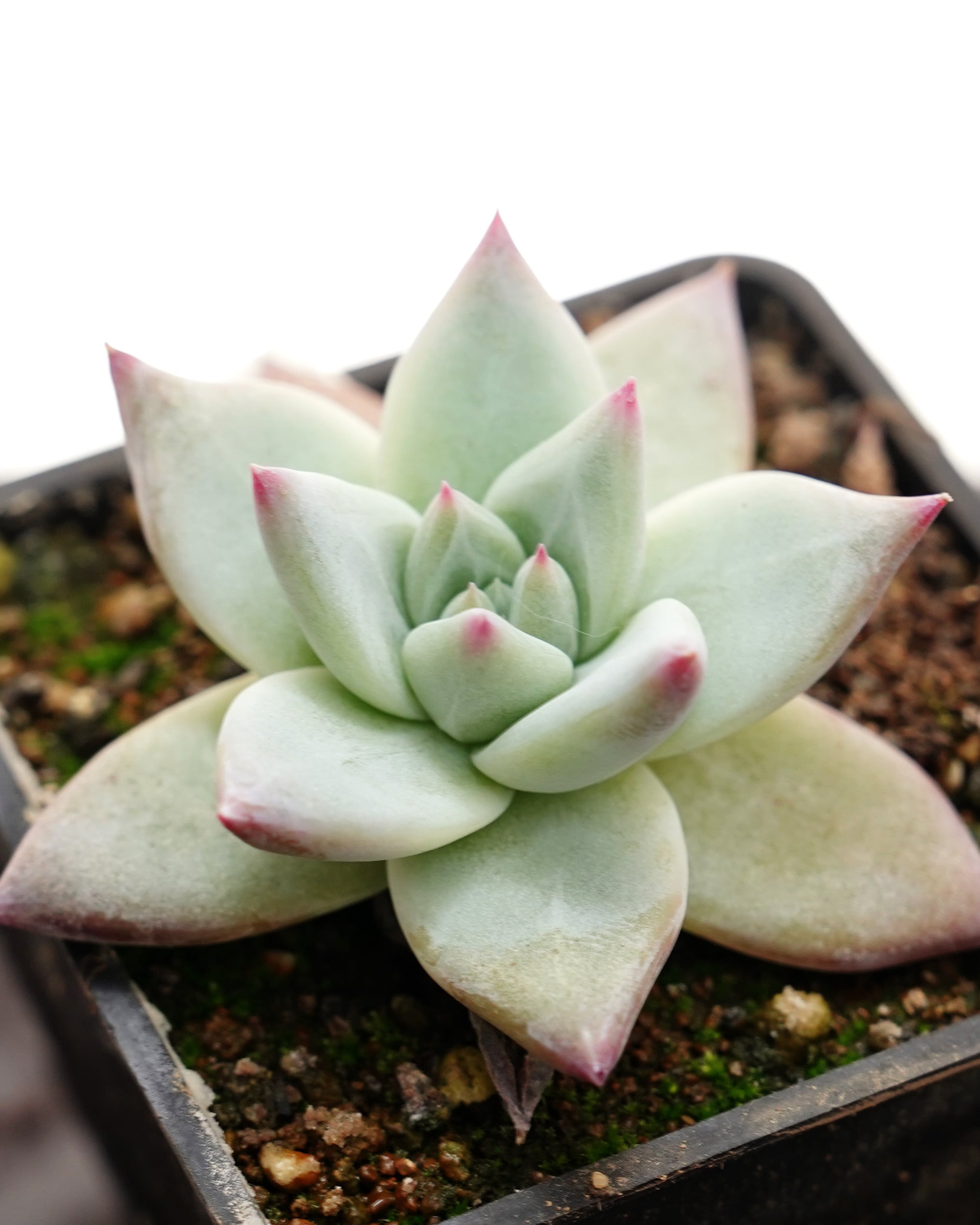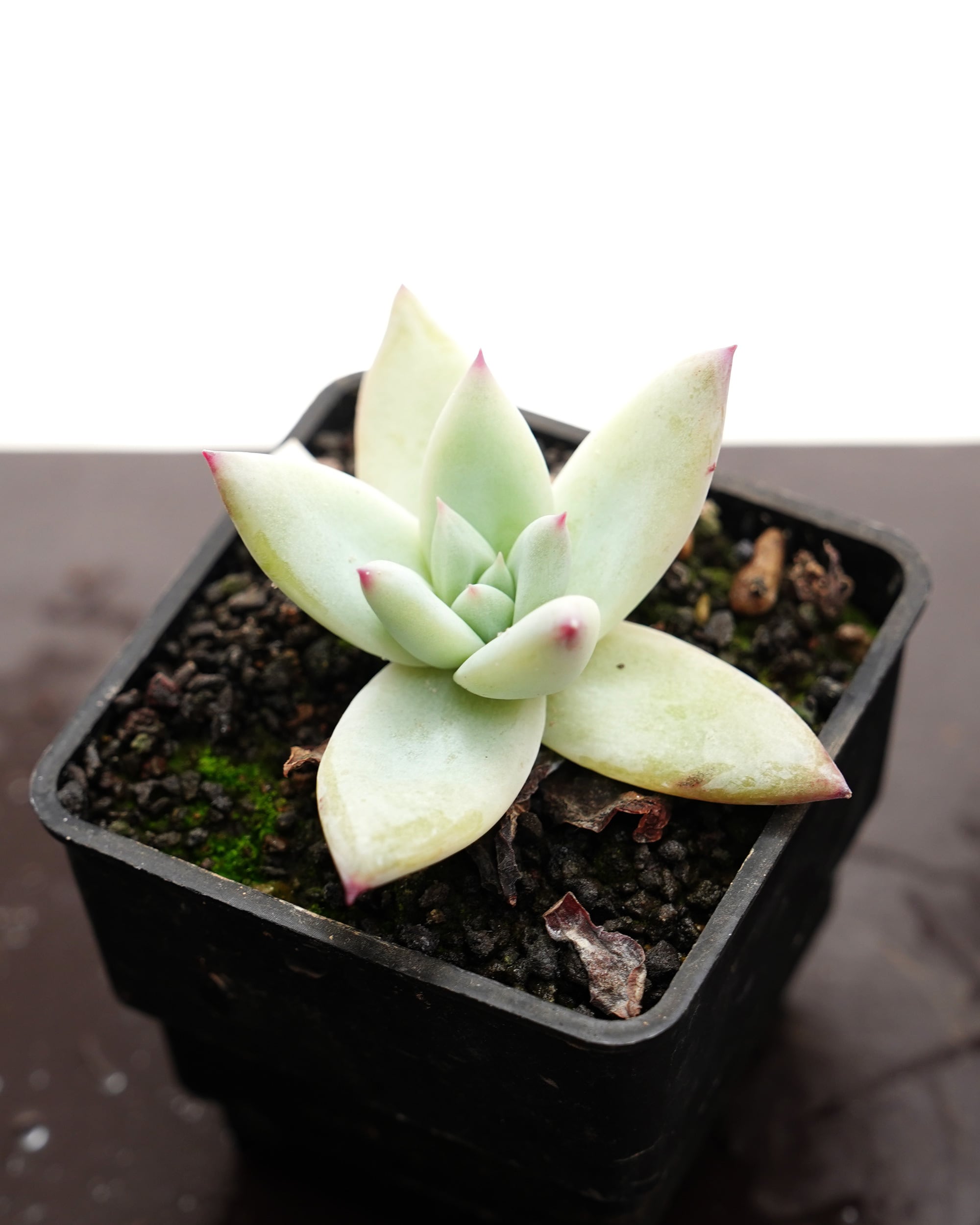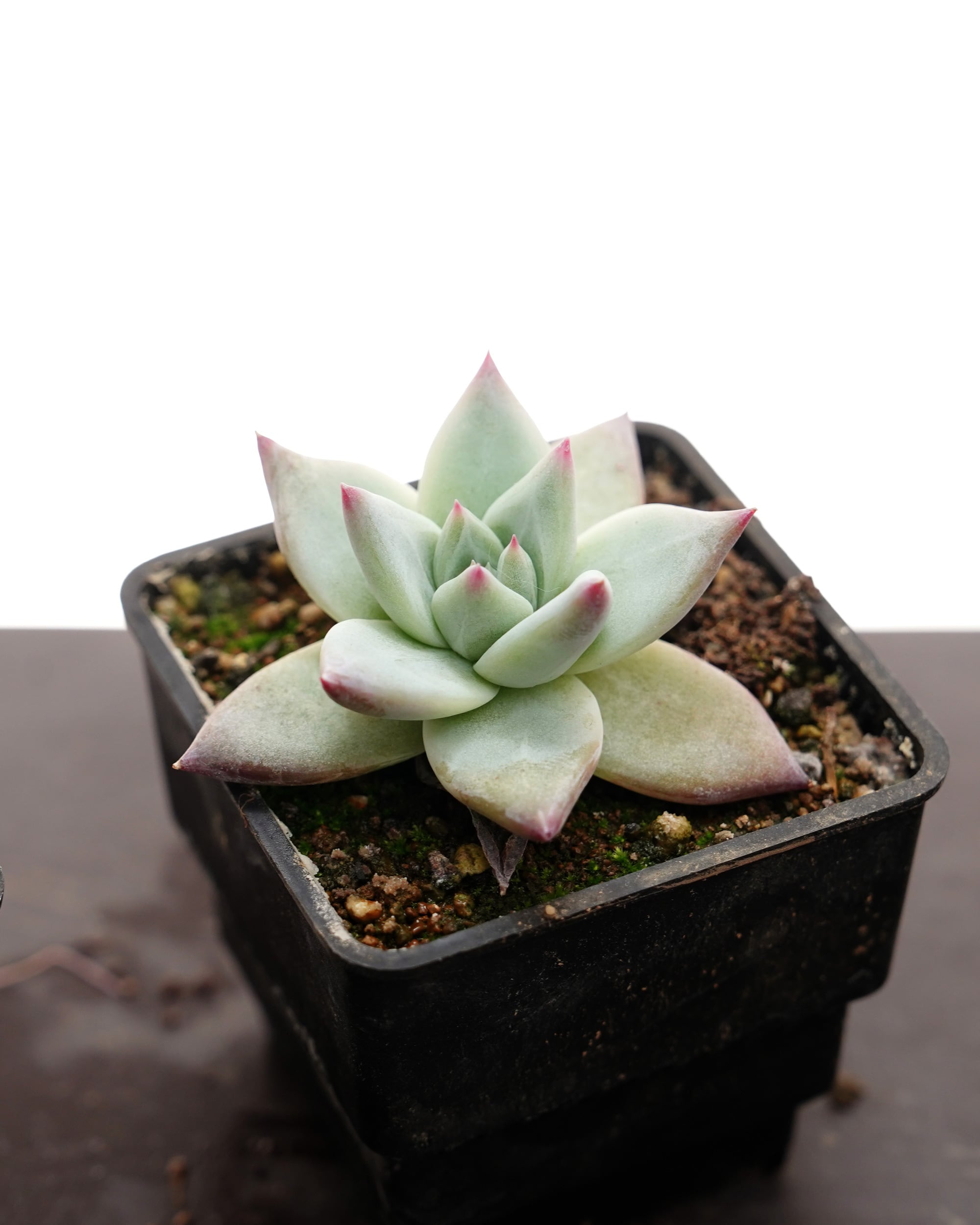西澤です。 これぞエケベリア・タパルパ、といった風貌。長期の養生を経て古い葉が落ち、ムチムチでピカピカな質感の葉に入れ替わりました。白く輝く太い葉にはコロラータの真骨頂が感じられます。まだサイズが小さめで根の回りも十分ではありませんが、鉢上げしてあげると、ここからぐんと成長してくれるはず。つまり抜き苗で発送するにはベストなタイミングですね。ぜひ挑戦してみてください♪