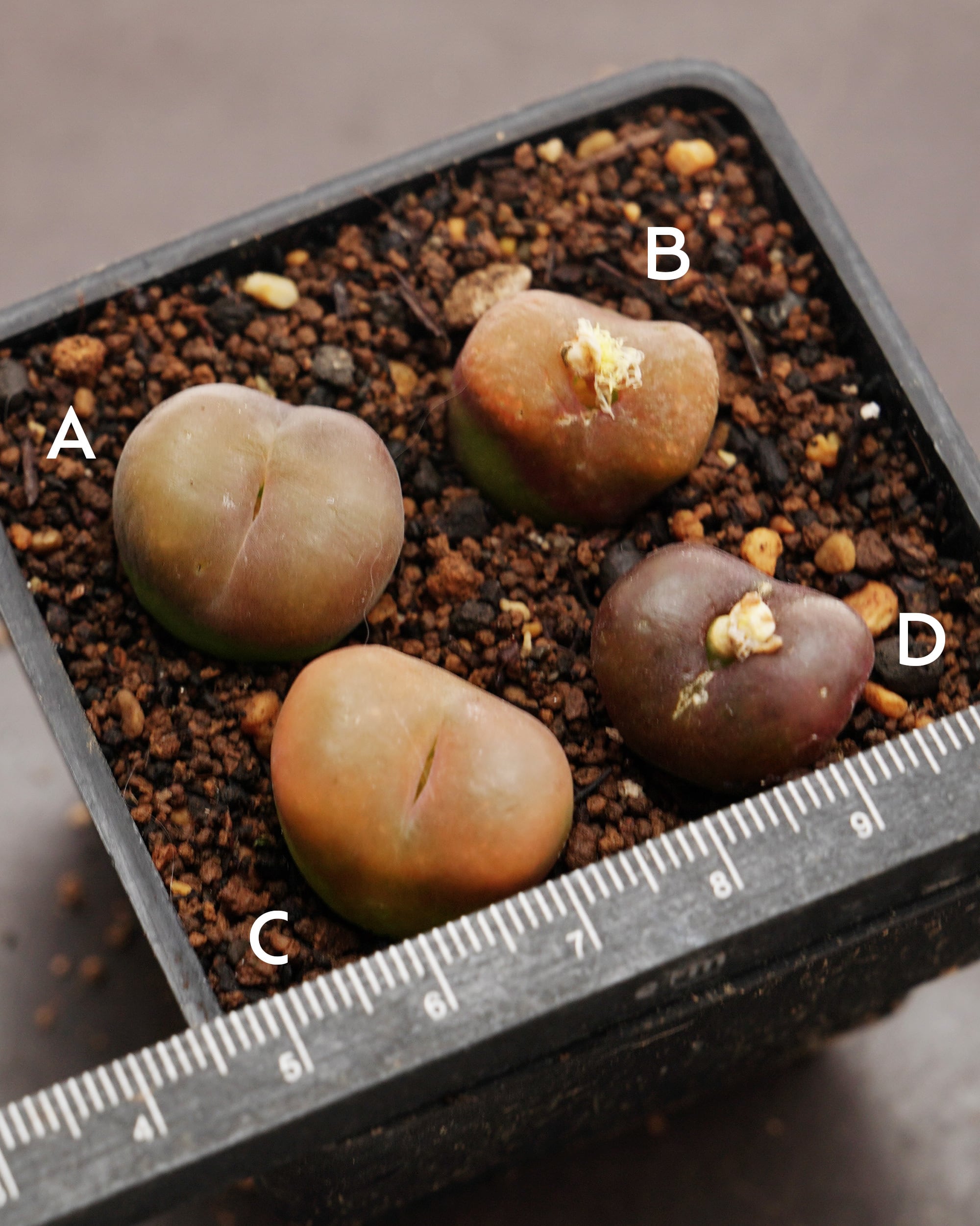 基本的に少し根が出た「微発根」苗をお送りする予定です。ただ、根がない場合でも、リト・コノ系メセンはこの時期、植えて水をやると1週間で発根します。時期的にはベストシーズンかと思いますのでぜひ挑戦してみてください。