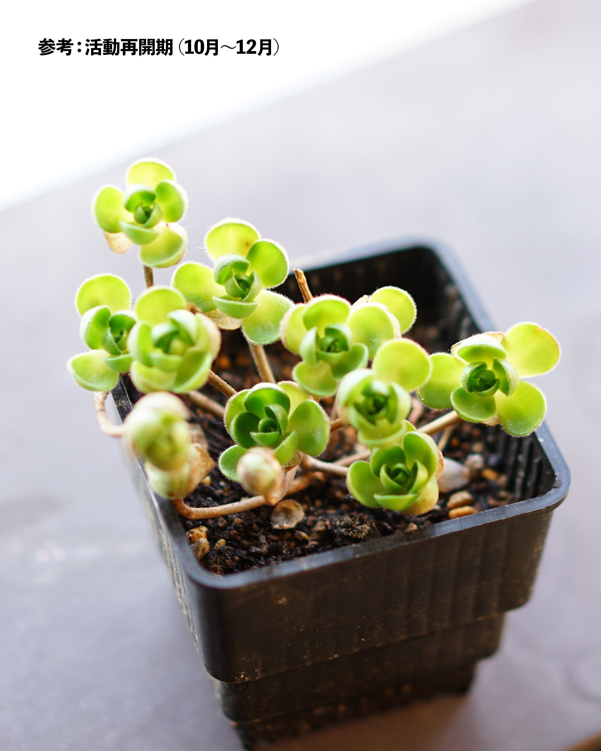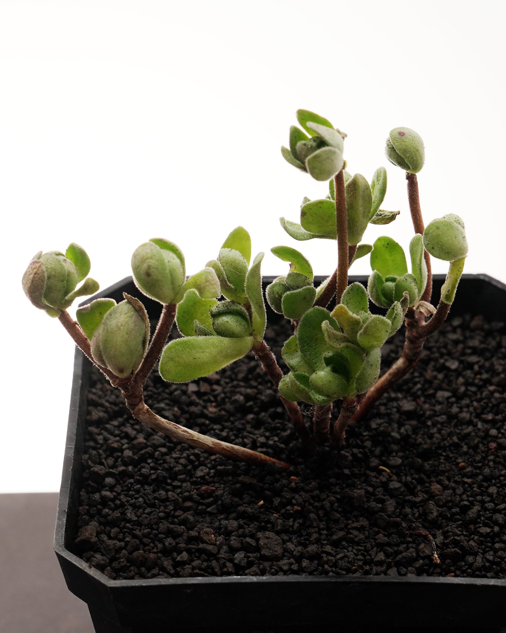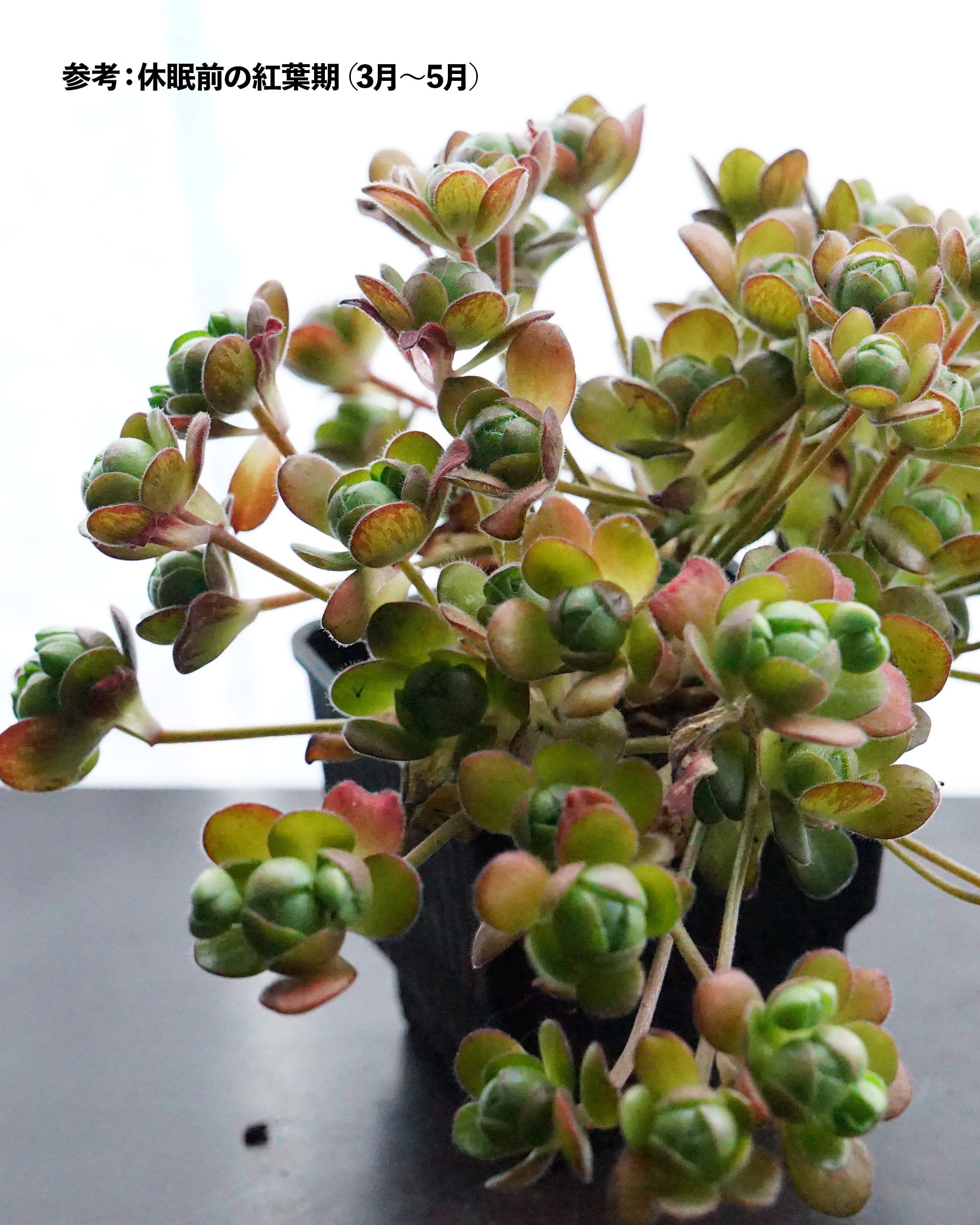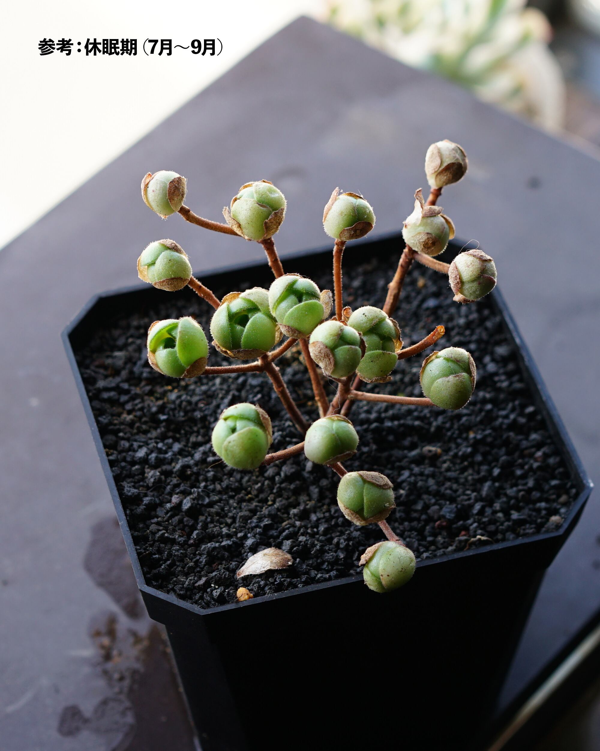 人気のたまころアエオニウム、サンデルシー。アドニスとも言います。ちょうど休眠から覚めるところで、たまころ→ご開帳の形態変化が楽しめるはず。未発根苗でも、根もとを見ずに浸しておくと1~2週間で発根します。ぜひ挑戦してみてください。
