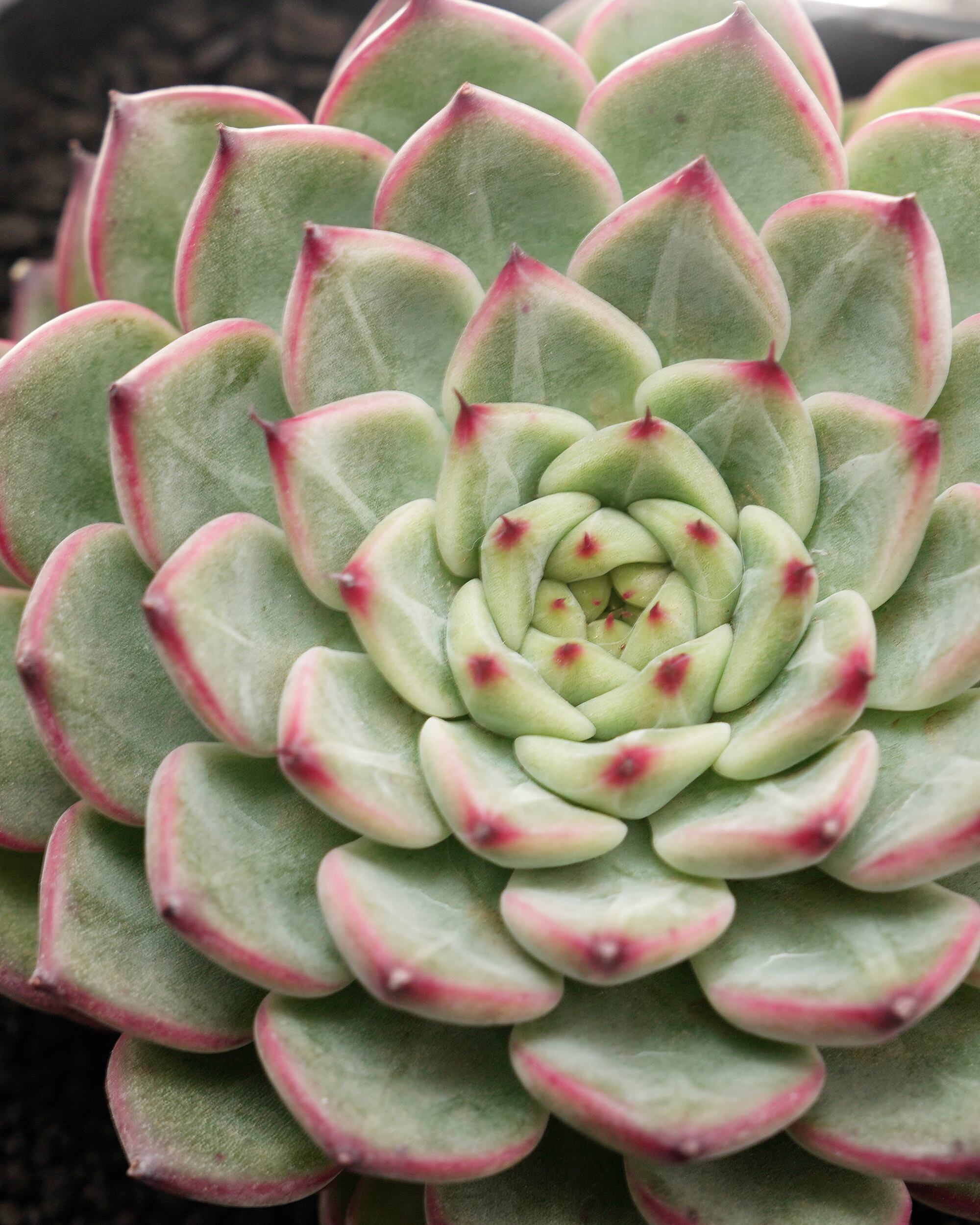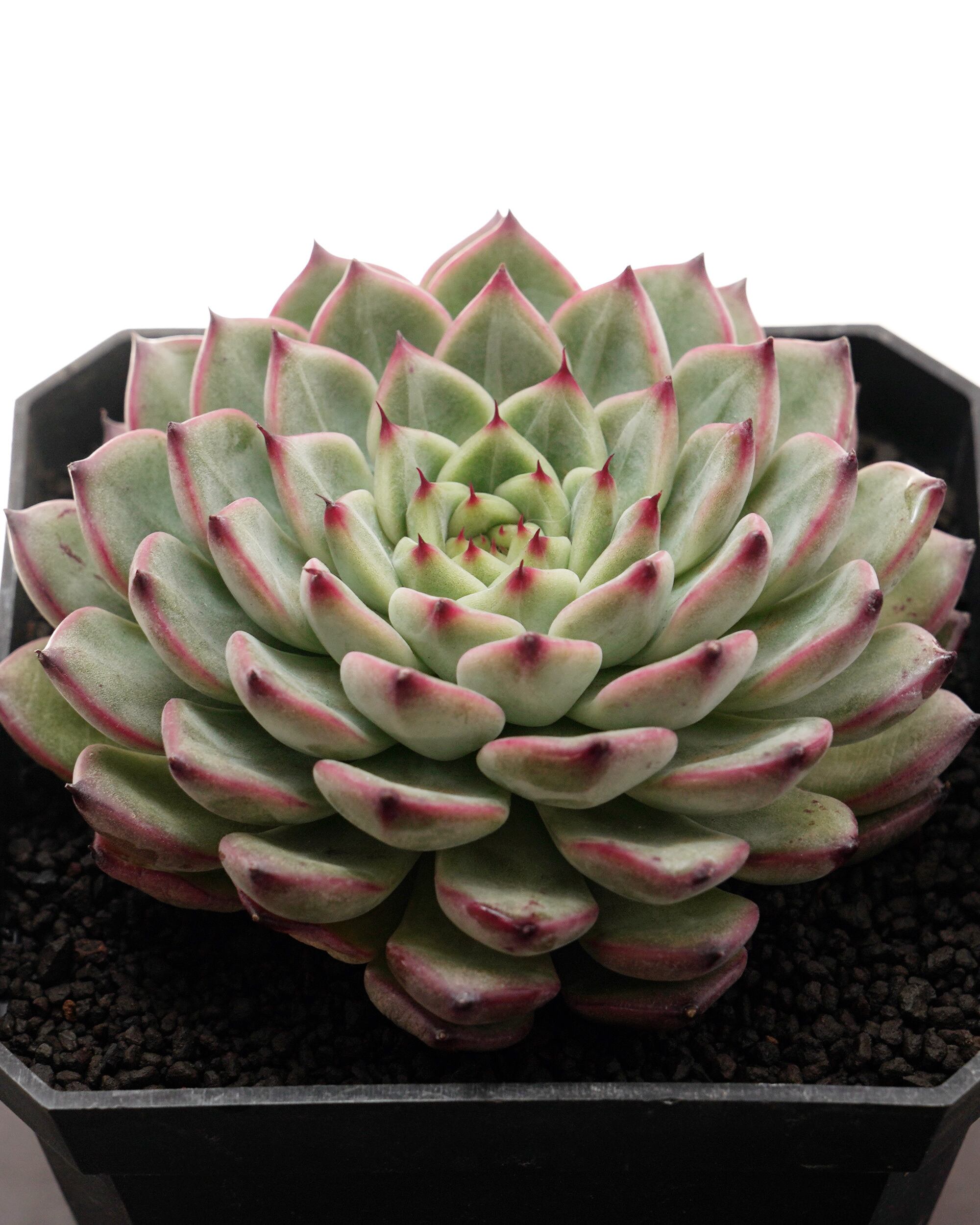 パッと見は「桃太郎 E. 'Momotaro'」に似ているんだけど、葉っぱがより細く密になって、赤いツンツンの爪がより強調されたビジュアルに。幼い頃は「シャンペーン E. 'Champagne'」のようにウォーターマークがでたり黄色からオレンジのグラデーションカラーがでたりするのが新しい雰囲気。「トスカネリ E. 'Toscanelli'」にも似ています。名前が短く一般的すぎるので何かの伝言ゲームの可能性もあるけど一般的すぎて調べきれない……。
