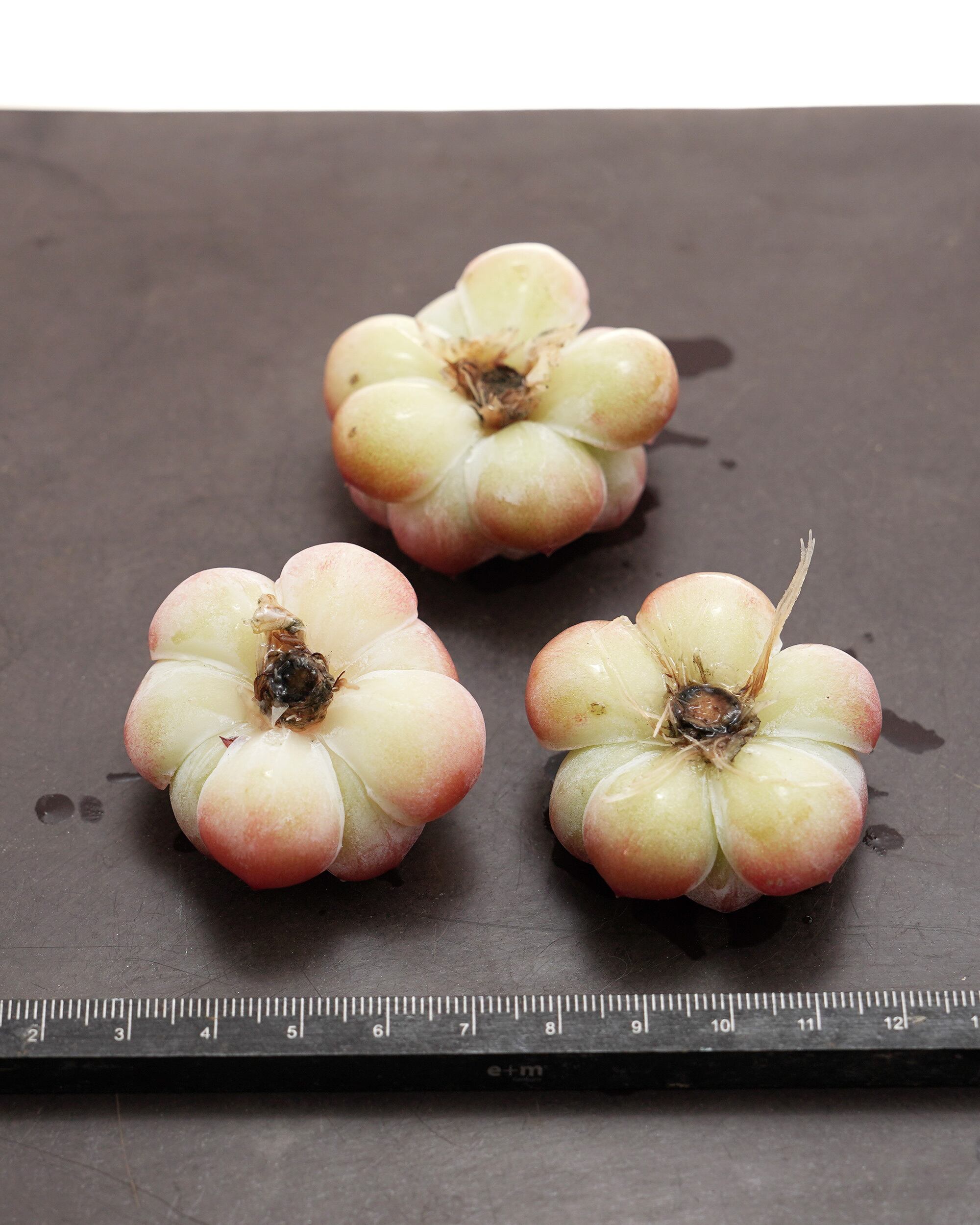 透明感のあるボディ、厚いホワイトパウダー、朱色から鮮やかなカーマインレッドという独特のカラー、くっきりと描かれるファセットラインが美しいニューフェイス。「琥珀 E. 'Kohaku'」に似ているというかこういうのを最近「琥珀系」と呼ぼうかと思っているところ。
