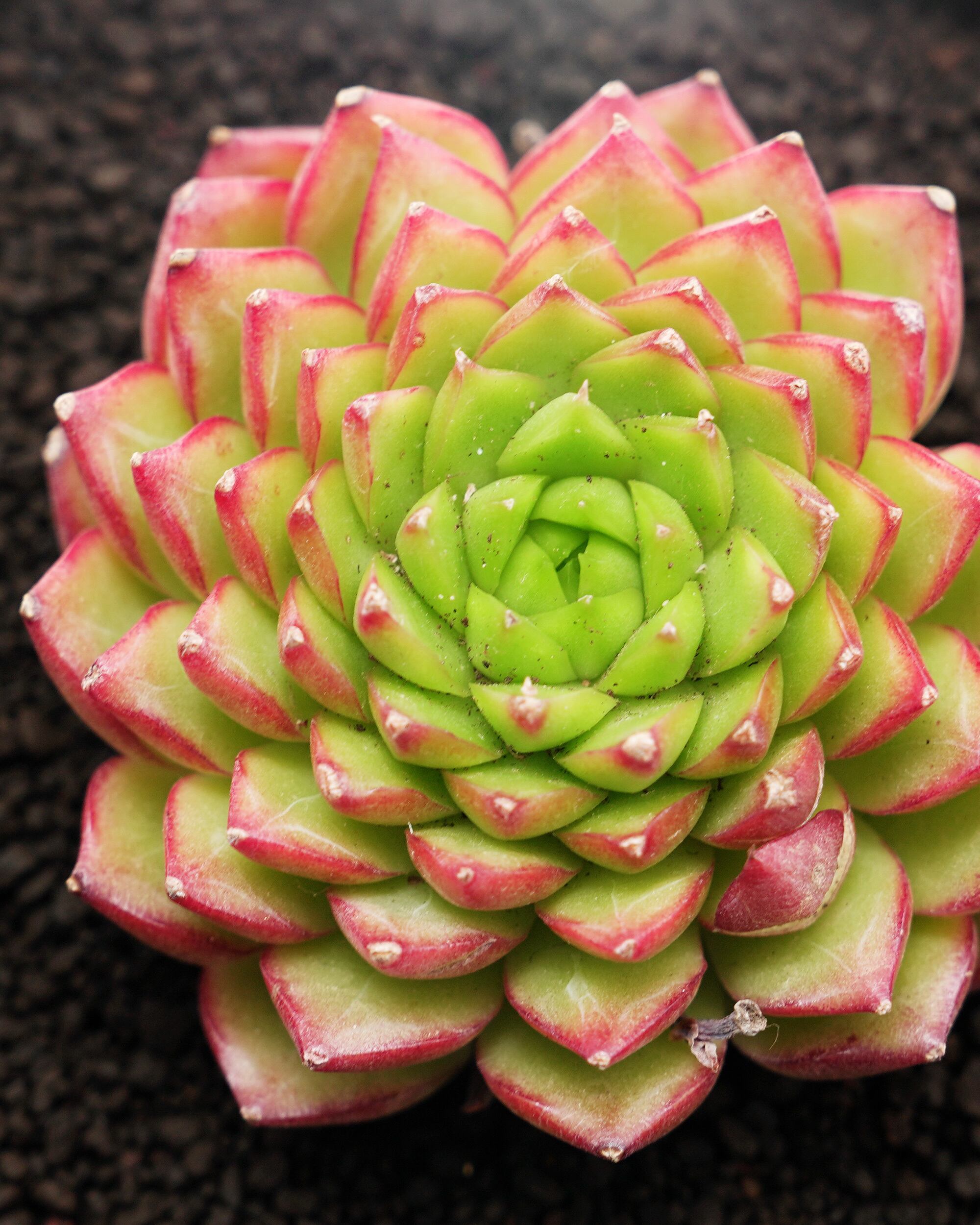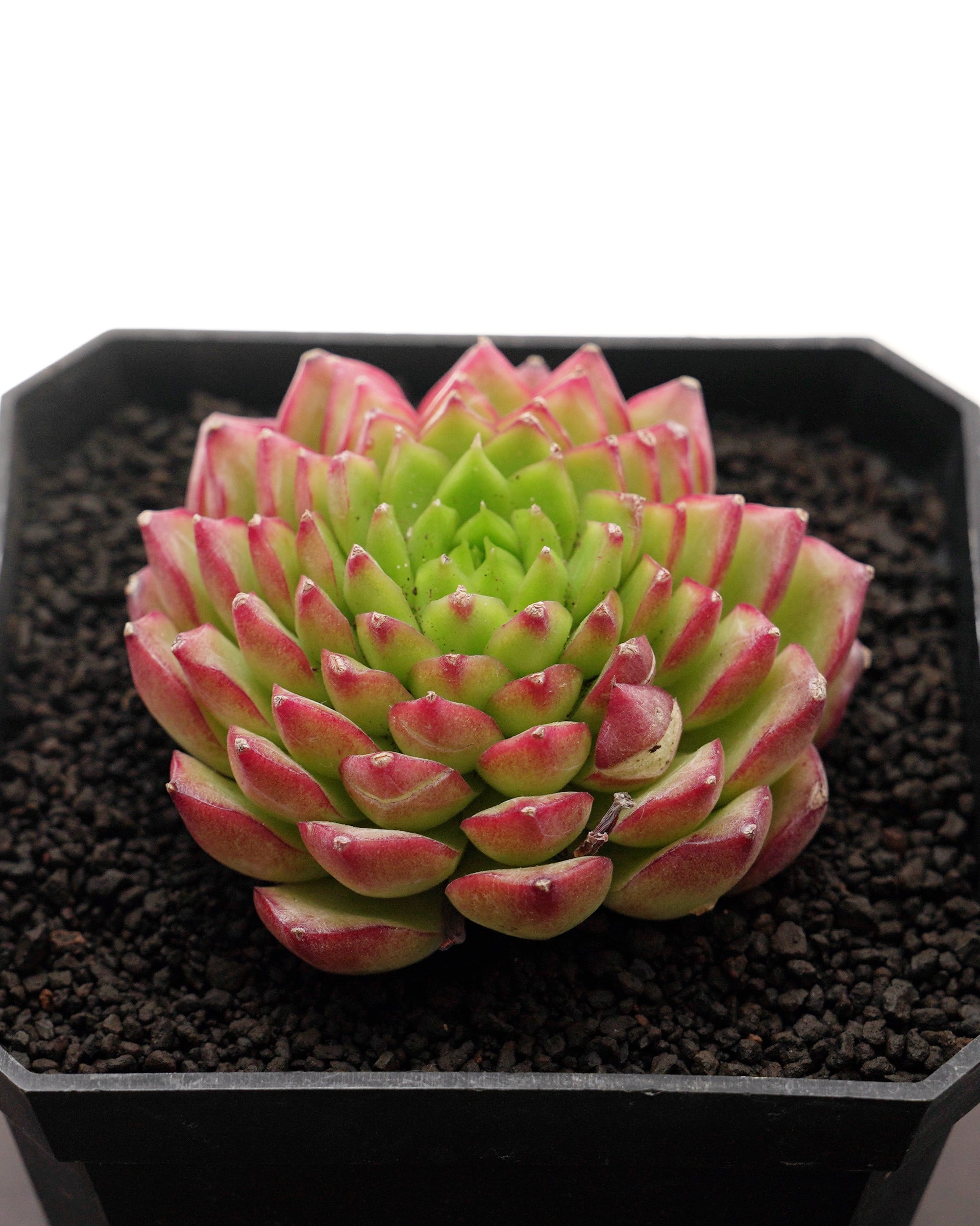 ツヤ感のあるグリーンとレッドエッジからはアガボイデス系を匂わすけど、その葉っぱの密度が圧倒的!短い葉っぱをこれでもかっ!と言わんばかりに身にまとい、葉っぱが展開する周期が周回ごとにあまり変わらず同じところに出てくるのでますますその「ギザギザ感」が強調されて、元気でやんちゃなフォルムに。2025年に韓国のナーセリーさんから限定リリースされたニューフェイス。あいにくツメが折れちゃっている株しか入手できていないので、今後の新葉が揃ってツメがツンツンする姿に期待しているところ。同時期にリリースされた「キャドバリー E. 'Cadbury'」と合わせてギザギザブラザーズとして揃えてみたいものです。