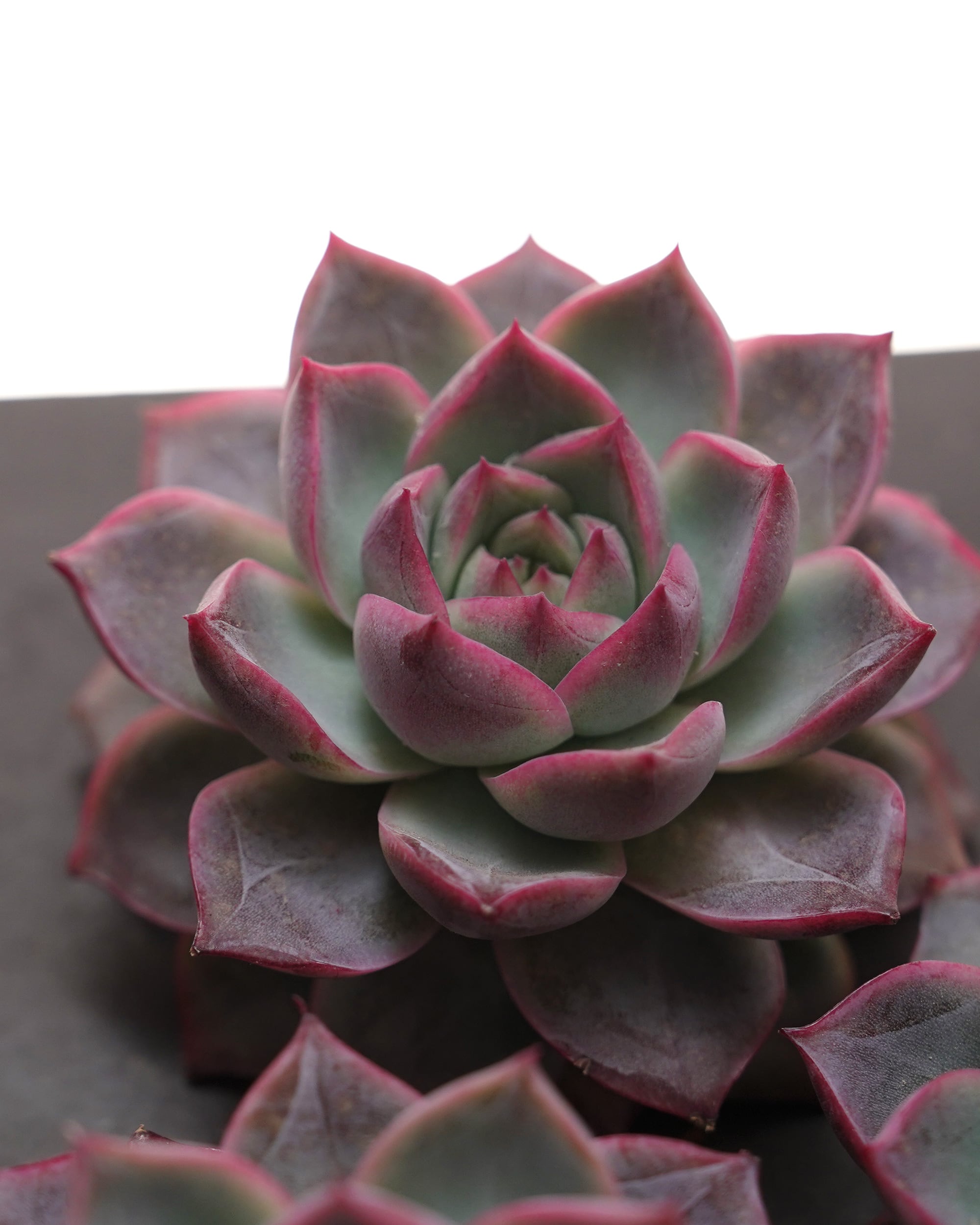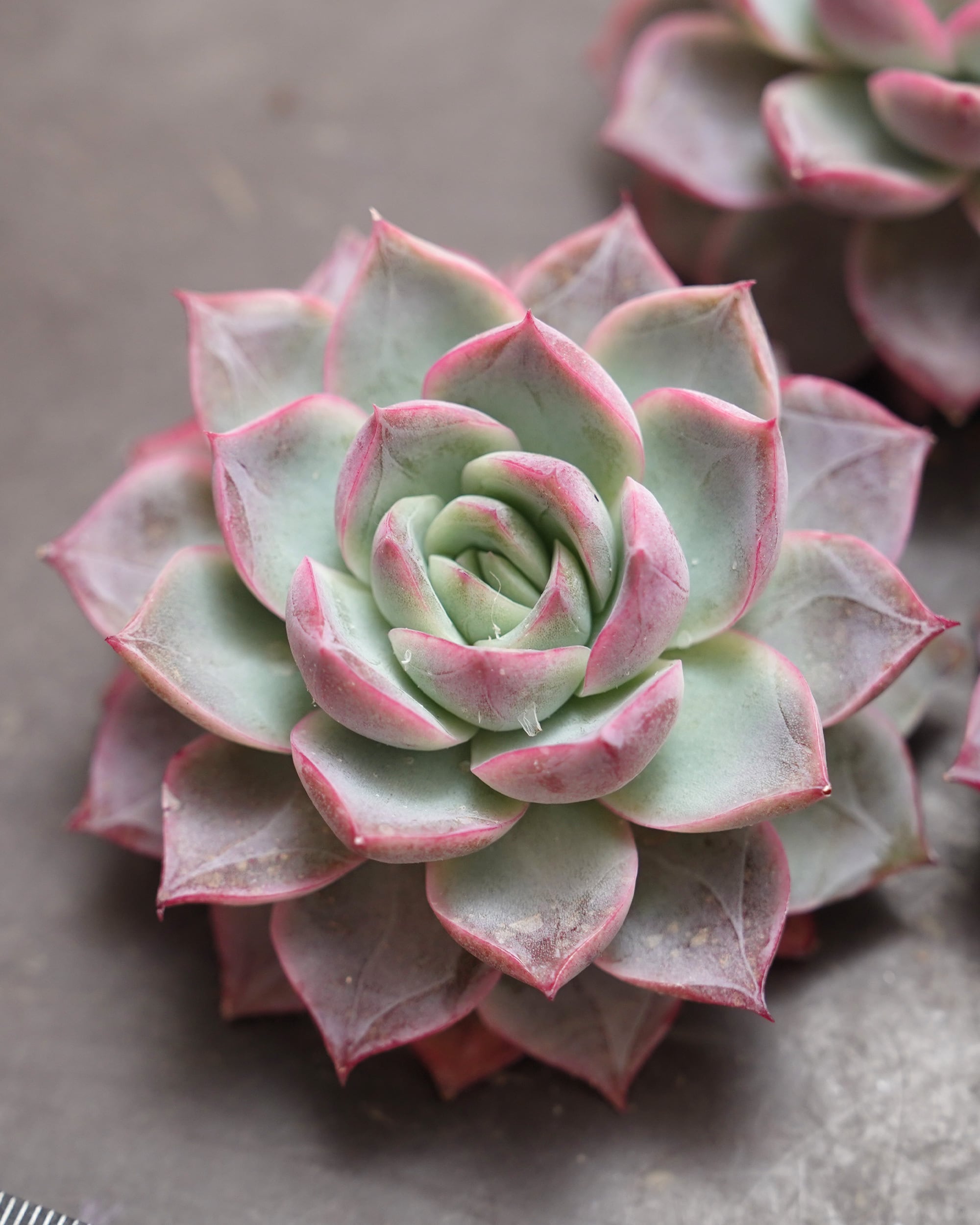 一見するとまた花うらら系かなと思わされるところですが、短い葉先がつんと尖ったファオルムと、キュッと引き締まったロゼット、それに厚いホワイトパウダーが作る内側のファセットラインが美しく、いい環境できちんと作り込んだらむちゃくちゃ美しくなるかもしれないと期待しちゃいます。「キャラリアン E. 'Keralean'」「白雪姫 E. 'Sirayukihime'」あたりに似ているけど、そのホワイトパウダーとファセットラインが一線を画してくれるかも。「シルエット E. 'Silhouette'」...も似た画像は見つけるけど完成した姿はだいぶタイプが異なります。おそらく2025年、韓国生まれ。ぐぐるとドット模様の入った形の崩れたコもでてきますがおそらく名前被りの別種。