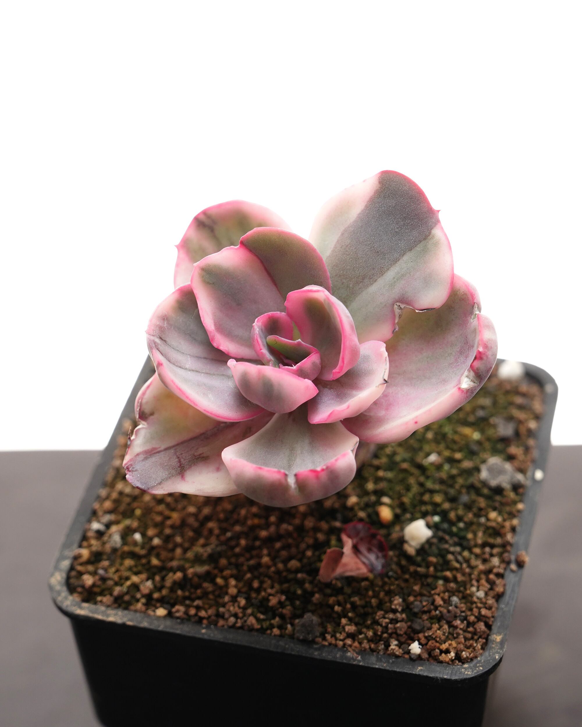 くるんとスプーンのように先を丸める、見るからに繊細な葉っぱは見た目通り繊細で、水切れに弱く、贅沢な環境においても成長が遅くてなかなか本調子が見れない。名前からすると「ブルーローズ E. 'Blue Rose'」の斑入りタイプなんだけど全然その面影がない。……という特徴やその姿からして「バークリーライト E. 'Berkeley Light'」にそっくりなので、何かしら関係があると思ってみています。