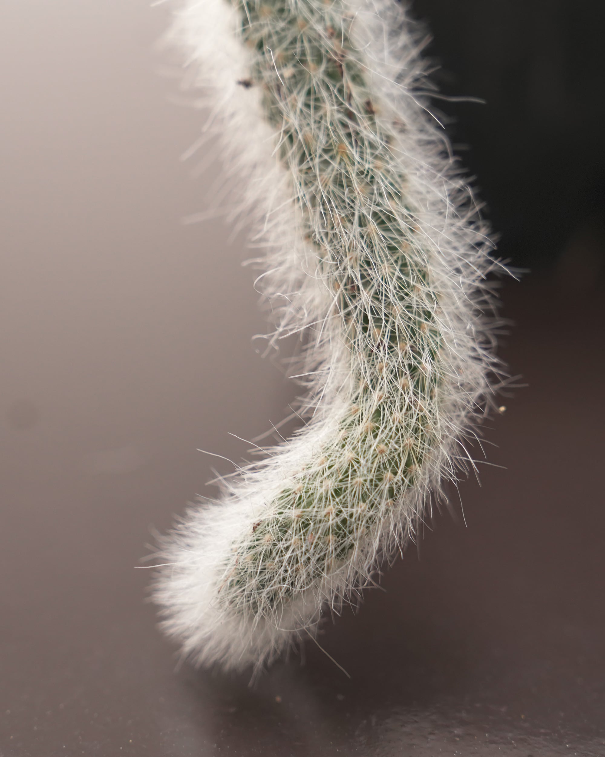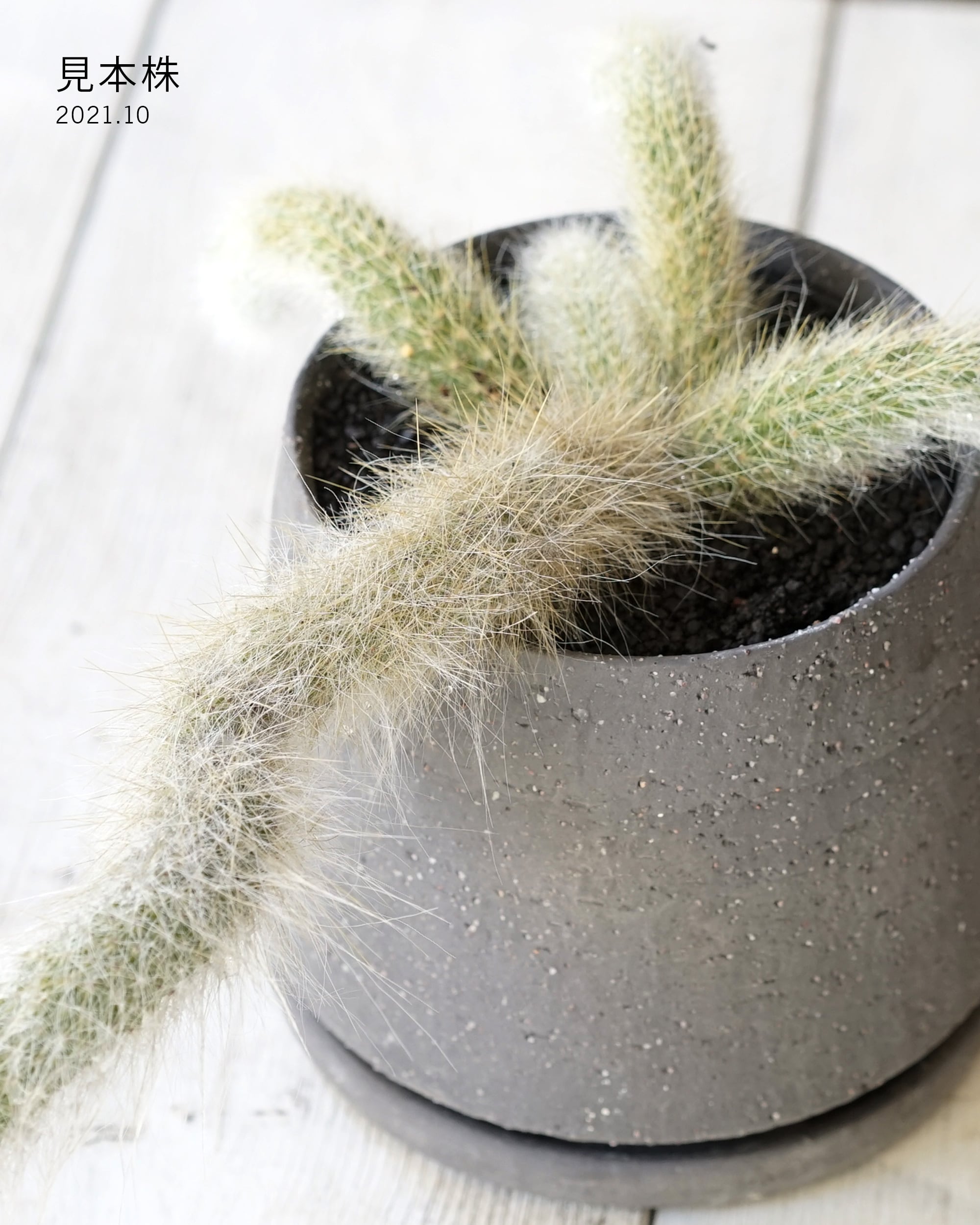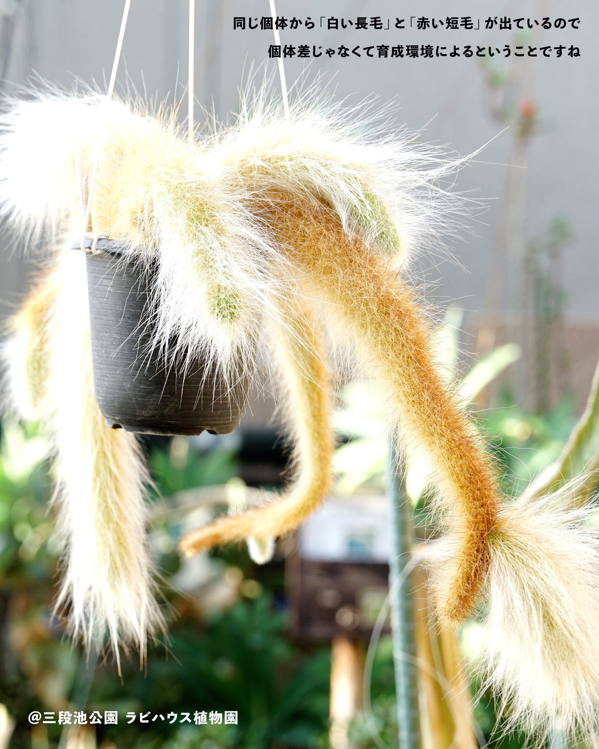 旧学名の「ヒルデウィンテラ」の名前でよく見かける、ふわふわモケモケで垂れ下がる「猫のしっぽ」のようなかわいらしいサボテン。真っ白なふわふわの中からコントラストの強い深紅の花を咲かせるのも魅力の1つ。ふわふわに見える毛は固くてカピバラのような質感ですが撫でる限りでは痛くありません。柔らかい白い毛と堅い黄色い毛があるようで、白が緑刺、黄色が主刺らしいです。