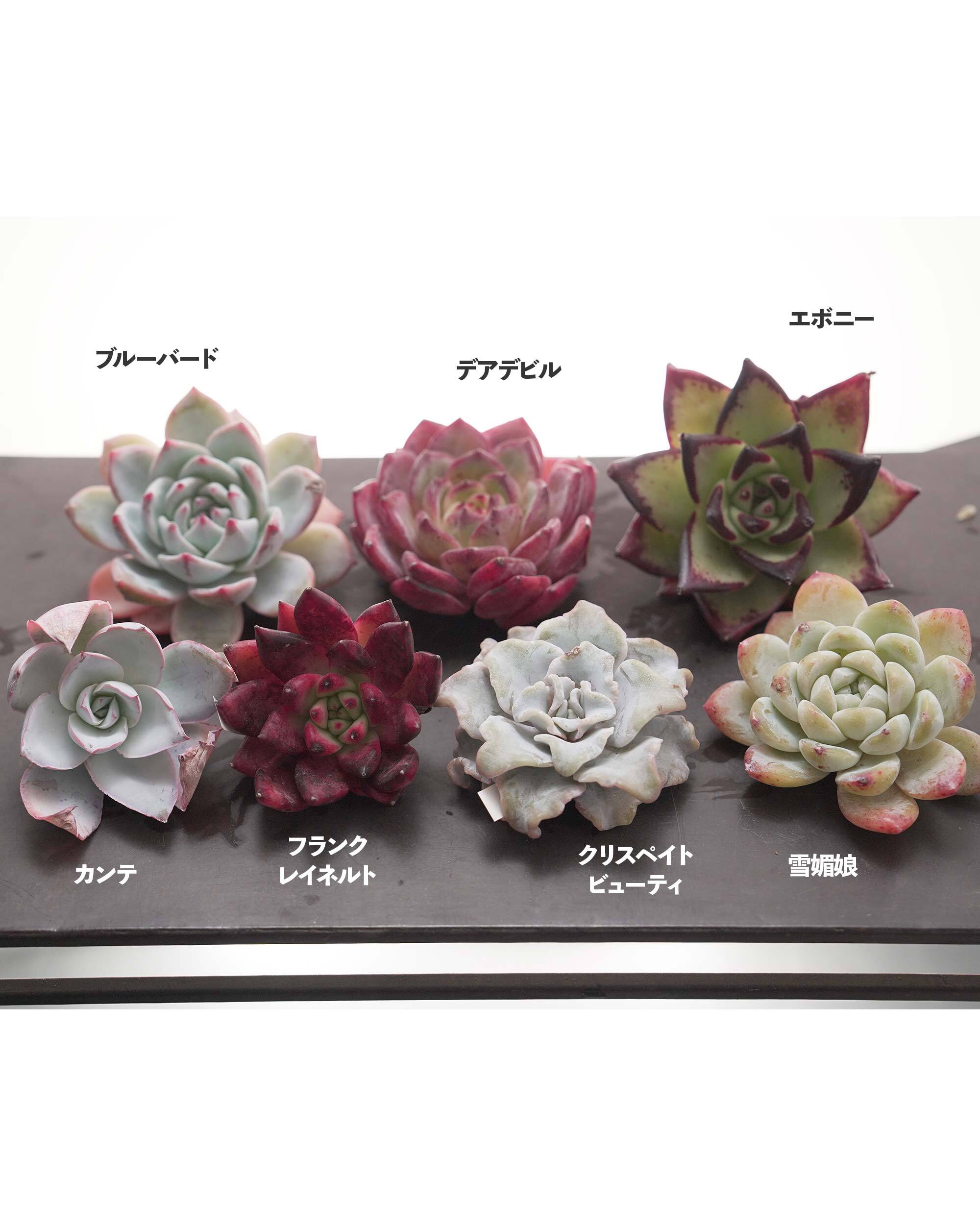 セットCは、カンテ、クリスペ、ブルーバード……。PUKUBOOK SUCCULENTSでは定番中の定番の人気種たちを集めました。ミニ株よりは一回り大きなコたちです。お手頃価格とさせていただくため、恐れ入りますがこのセットでは「オリジナルタグ」は省略させてください。この商品写真を参考にしていただければと思います。