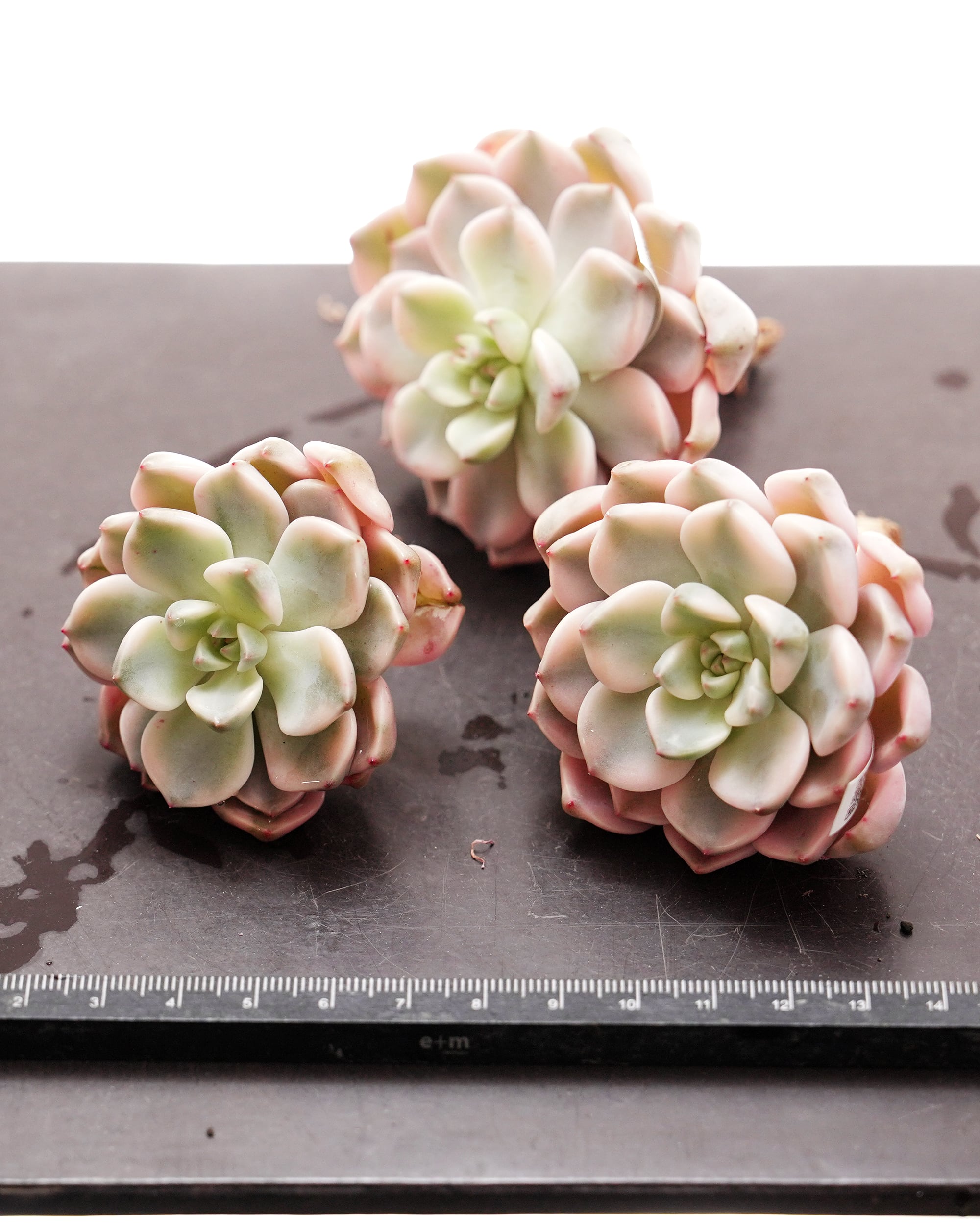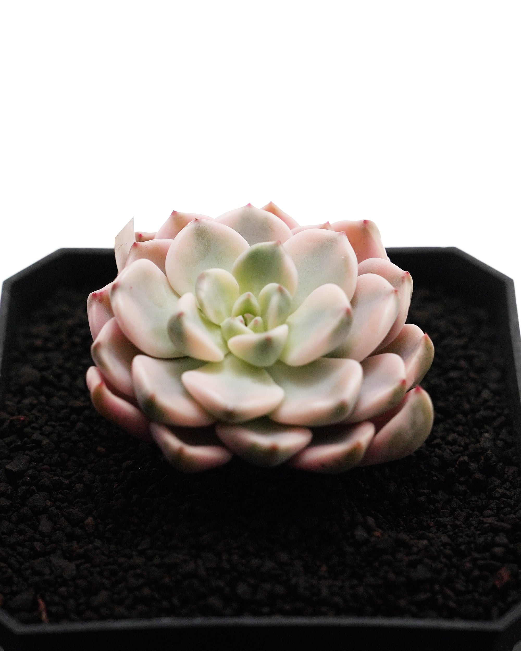 以前にご紹介した「ピンクプリティ錦」と同じものだと思いますが、季節的にピンクに染まっていてかわいいのと、全体的に状態がいいのでベツモノの雰囲気もあります。ちょっと徒長感のあるコがいるのが惜しいです。しっかり陽に当てていただければ、根付く間にきれいになってくれるはず。