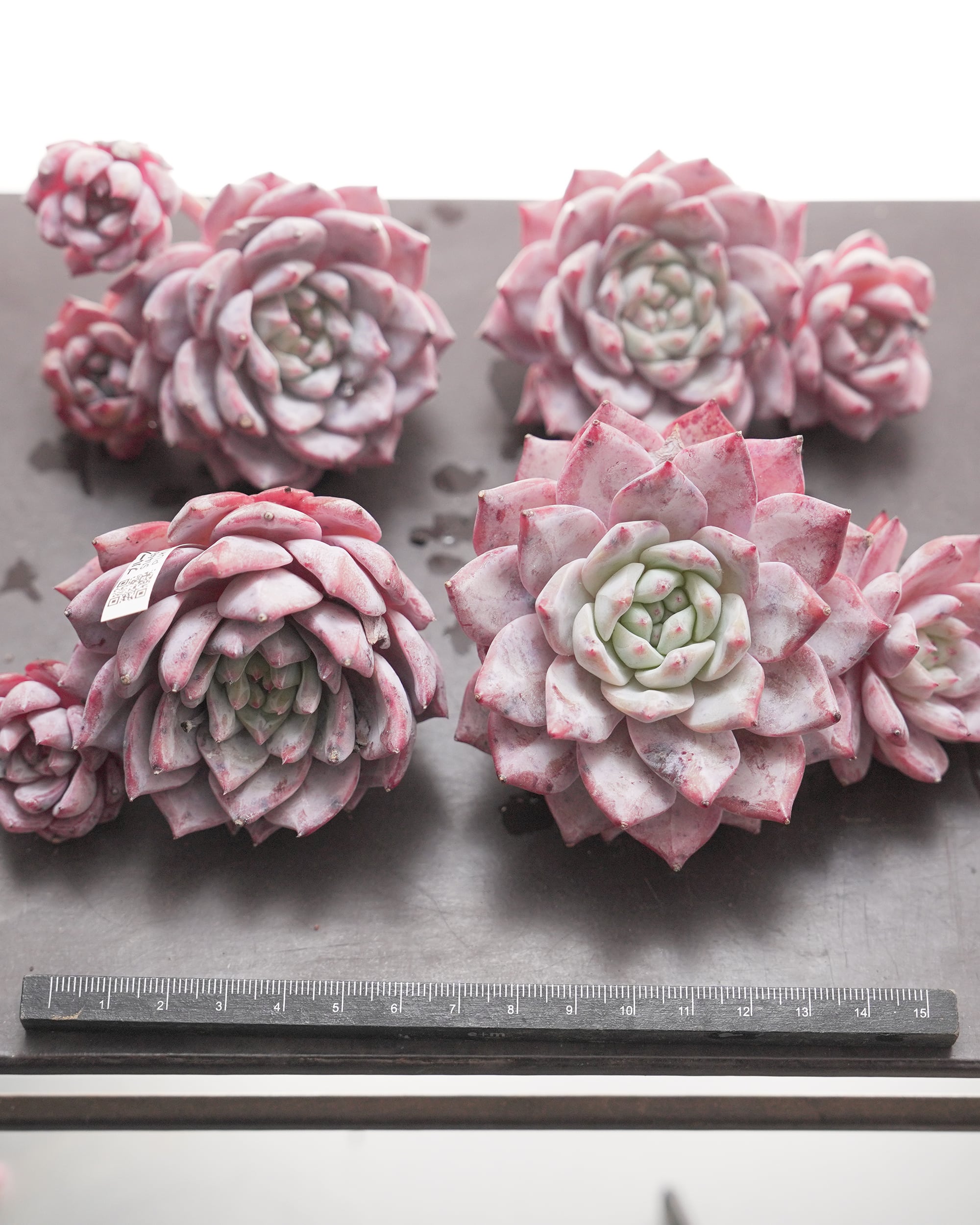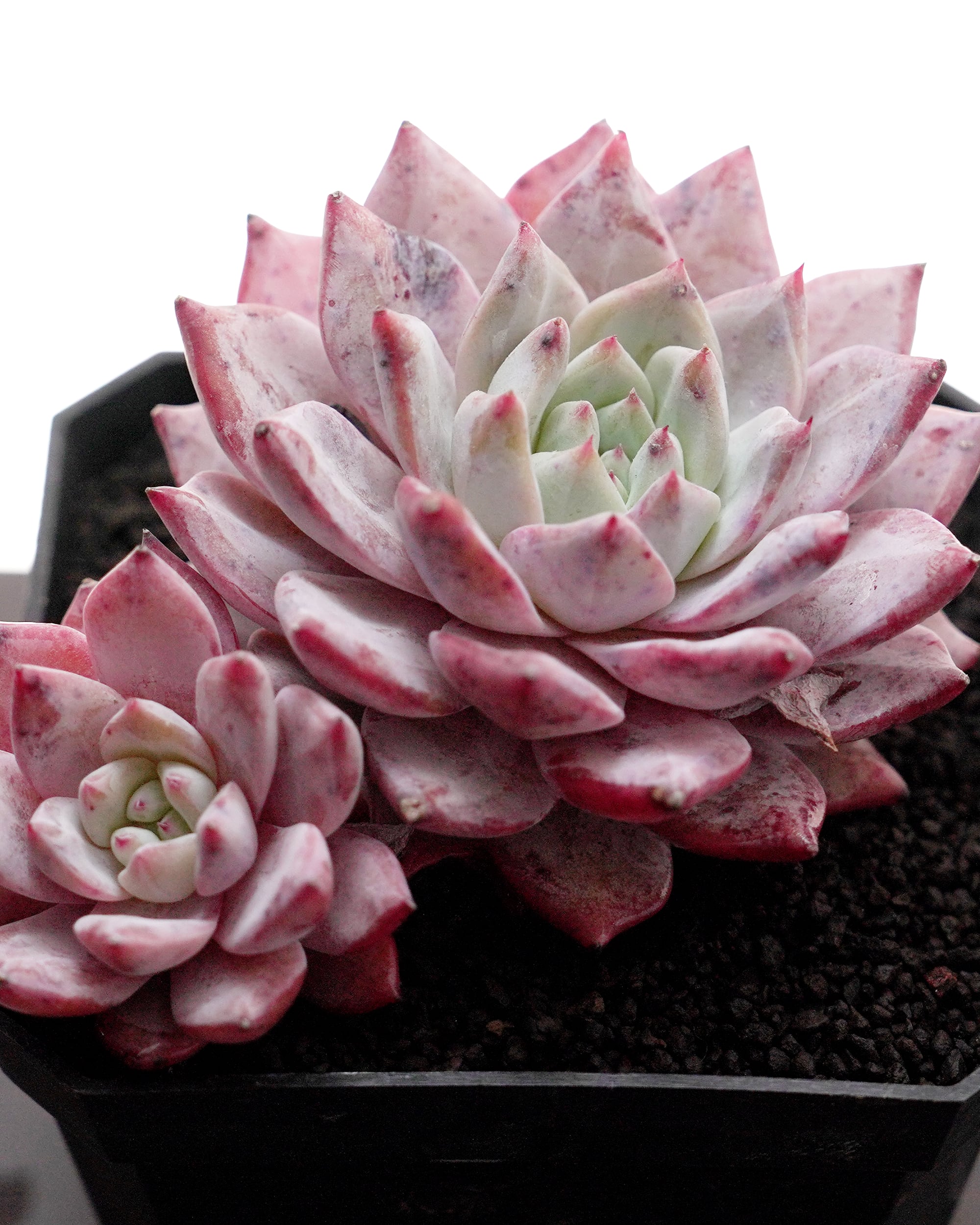 しっかりとパウダーをまとったペールカラーのグラデーションが目を引く、F. Reaineltさん作出のハイブリッド。カンテ E. cante とサブセシリス E. peacockii 'Subsessilis' の交配種というのが通説ですが、羽兼さん曰く「コロラータ✕ピーコッキーのほうが有望」とか(ICNも「カンテちゃうで」と)。やや幹立ちする性質があるのと、葉っぱが垂れ下がりやすいのですが、季節が巡ってくると垂れた葉っぱは枯れて元気なロゼットを開いてくれます。