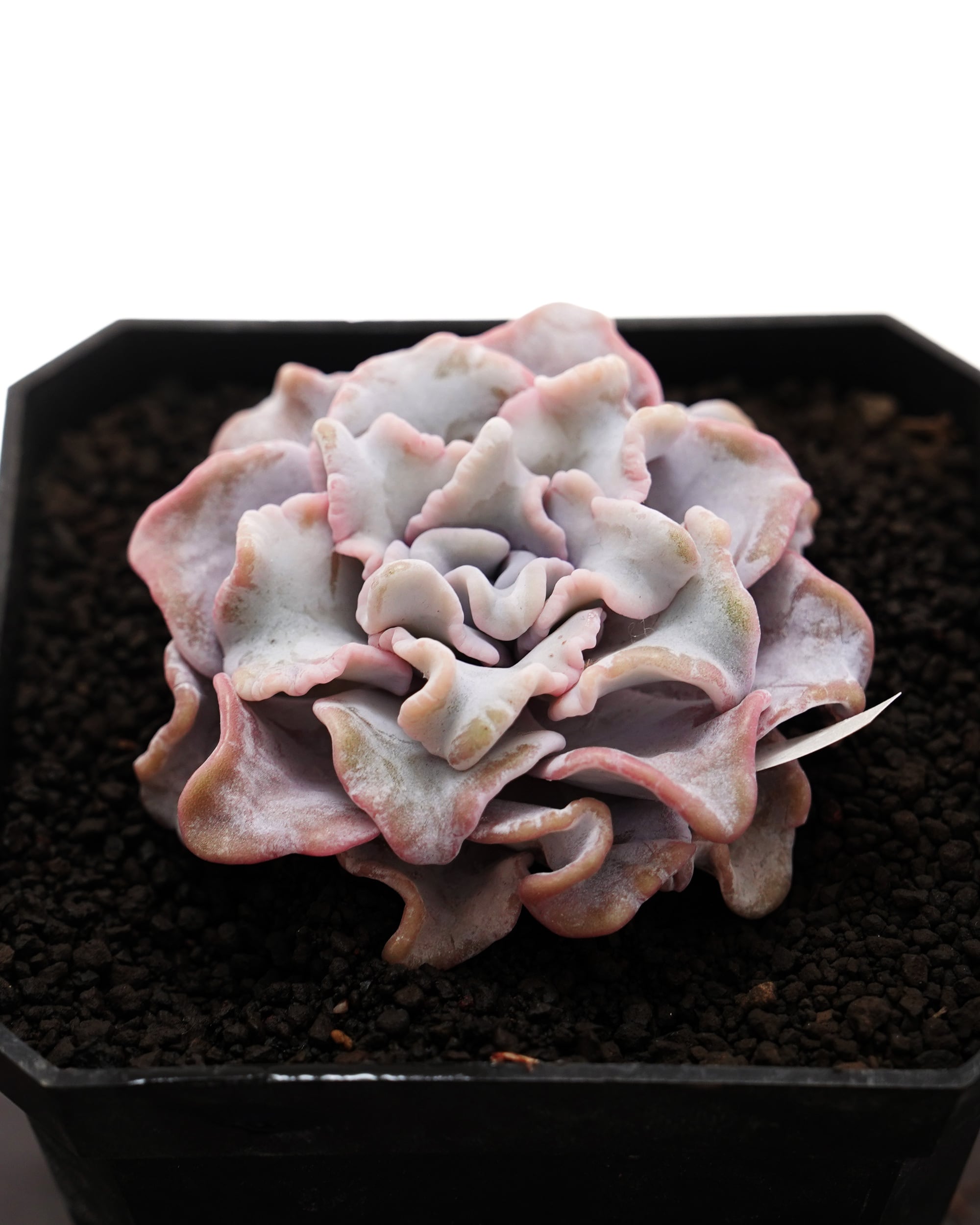 ふわふわとカールしたシルバーグレイの葉がユニークな新品種。カールしたコは多いけど、赤系で、グラデーションしているコが多い中、このシルバーカラーでワントーンなのがとても目を引きます。その個性は「ハイブリッドじゃないから」というのもあるようで、このコはリラシナ E. lilacina から突然変異で生まれたコ。ブラジルの生産者 G. Olsthoorn さん作出で2018年ごろから流通。「C. Crispate」は葉先がうねうねカールしていることを表す植物学用語。中国では「バレエダンサー」や「ホワイトマディバ」と呼ばれています(バレエのほうがフリルが強いので別系統だというウワサあり)。さらにレアな「斑入り E. 'C. Crispate Beauty Variegata'」もあるようです。丸まった葉っぱにシンクロした先の丸い花を咲かせます。