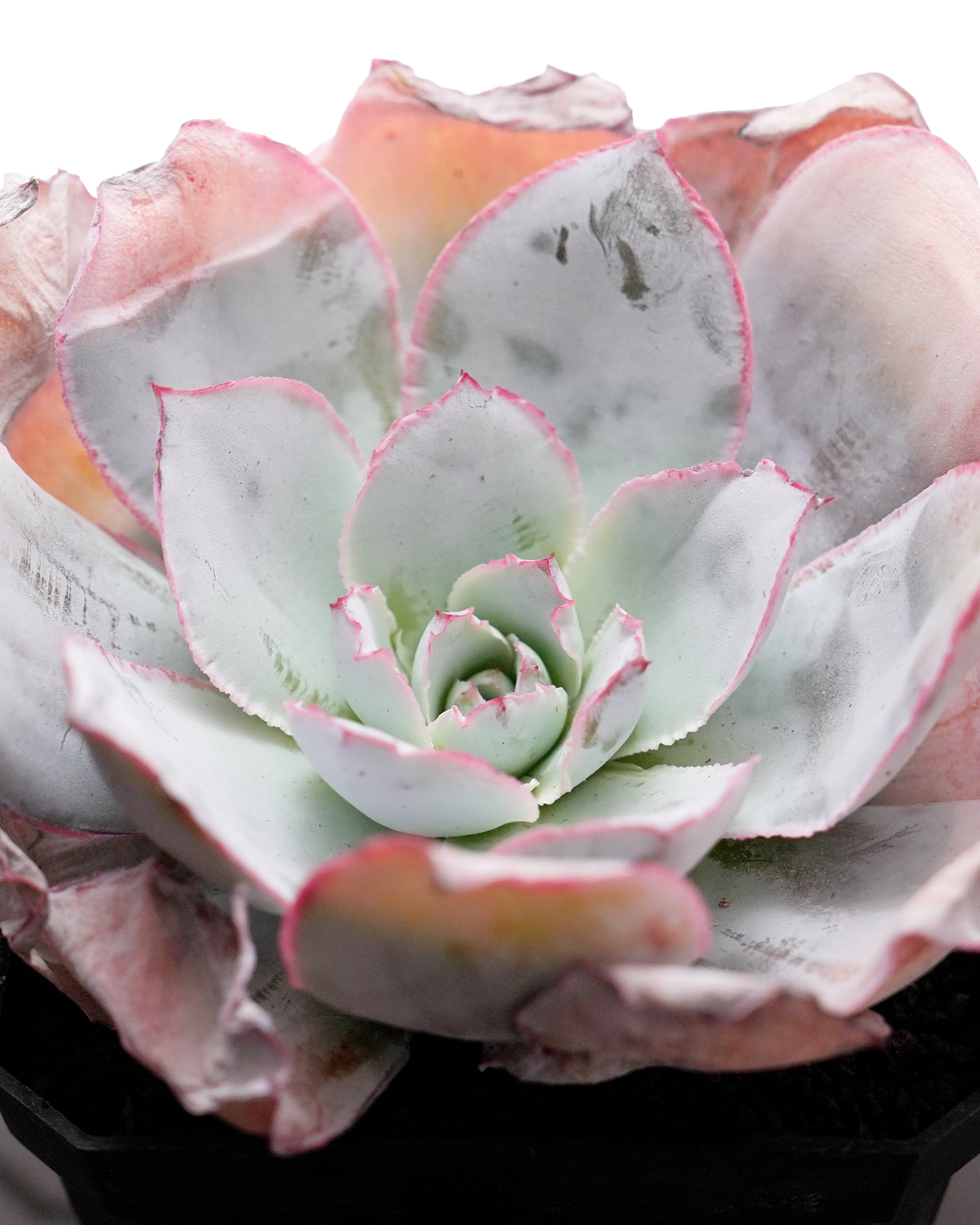 「エケベリアの女王」と呼ばれるほどに、その美しさに定評のある品種。大型で30cmほどになるのに、薄く繊細な葉はピンクからパウダーブルーのグラデーションに彩られ、とてもインプレッシブ。ただ、大きい葉が幾重にも折り重なる美しい樹形を作るには、強い日差しと、夏でも水を切らさずジュレさせない「良い環境」の管理が必要です。詳しくは特集「<a href="/column/cante">カンテの育て方</a>」をご参照ください。