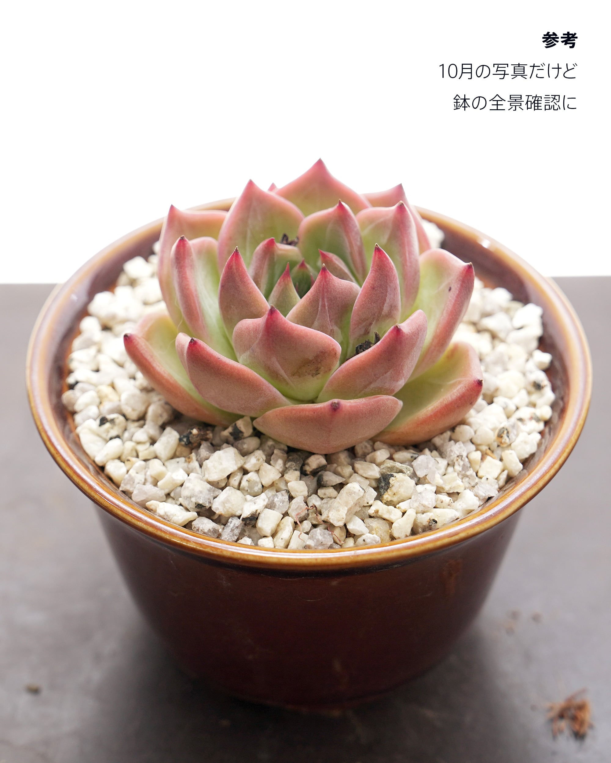 ツヤ感と鮮やかレッドが目を引くアガボイデス系のニューフェイス。キャラメルを焦がしたような濃いルビーカラーのボディに白いウォーターマークがラテアートのミルクフォームのように浮かび上がり、陽光を受けると艶やかなグレーズがとろり——まさに「キャラメルマキアート」の表情、でしょうか。「サマービューティ E. 'Summer Beauty'」に似ていますがこちらのほうが葉が厚くがっしりしていて、白いウォーターマークが際立っています。と言うポイントではこんどは「デアデビル E. 'Daredevil'」や「黒武士 E. 'Black Musa'」に似ているけど、こちらのほうが葉先がシュッと長くてキリッとした印象。