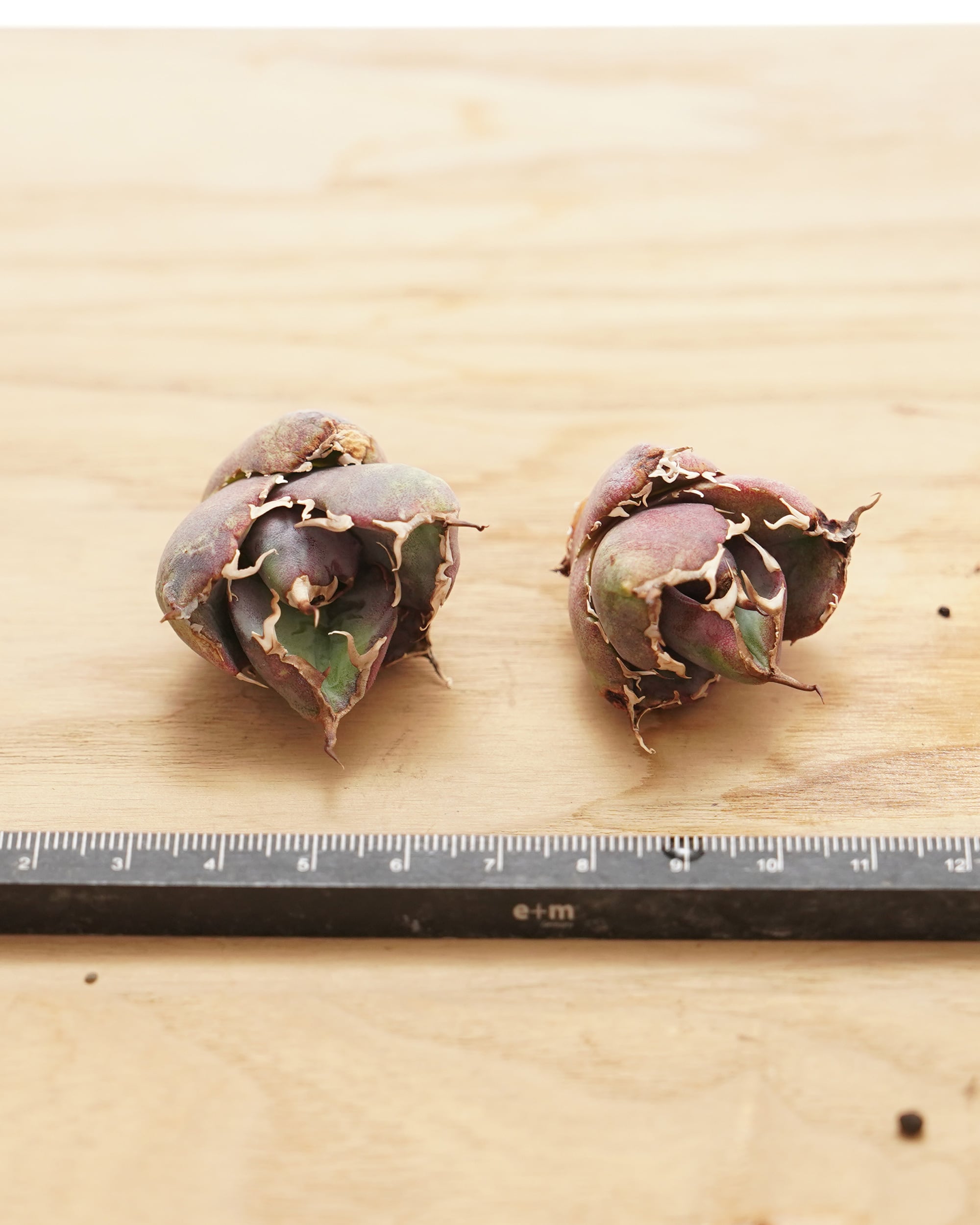 うちに来てから約2年、ようやくお裾分けできるサイズまで育ったカキコです。時間がかかったのは増殖の工程であり、親株自体はこのくらいのサイズのカキコから、見本写真のゴリゴリとした姿になるまでおよそ9ヶ月ほどで仕上がっています。来年の秋頃に向けて親株同様のゴリゴリ株に変わっていくその過程を楽しみたい方におすすめできるカキコです。ほぼ同等ですのでセレクトはお任せください(少し大きい方を優先します)。
