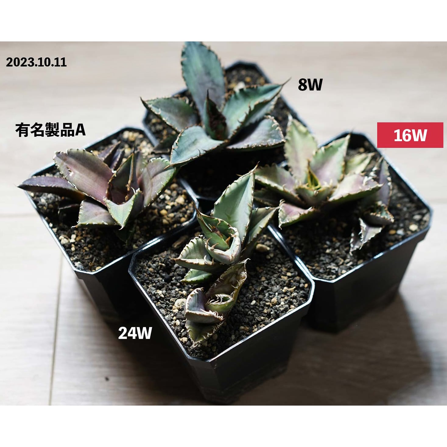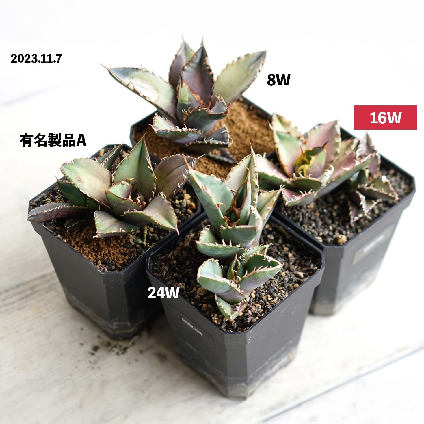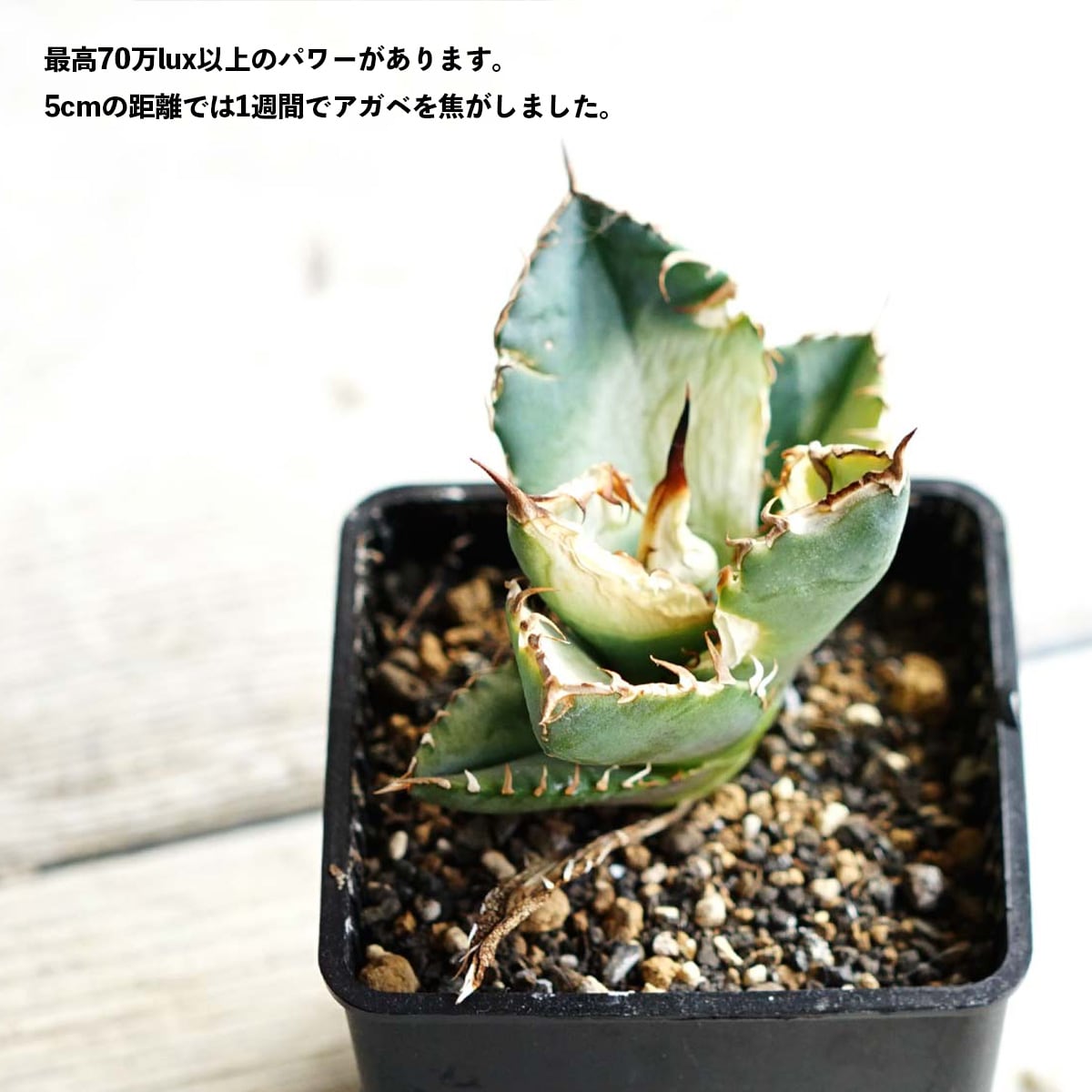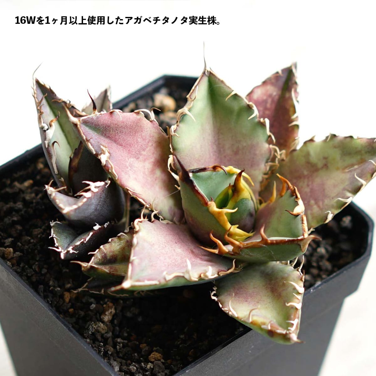 16Wモデルは従来の20Wモデルと同様に、光を好む中型アガベや、やや広い範囲を照らすのにちょうどいい汎用的なモデルです。小さくローコストだからと侮るなかれ。サイズが小さいのが収束性を高めているのか、ゼロ距離での最大光量が80万luxを超えるLED史上最強クラスの驚異的性能を秘めています。そのパワーはアガベもこんがり焦がすほど。