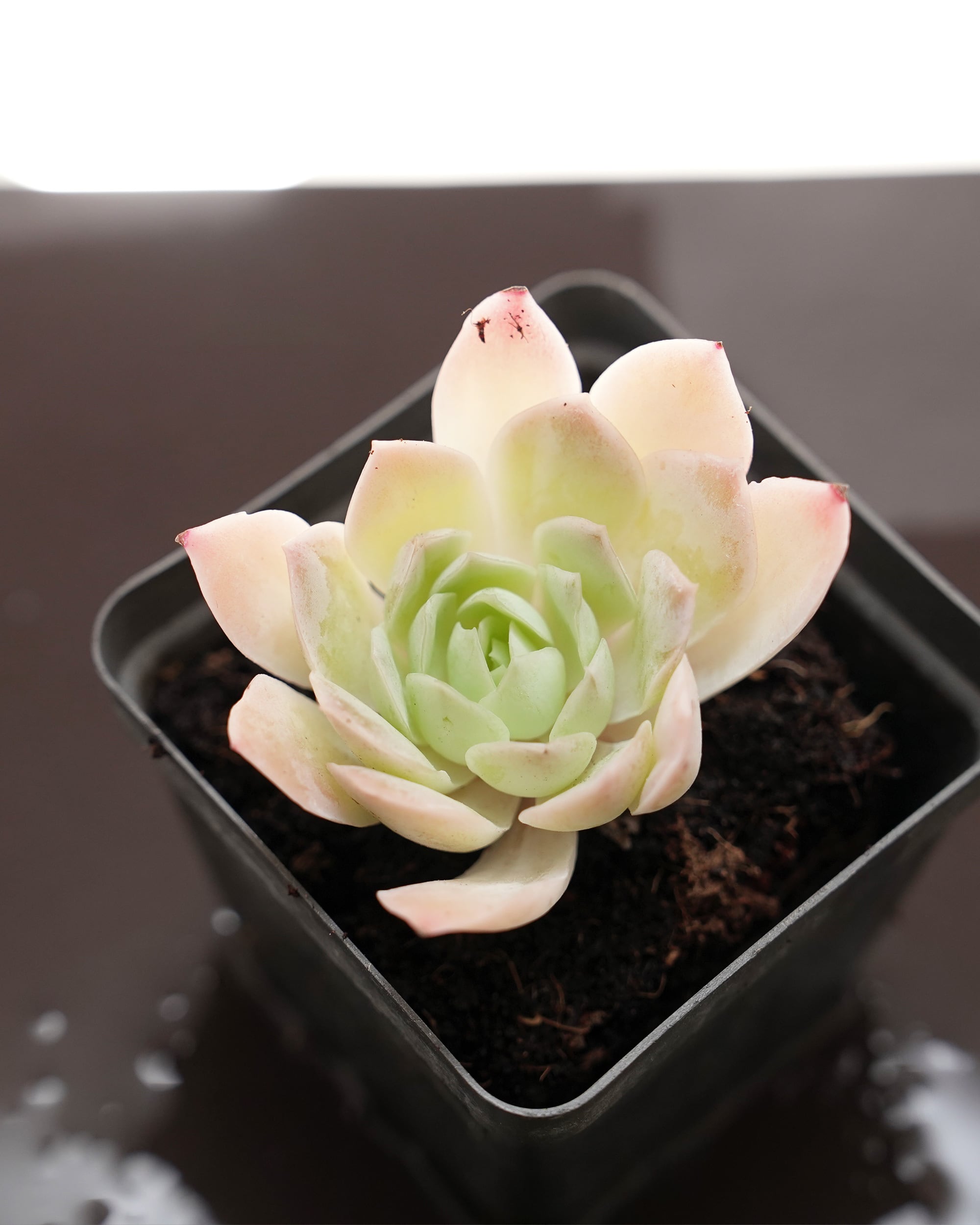 薄くシャープな淡いブルーグレイの葉っぱの先が半透明に輝いていて、少し大振りな葉っぱは緩やかにカールを描くシンプルながらゴージャスなコ。どこかで見たことあるような…。そう、エレガンス E. elegans の正式なバリエーションです。シムランスにも様々なタイプ違いがあります。写真のコはラグナサンチェス E. simulans Laguna Sanchez かなぁ。