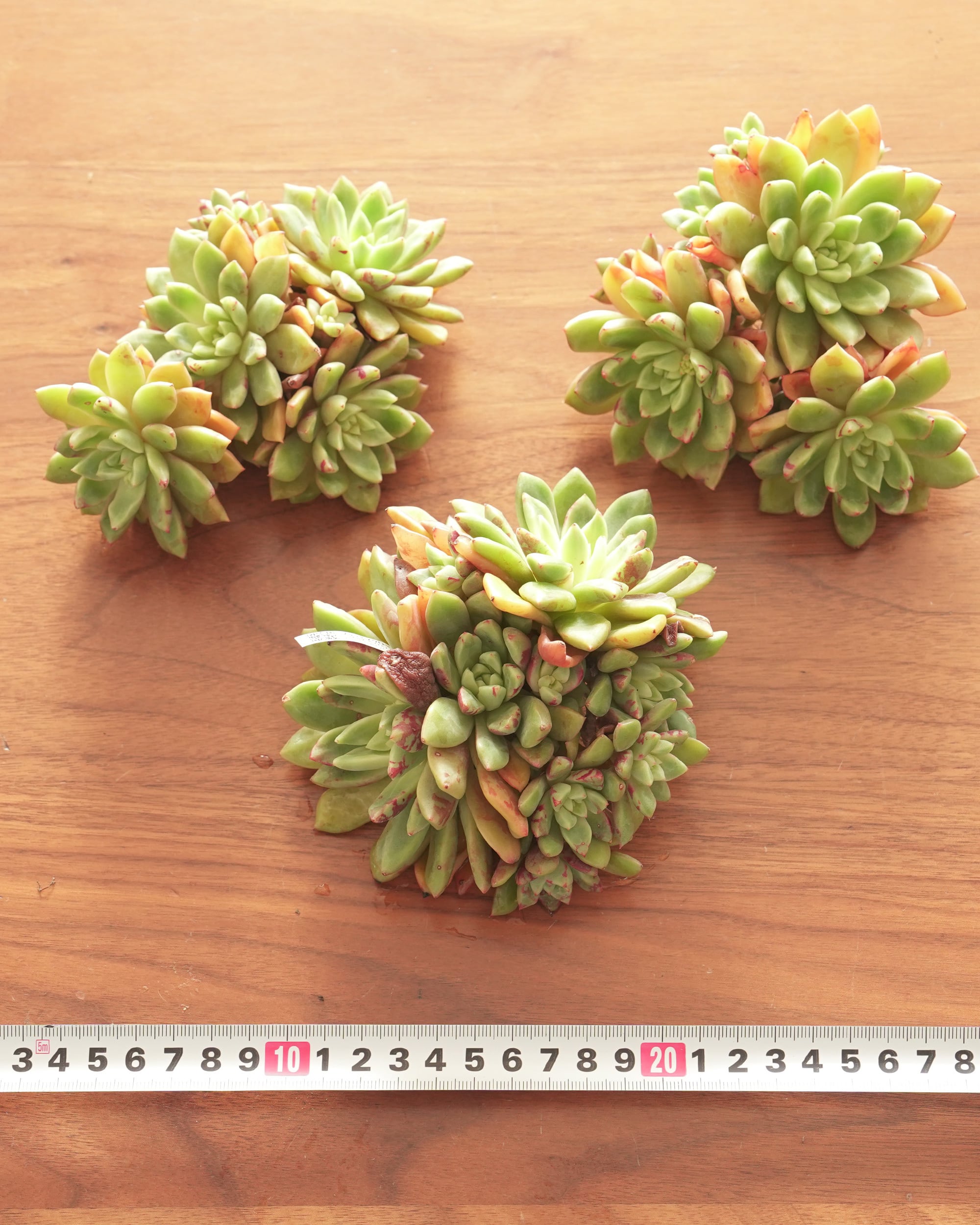 いわゆる「血斑」と言われる赤いまだら模様がガッツリ入った小さなロゼットを群生させるハイブリッド。ここまでびっしりがっつり入ったコはなかなか見かけませんが、それでも子株でストレス下のうちだけのようで生長期にはキレイになります。もう少し大きくなると葉っぱがもう少し伸びてマットなペールグリーンの地色が出てくるようですが、その姿でいうとエコー E. 'Echo' に似ています。たぶんユアンフア E. 'Yuanhua' と同種。S. Swallowは「ツバメ」ですが、もしかしたら「ツバメの巣」からの誤訳か伝言ゲーム説も浮上(E. 'Red Cubilose')。