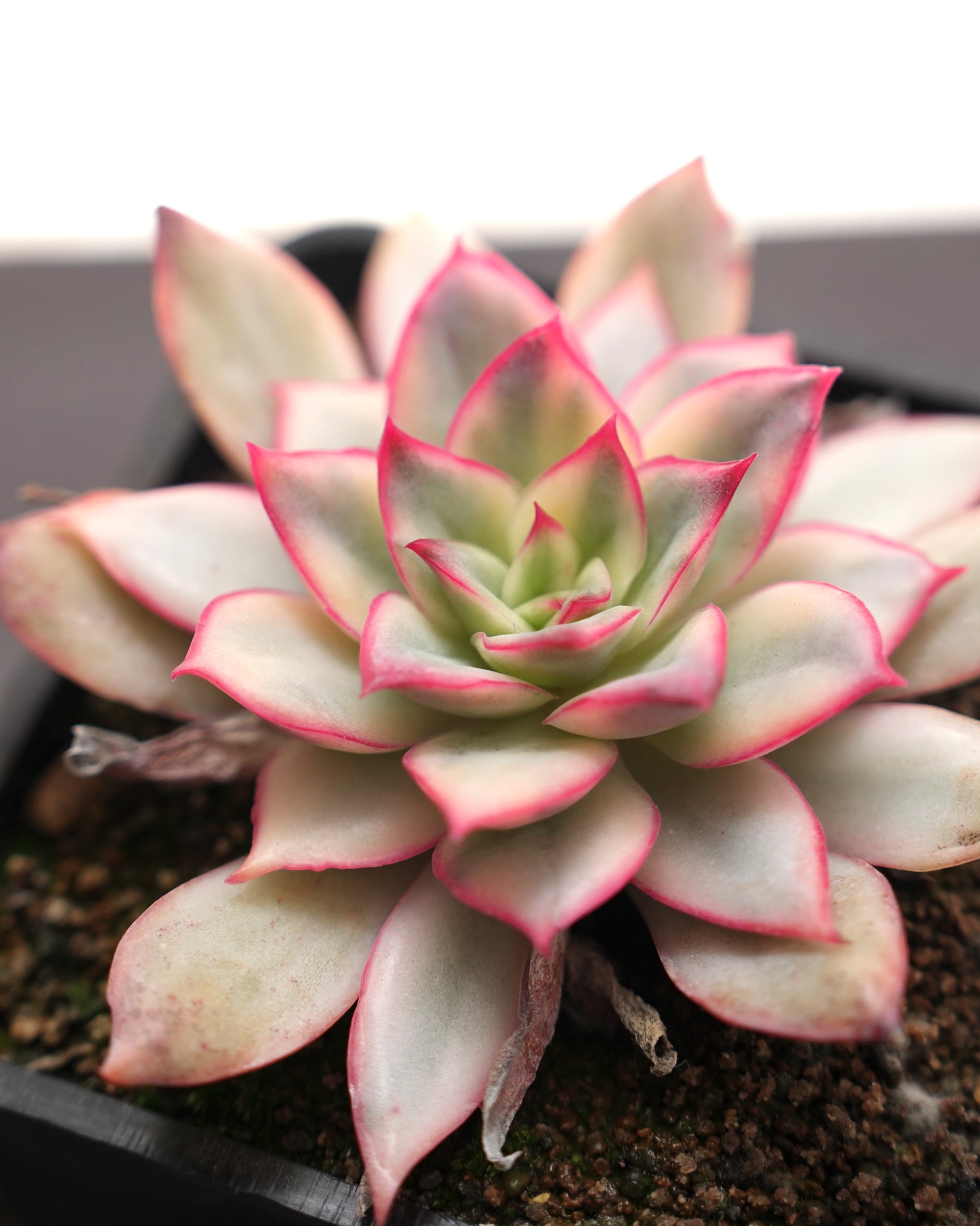 エスター E. 'Esther' の斑入りタイプ。白覆輪斑。ホルウェイ錦 E. 'Holwayi Variegated' のようにランダムにグラデーションがかった覆輪斑ながら、エスターらしく優雅なカーブを描くくっきりとしたエッジに赤い縁取りが美しく、評価の高いコ。生長が遅いのもあってかなかなか価格が下がらない高級種。