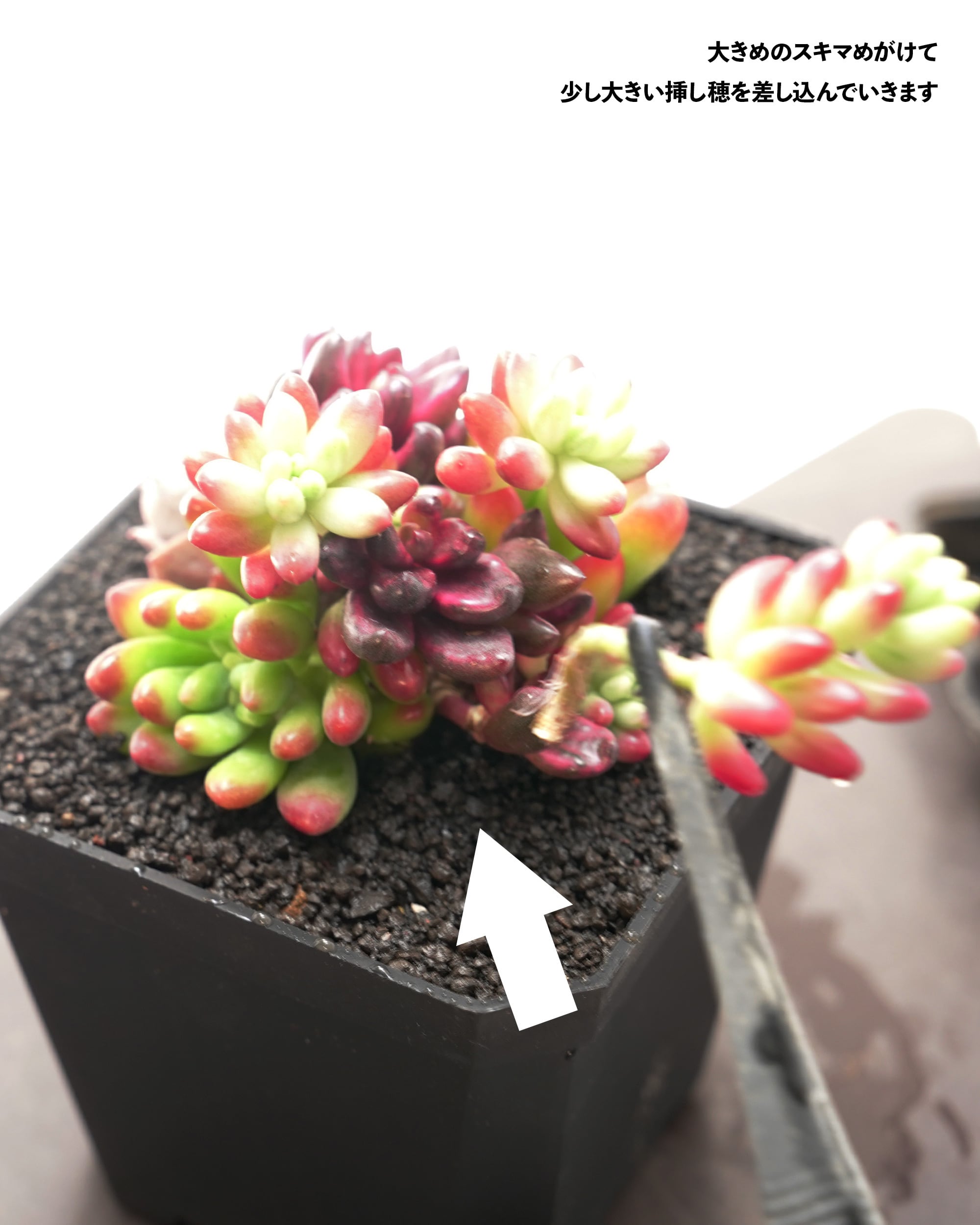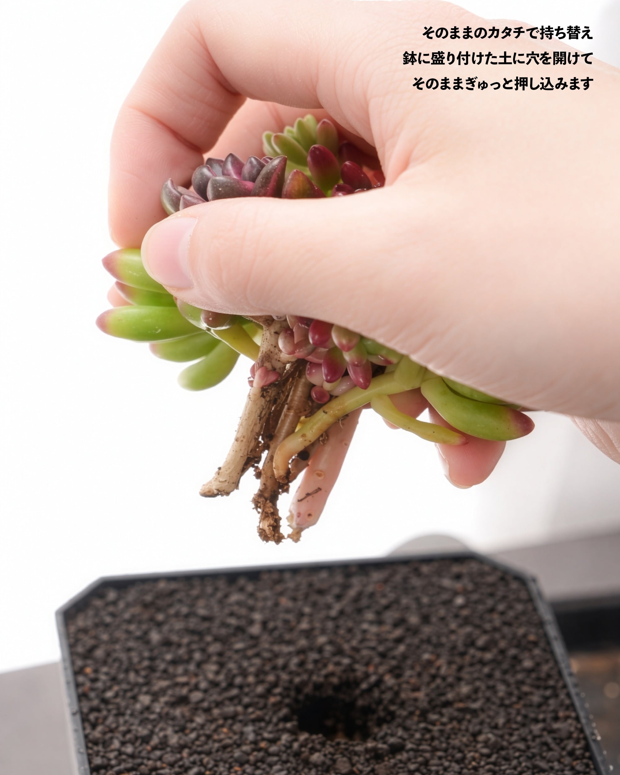 ボリュームの見本としてこんもり仕立てにしてみましたが、もちろん他のエケベリアなどと一緒に植えていただいてもいいですし、さらにバラしてちまちま寄せにしてもかわいいかもしれません。