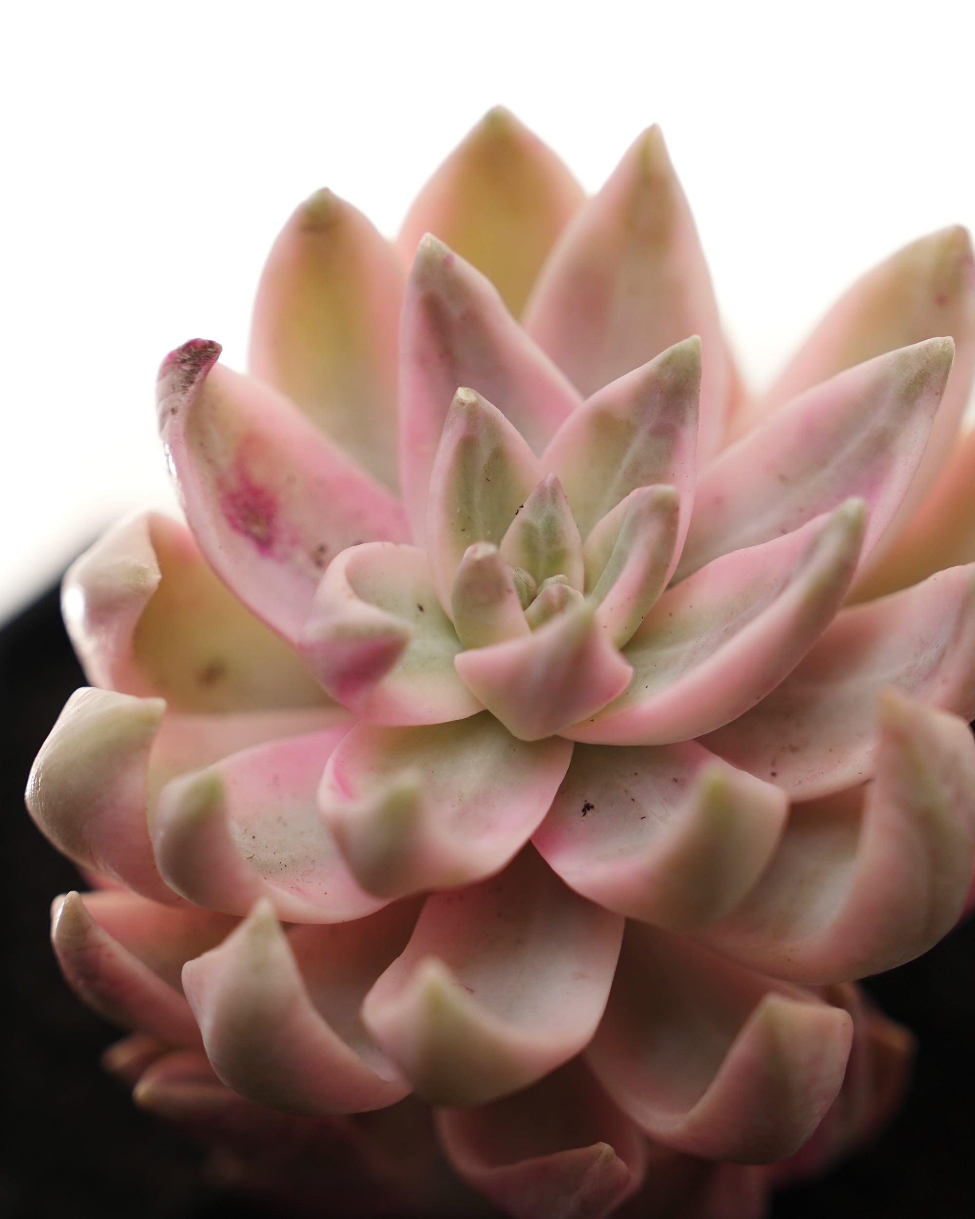 西澤です。「おいしい多肉シリーズ」としてセット販売していたコが、満を持してのレギュラー入りです。ツンとした葉っぱに入ったストライプが特徴的で、ここにお水をたっぷり吸わせてぷっくりさせたり、もりもりに群生させたり……と想像すると、正直ちょっと楽しみになっちゃいますね。 現状は少し背が高くなっていますが、これはグラプト系特有の元気の良さです。単頭植えで背が高いのが気になるときは、根付いてから思い切って半分くらいでカットして挿し直す、といのを繰り返すと、手早く群生株を作れますよ。