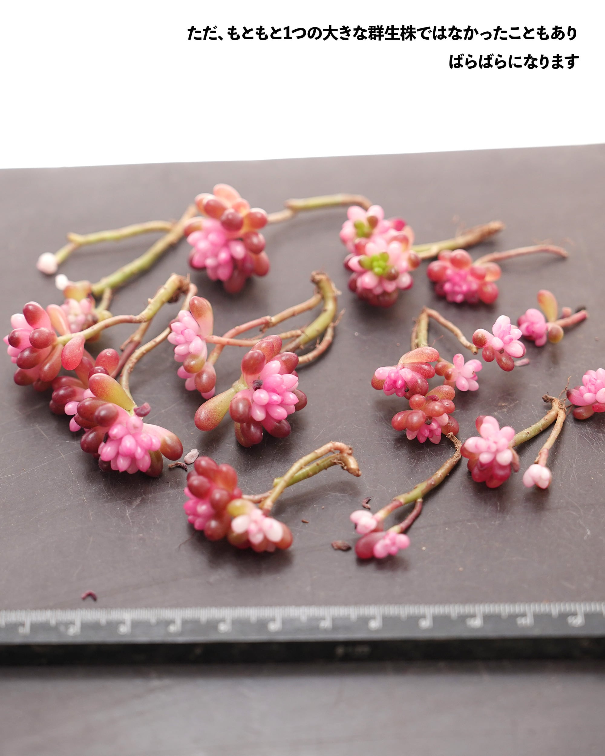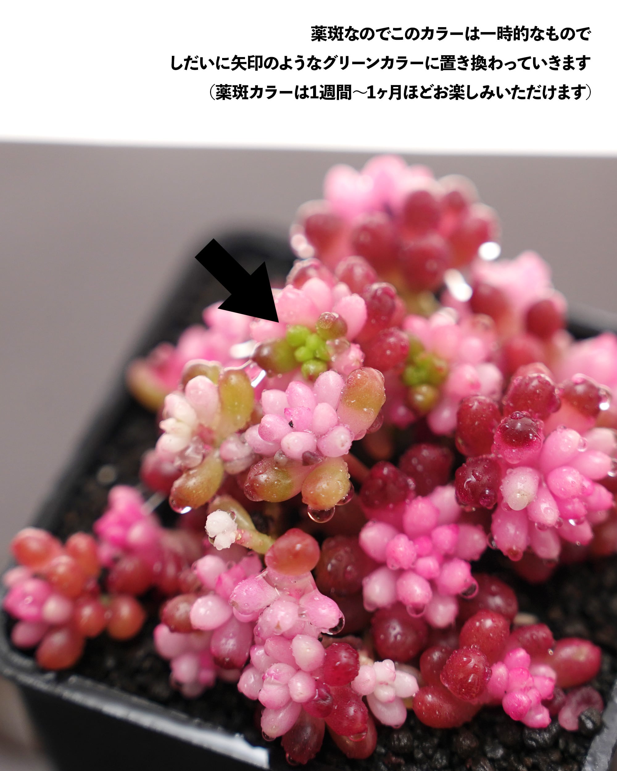 西澤です。 珍しく商品名に「薬斑」と明記されて流通しているコです。正直に申し上げますと、この独特な斑は1~4週間ほどで落ち着いてしまうかと思われます。ですが、まるで桜のような「今だけの儚げな美しさ」として愛でていただければ幸いです♪ 斑が消えた後の季節には、透明感のあるレッドカラーに紅葉するはずですので、長く楽しんでいただけると思います。小ぶりなサイズですので、寄せ植えのアクセントとして散らしてあげるのもおすすめですよ。