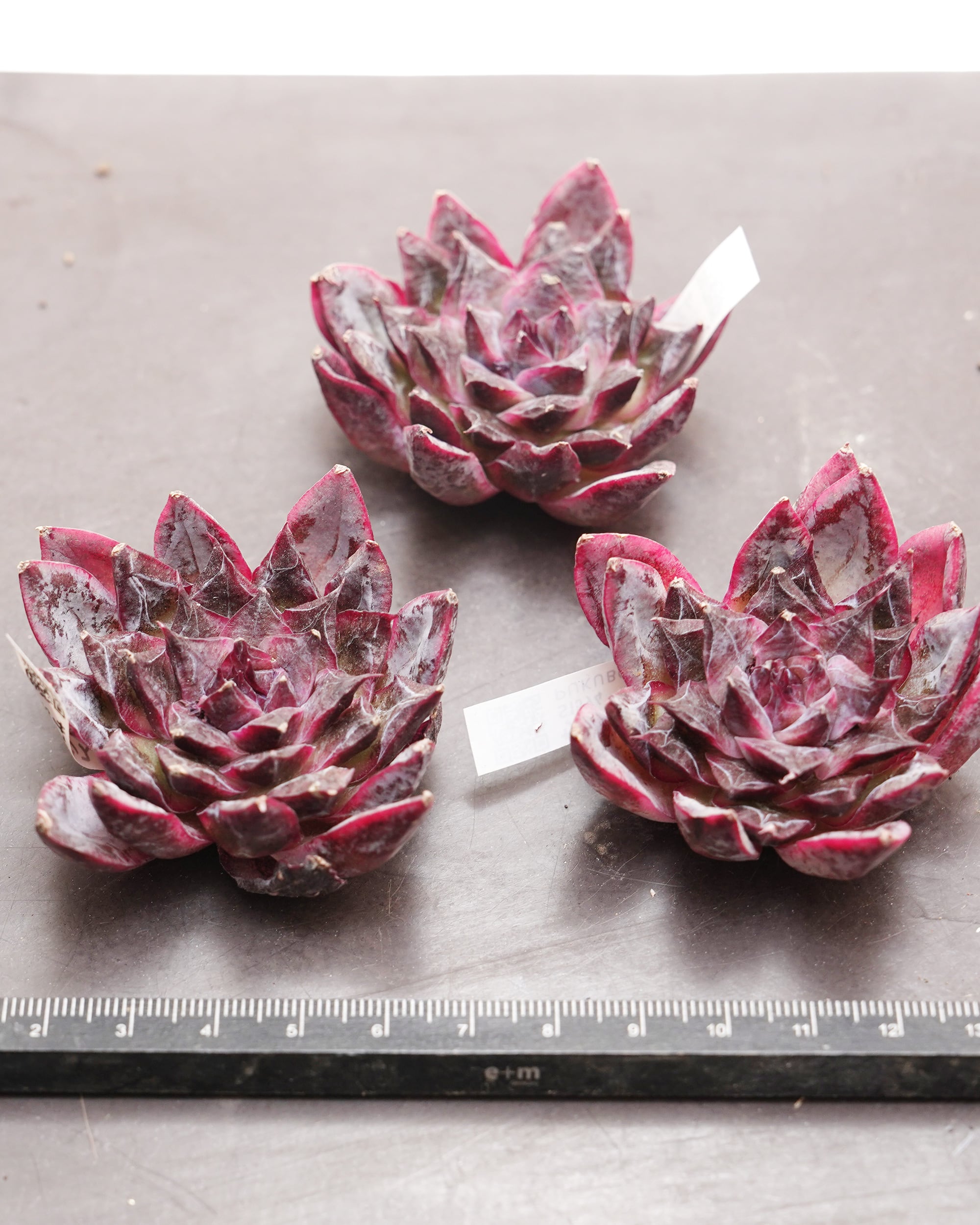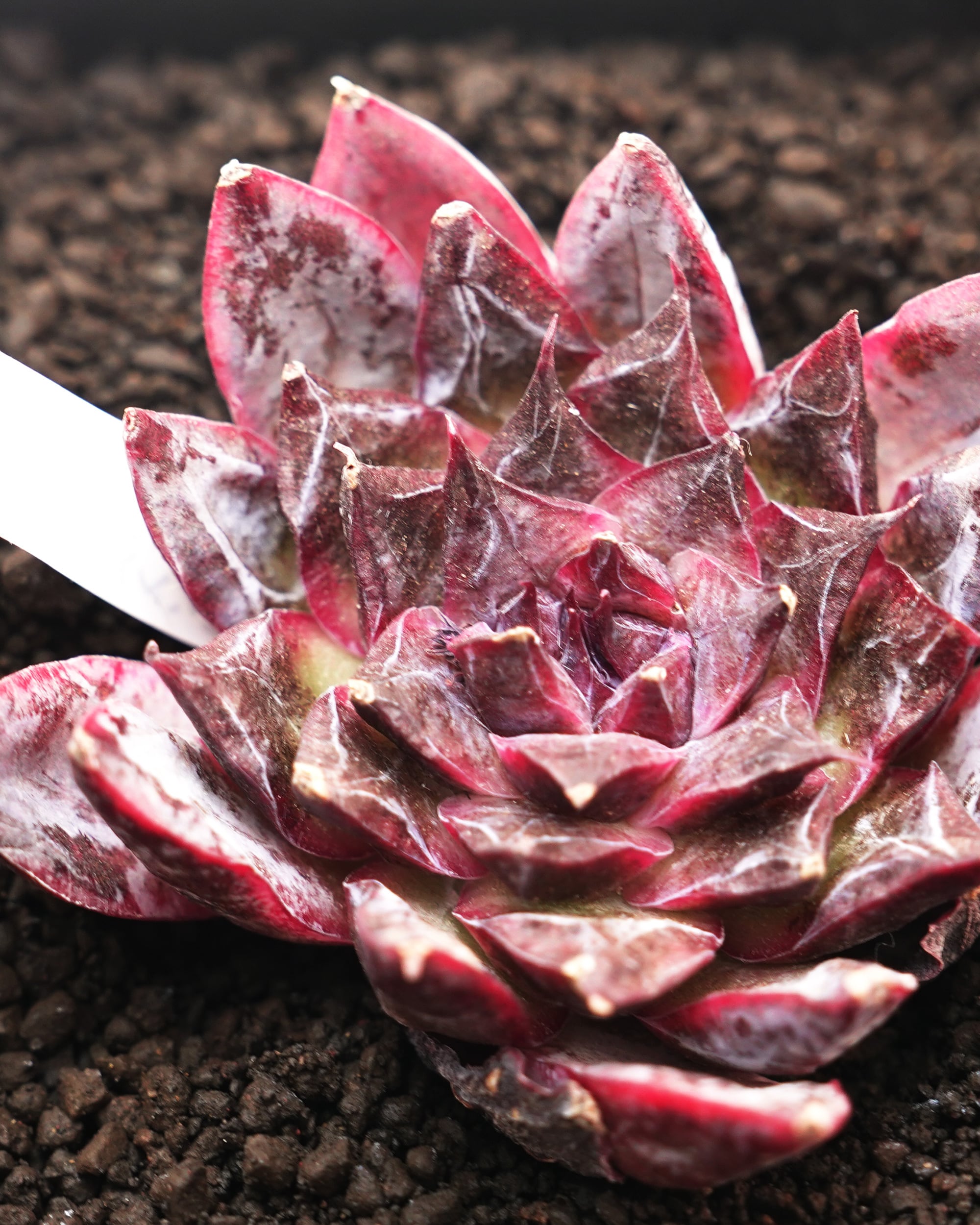 おそらく2025年に彗星のごとく現れたこの「サスペンス」は、そのエッジの効いた刺々しいフォルムで、まるでダークファンタジーに登場する魔王のような圧倒的な覇気をまとっています。ダーク系のエケベリアはこれまでも多くありましたが、ここまでダークカラーにふさわしい、毒々しくも美しく攻撃的な造形美はなかったかも。フォルムの鋭さから推測するに、ご両親のどちらかには「大和錦 E. purpusorum」の血が流れているのかもしれません。その他詳細は未明でこのあとどんな成長を見せてくれるのか期待して見守っています。