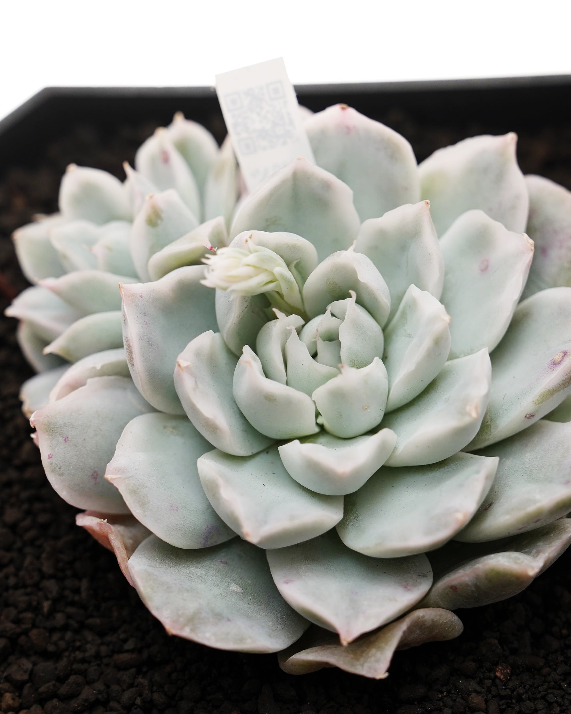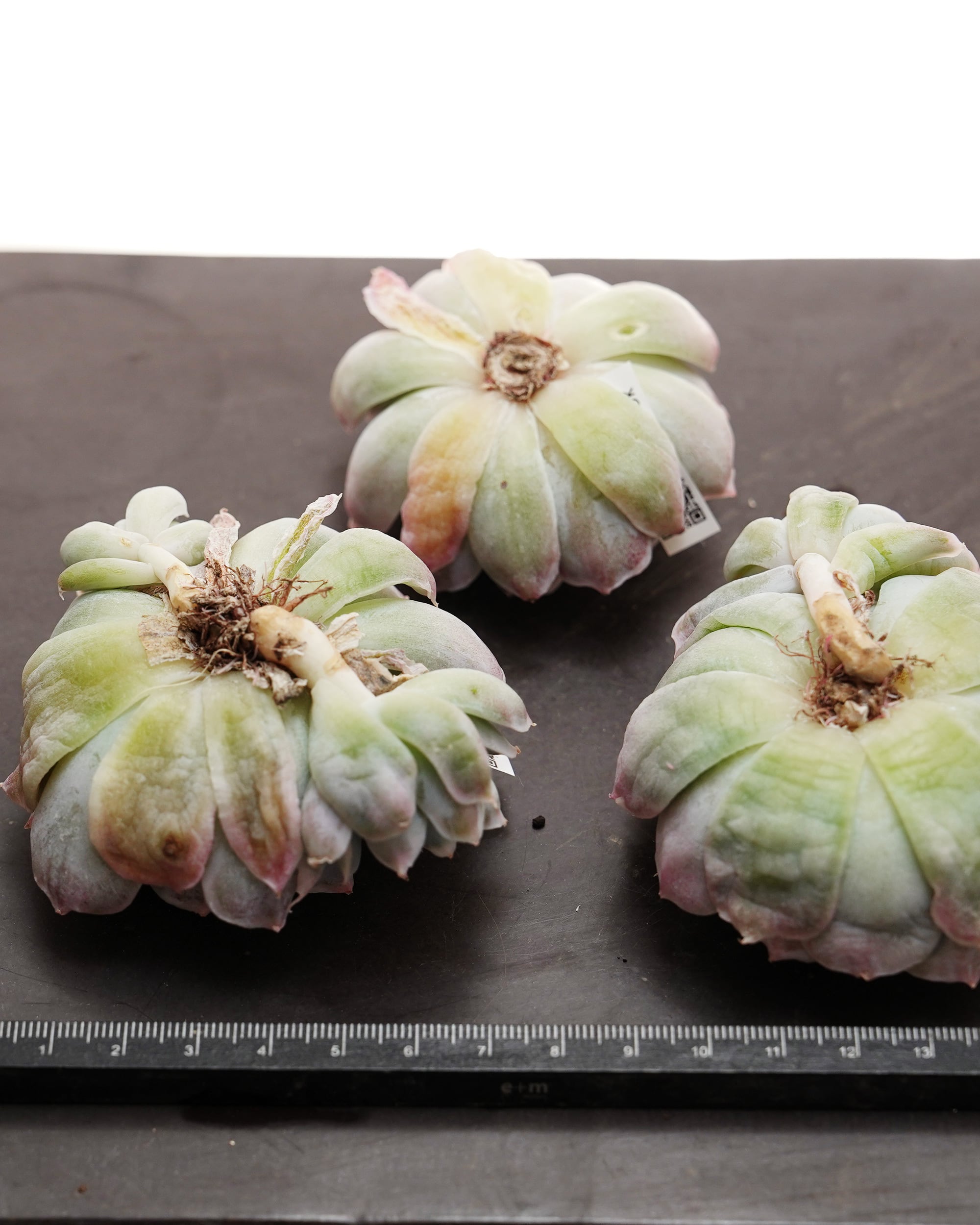 透き通るような青白い肌に、光を透過させる白いエッジというシンプルワントーンカラー。そのエッジをほんのりシャギーにカールさせ、肉厚の葉っぱとともにボリュームあるドレスのスカートのよう。シックさと遊び心を兼ね備えたニューフェイス。エレガンス系の血筋を感じさせてくれてはいますが、由来は未明。「シンプソン E. 'Simpson'」という品種もあるっぽいけどほとんどその姿を見ることはありません。それが斑入りになることでカタチが崩れたタイプなんでしょうね。均整のとれた美しさとは一味違う、自然が描いたモダンアートのような一鉢です。「白牡丹錦 G. 'Hakubotan Variegated'」にも似ていますが、あちらよりロゼットがひと回り大きく、背丈が低くどっしりしたフォルムなので印象は大きく異なります。