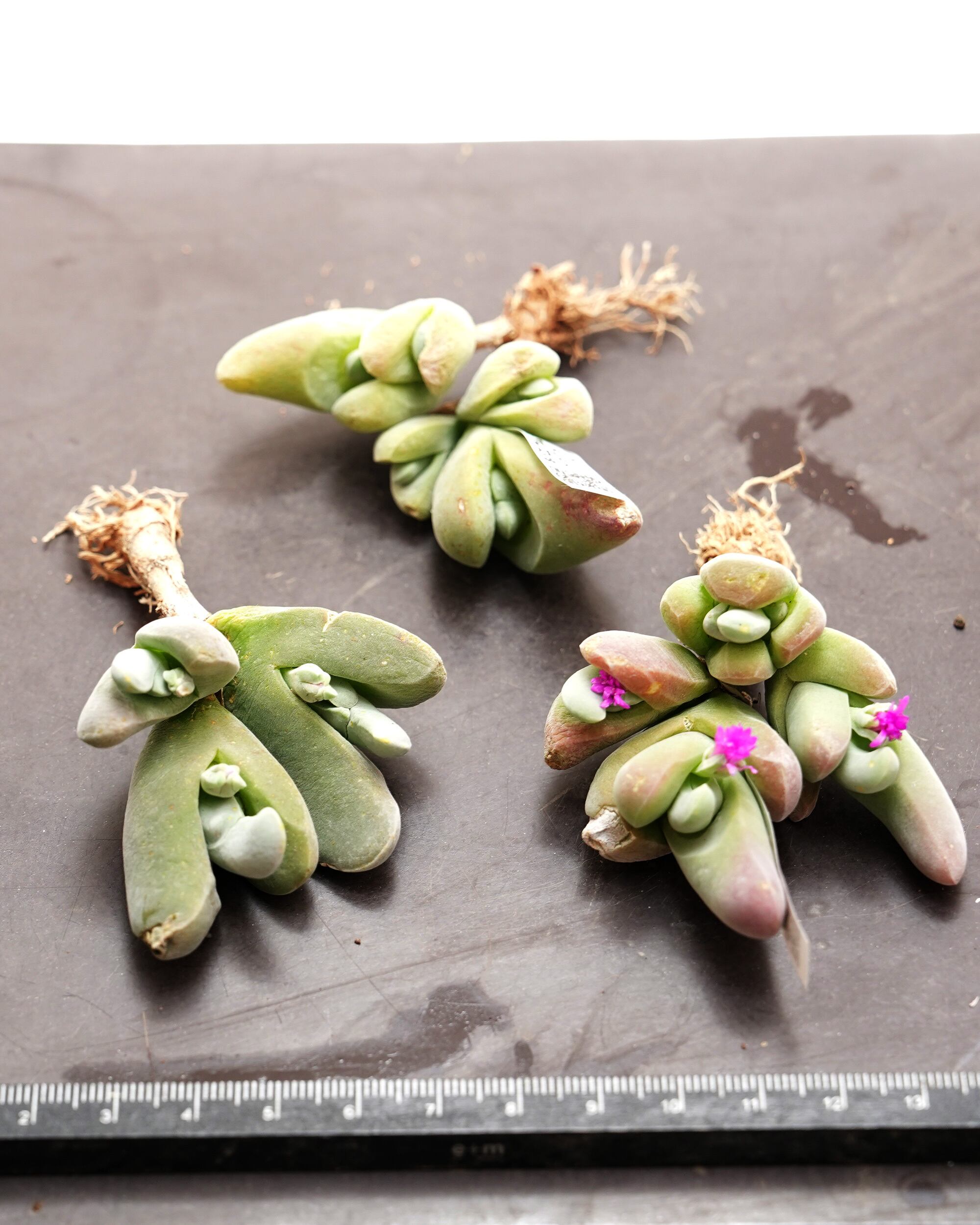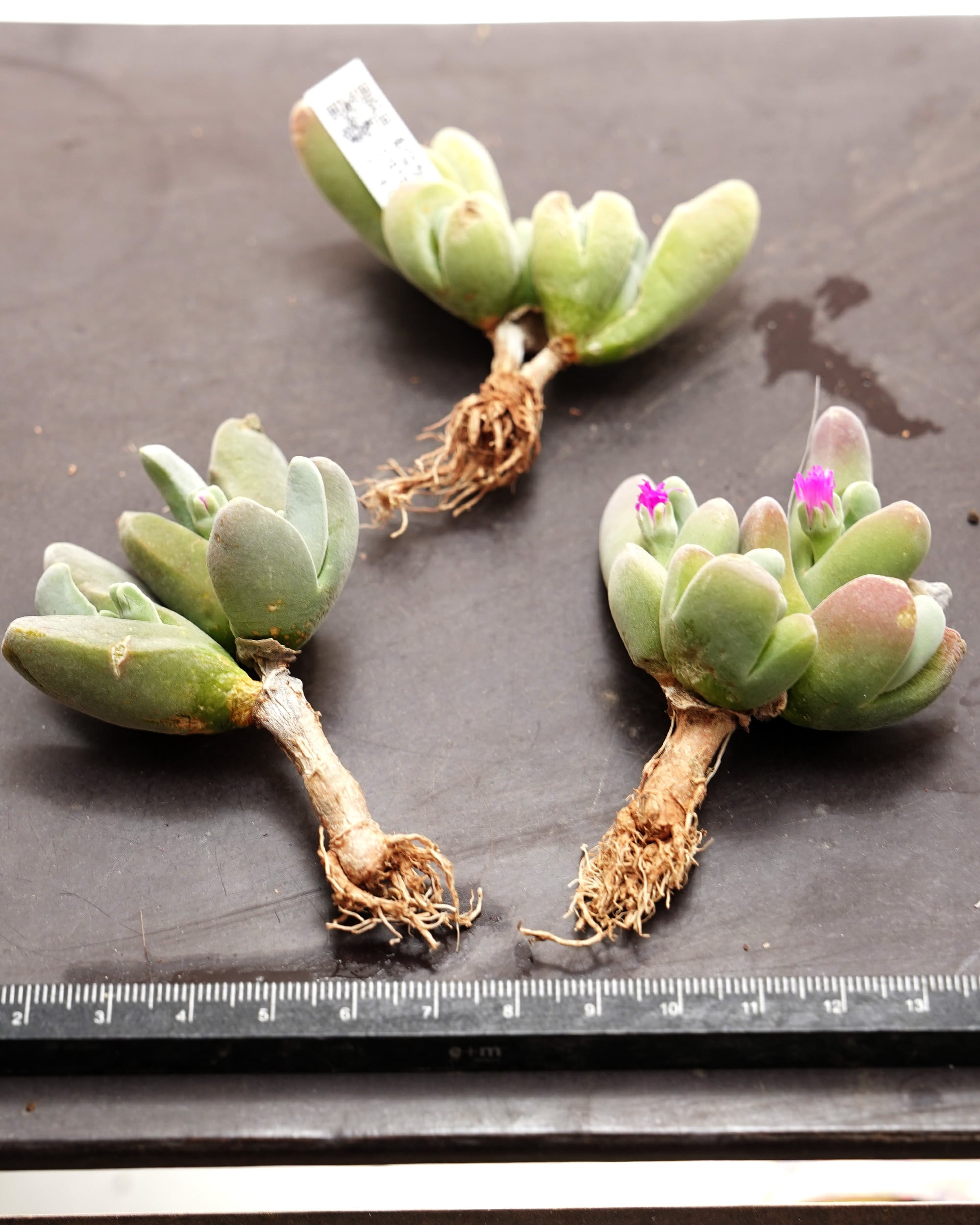 ギバエウムという聞き慣れない属だけどコノフィツムやランプランサスに近い、いわゆる「メセン」の仲間で、クチバシのようなカタチの葉っぱは基本的に「左右非対称」で、あまり地面に潜らず地上にこんもりとしたフォルムを形成するのが大きな特徴。ほとんどの種はほんのりキラキラと光りを乱反射する明るいグリーンのプレーンカラー。この「青珠子玉」こと「ゲミナム」はランプランサスに近く、指のように太い葉っぱを伸ばしながら幹立ちし、左右にも茎を伸ばして匍匐して、鉢を覆い尽くすグランドカバーのように成長していきます。冬の成長期から春にかけて紫色のツヤツヤの花を咲かせる姿は、さながら「葉っぱが大きなマツバギク L. spectabilis」。ぜひ大きめの鉢でいっぱいの花畑に仕立ててみてください。