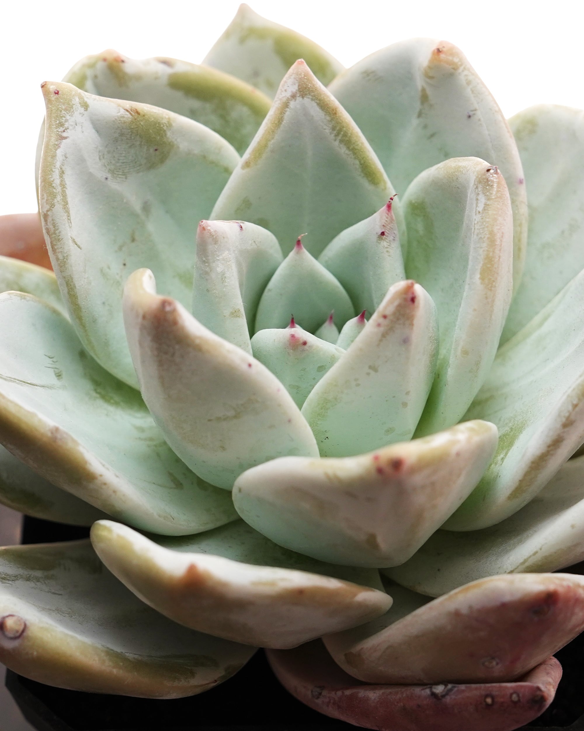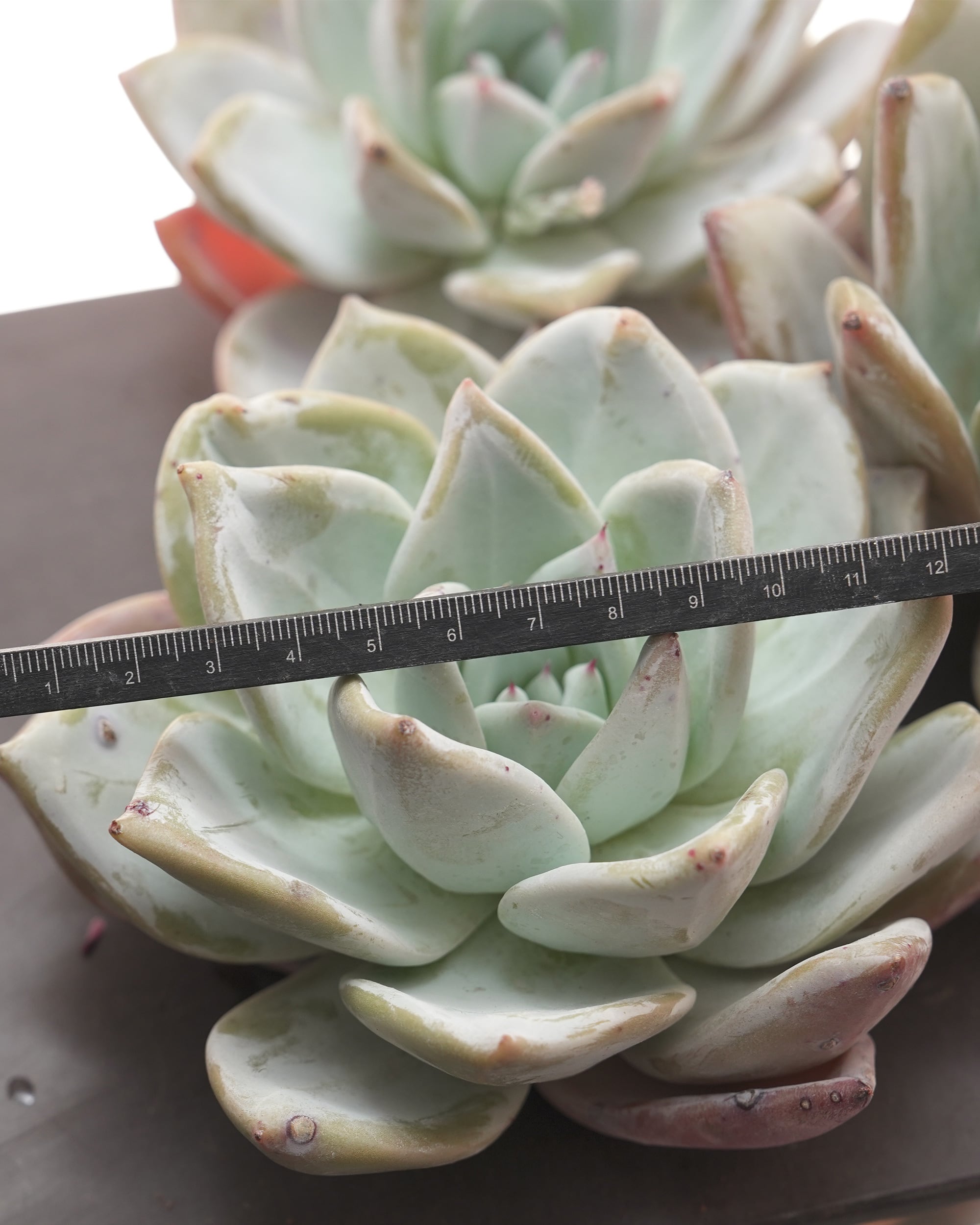 巨大エケベリアの代名詞で、30cm以上になる大型種。ふだん小さなコたちを相手にした後にコレをみるとまさにアリと巨人で、収まっている鉢がバケツに見えるくらい。大きさばかりが取り沙汰されますが、コロラータらしく、ホワイトパウダーで覆われたなめらか美肌と、冬のピンクのグラデーションは、小ぶりでも十分に目を引く美しさです。わき芽をあまり出さず、単一のロゼットを形づくる。生長はゆっくり。