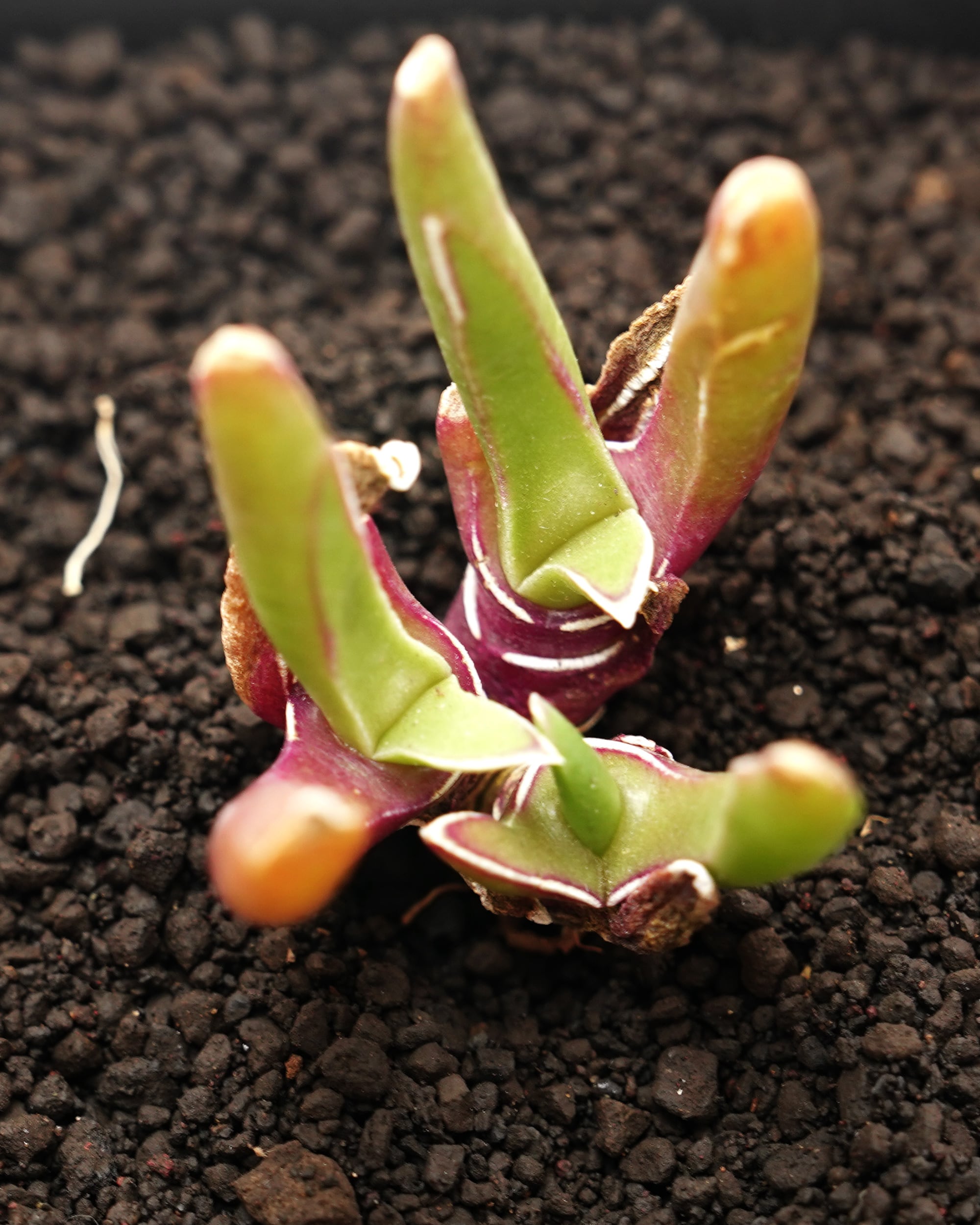 細長く屹立した葉、長さの違う葉が絡み合うフォルム、レッドとグリーンが混ざり合う色彩、そして葉のエッジを日本刀の「刃文(はもん)」のように飾る鮮烈な白いライン……。そのどこをとっても他のメセンとは一線を画す個性的なビジュアルなのは、「グロティフィルム属」という聞き馴染みのない属だから……だけではありません。この「ピアシー」はそのグロティフィルム属のなかでも「白いライン」という唯一無二の際立った特徴で属のイメージを覆すほどのエース級の美しさ。まさに、マニア垂涎のコレクターアイテムと言っても過言ではない……かも。
