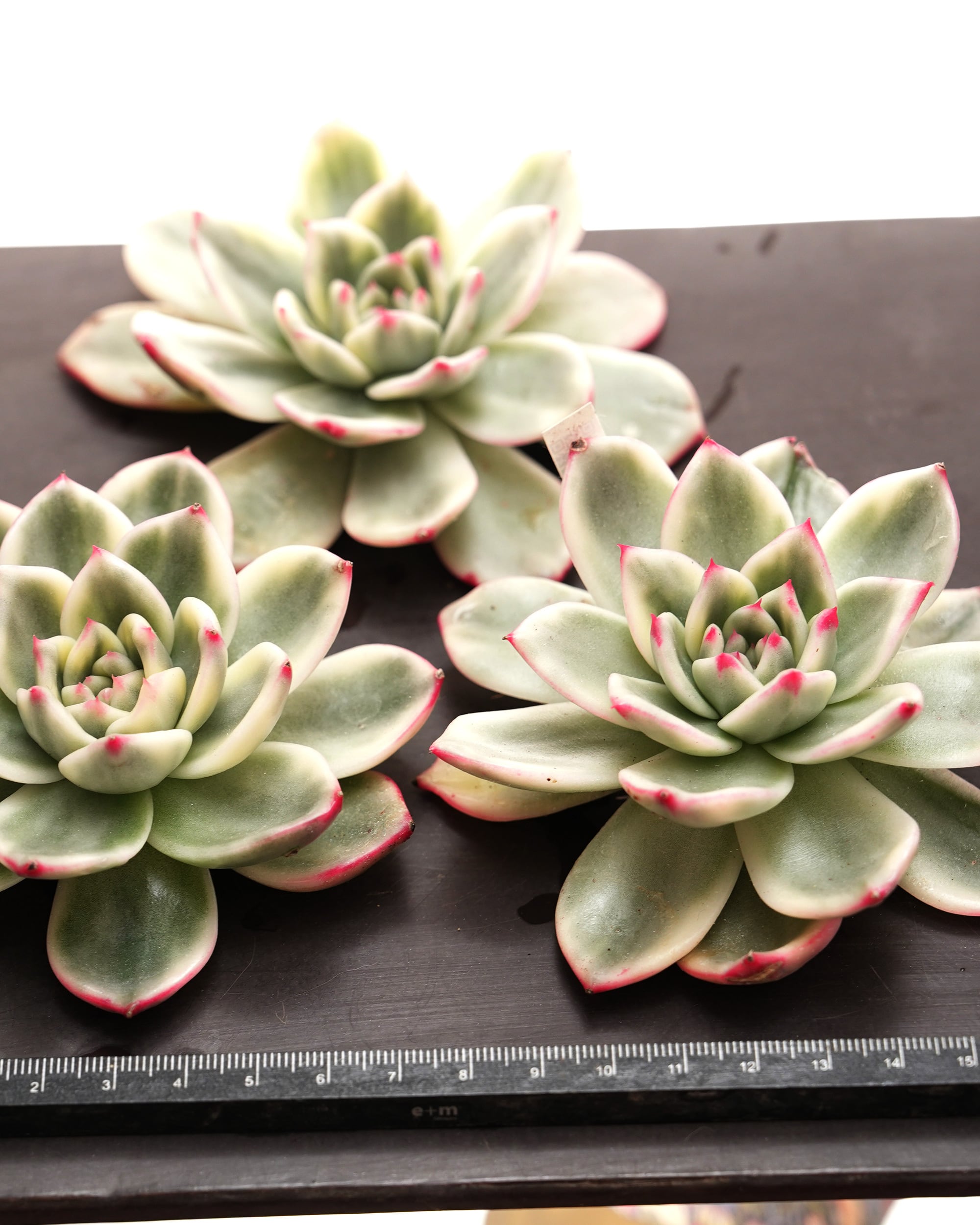 つるりと磨き上げられたような艶のある肉厚な葉を凛々しく彩る深い群青とアイボリーのコントラスト。そしてそのエッジには鮮烈な赤が配され、まるで鍛え上げられたスポーツ選手のように、爽やかさと力強さを兼ね備えたビジュアルに。ふつう、覆輪斑のエケベリアはやわらかい雰囲気のものが多いけど、このコはこのツヤと配色が印象を引き締め、「他とは違う」別格の存在感を放っています。