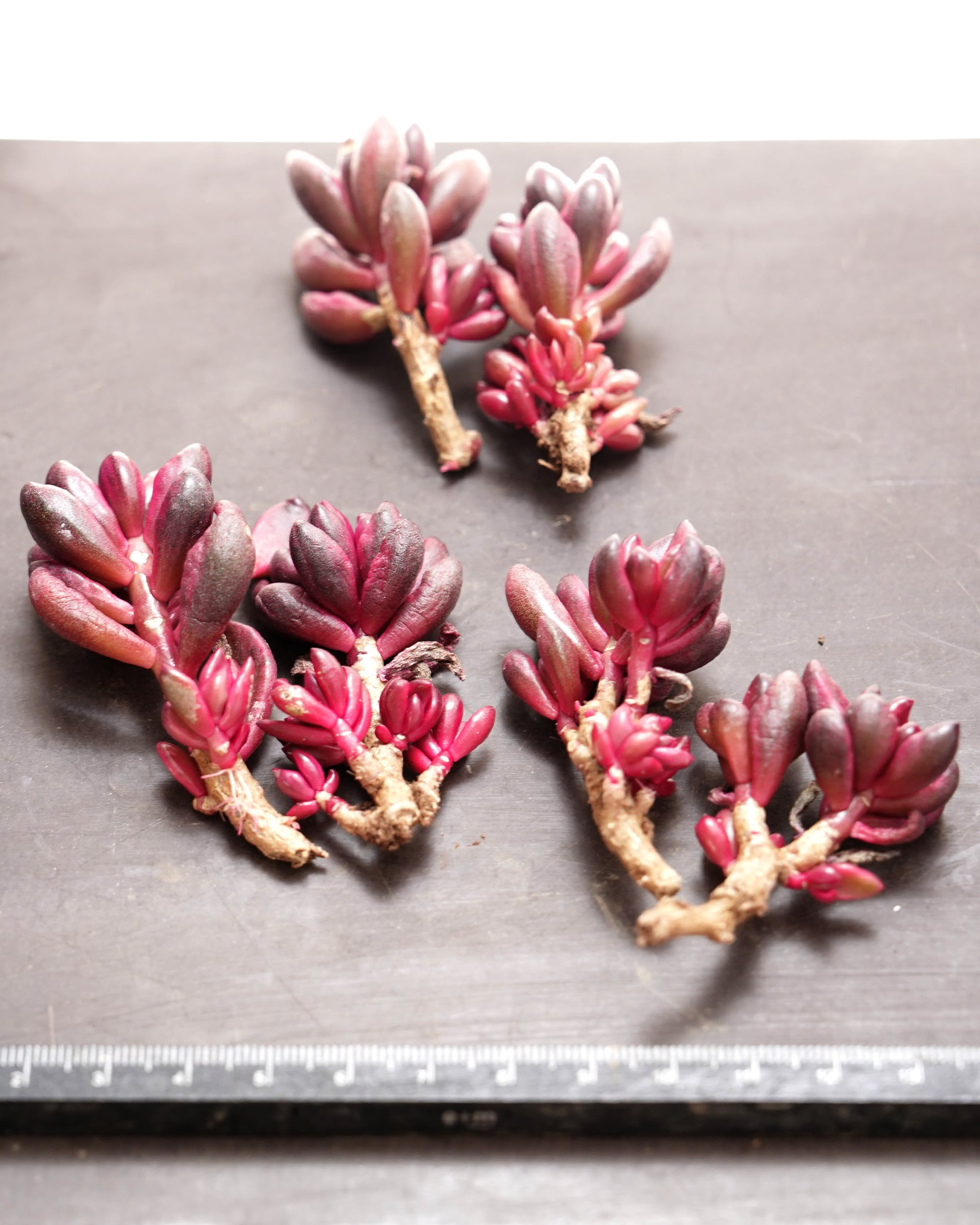 ひと目で心を奪われる、完熟した果実のような艶やかな赤と紫が織りなすストライプ。2025年の後半くらいから登場した「玉連 S. furfuraceum」の斑入りタイプ……ってちょっと待って。ホントに玉連? 葉っぱのカタチ(丸い)も、質感も(ウロコのようなブルーム)、その付き方も(伸ばした枝の途中にまばらにつく)違いますよね。この顔は……「チョコレートアンドストロベリー L. 'Chocolate and Strawberries'」ですよね。確証情報はありませんが、伝言ゲームで取り違えた説が有力かと思います。