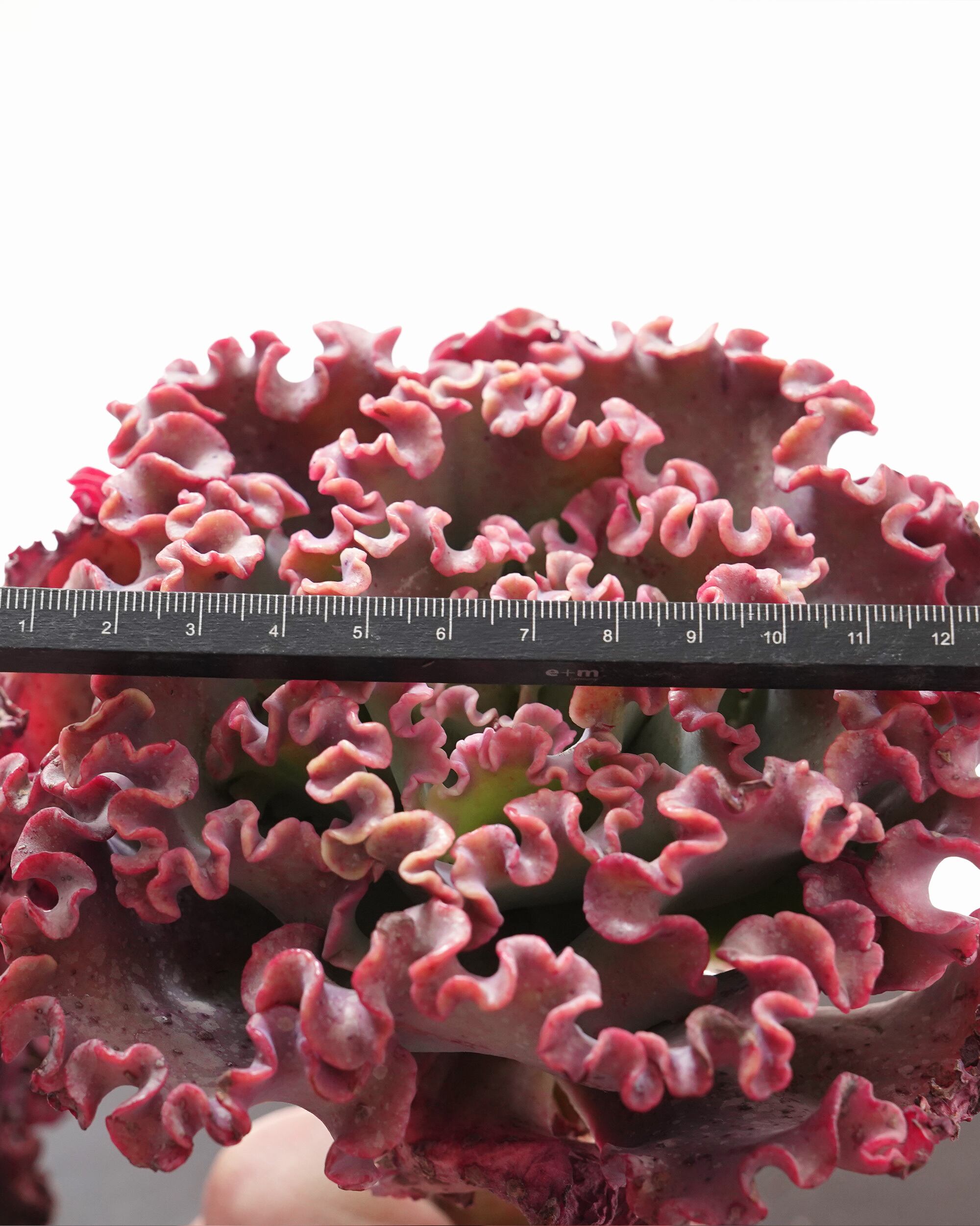 比較的肉厚で量感のある大型フリルエケベリア。エケベリア界の巨匠 Dick Wright 氏によるハイブリッドで1964年生まれ。乙姫の花笠 E. crenulata と Butterfield 1 との交配。近年フリルエケベリアや定番品種が再評価されてるトレンドがあり、このコもその個性的なデザインで注目が暑混てきています。