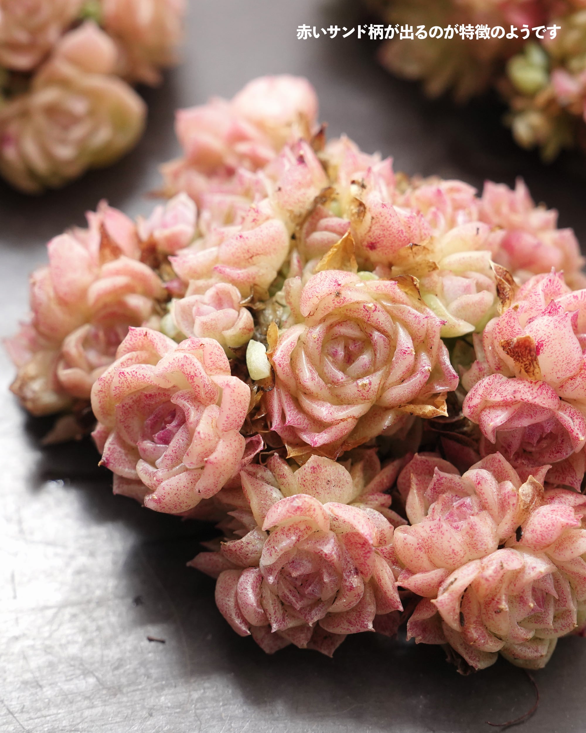まるで精巧なクリスタル細工かリャドロの磁器のような、息をのむほど繊細な姿。ツヤ感と透明感のある葉は乳白色のなかにほんのりサクラ色が溶け込んだような淡いグラデーションで、なんとも高貴な雰囲気を漂わせています。一番の驚きは、そのサイズ感。ひとつひとつのロゼットが1cmあるかないかという超ミニマムな世界で、エケベリア界でもトップクラスの密な群生美。ツヤ感と透明感をあわせ持つ葉の奥に、ミントグリーンの生命力が透けて見える様子は、ずっと眺めていても飽きません。......と言っても、このドラマチックな姿は、たぶん期間限定。以前「ホワイトスワン E. 'White Swan'」がちょうどこんな姿だったことがあるので、このコもまた別の姿を持つのかも。詳しい由来は未明。「朶朶氷 E. 'Duo Duo Bing'」という品種とおそらく同じもの。「コンキュバイン(Concubine)」は「皇妃」という意味。