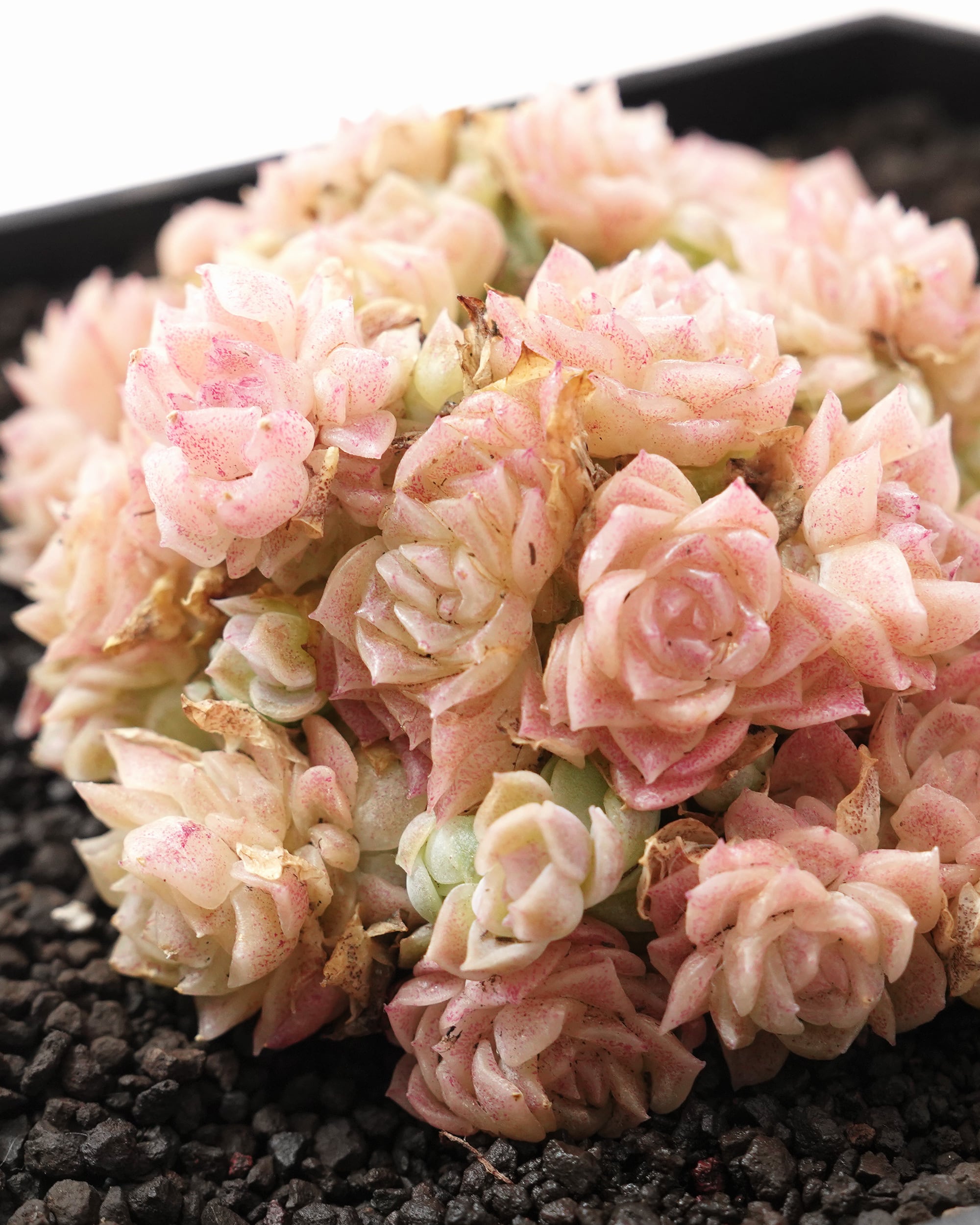まるで精巧なクリスタル細工かリャドロの磁器のような、息をのむほど繊細な姿。ツヤ感と透明感のある葉は乳白色のなかにほんのりサクラ色が溶け込んだような淡いグラデーションで、なんとも高貴な雰囲気を漂わせています。一番の驚きは、そのサイズ感。ひとつひとつのロゼットが1cmあるかないかという超ミニマムな世界で、エケベリア界でもトップクラスの密な群生美。ツヤ感と透明感をあわせ持つ葉の奥に、ミントグリーンの生命力が透けて見える様子は、ずっと眺めていても飽きません。......と言っても、このドラマチックな姿は、たぶん期間限定。以前「ホワイトスワン E. 'White Swan'」がちょうどこんな姿だったことがあるので、このコもまた別の姿を持つのかも。詳しい由来は未明。「朶朶氷 E. 'Duo Duo Bing'」という品種とおそらく同じもの。「コンキュバイン(Concubine)」は「皇妃」という意味。