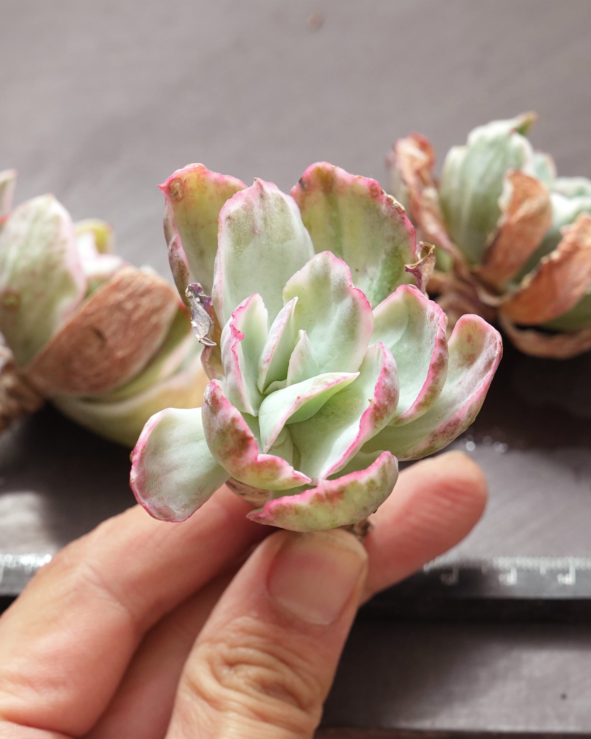 ※カット苗です。未発根で、土はついていません。鉢は撮影用に置いているだけで基本的に鉢植え管理はしていません。発根管理についてはPUKUBOOKコラムを参考にしていただければと思います。