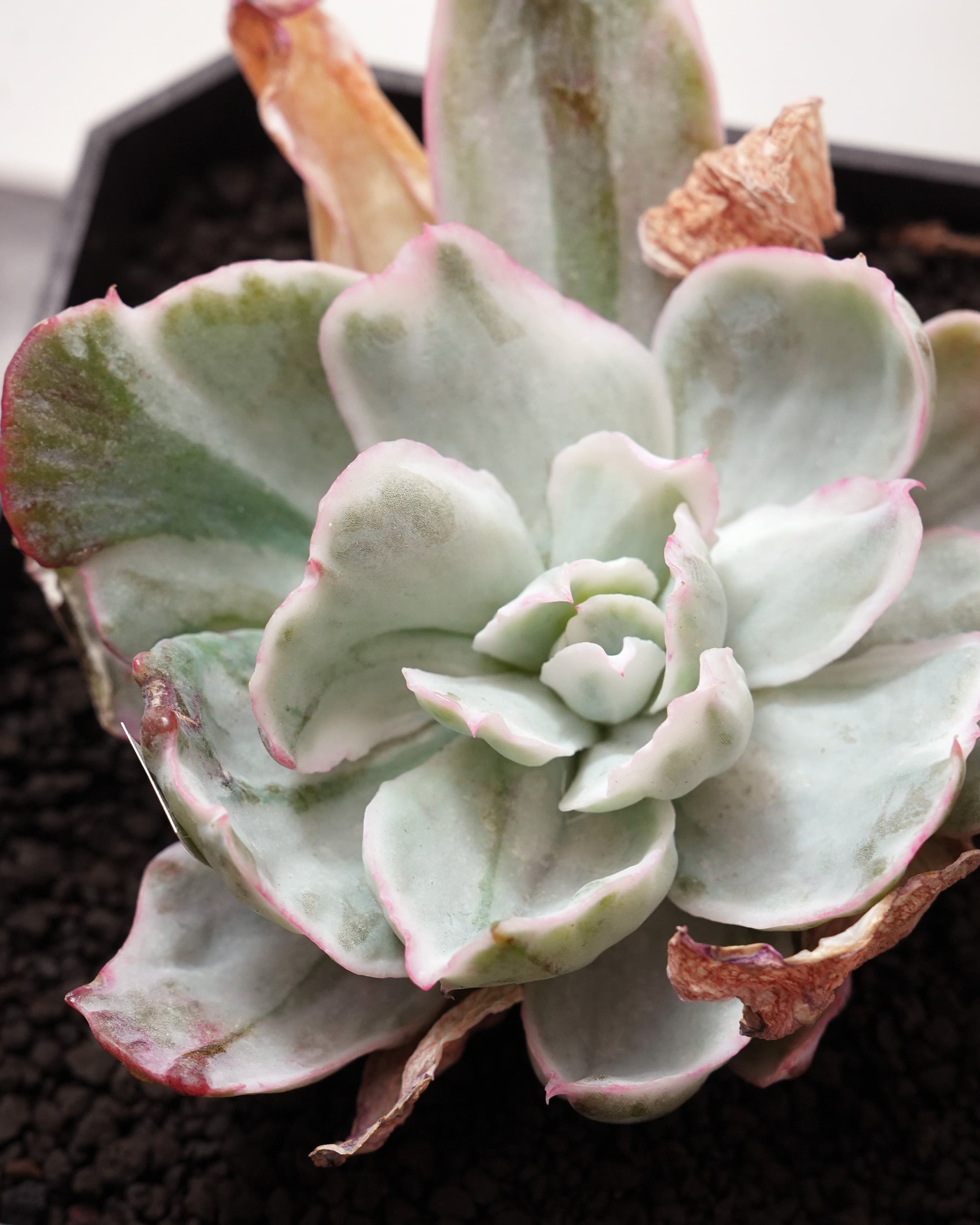 透き通るような淡いグリーンに浮かぶ不規則な白い斑点が、まるで静かな湖面にちぎれ雲が映り込んでいるかのような叙情的な美しさ。ひんやりとした季節になると、わずかに波打つ葉の縁を桃色におめかしして、その儚げな表情にぐっと深みが増します。何かの斑入りとは思うけどその正体や由来は未明。斑入りの影響で葉っぱのカタチが崩れているので、元の品種はぜんぜん違う姿をしていると思います。「バークリーライト E. 'Berkeley Light'」によく似ているけど、こちらのほうが一回り大きくて葉っぱがワイドっぽいのでたぶん別種。