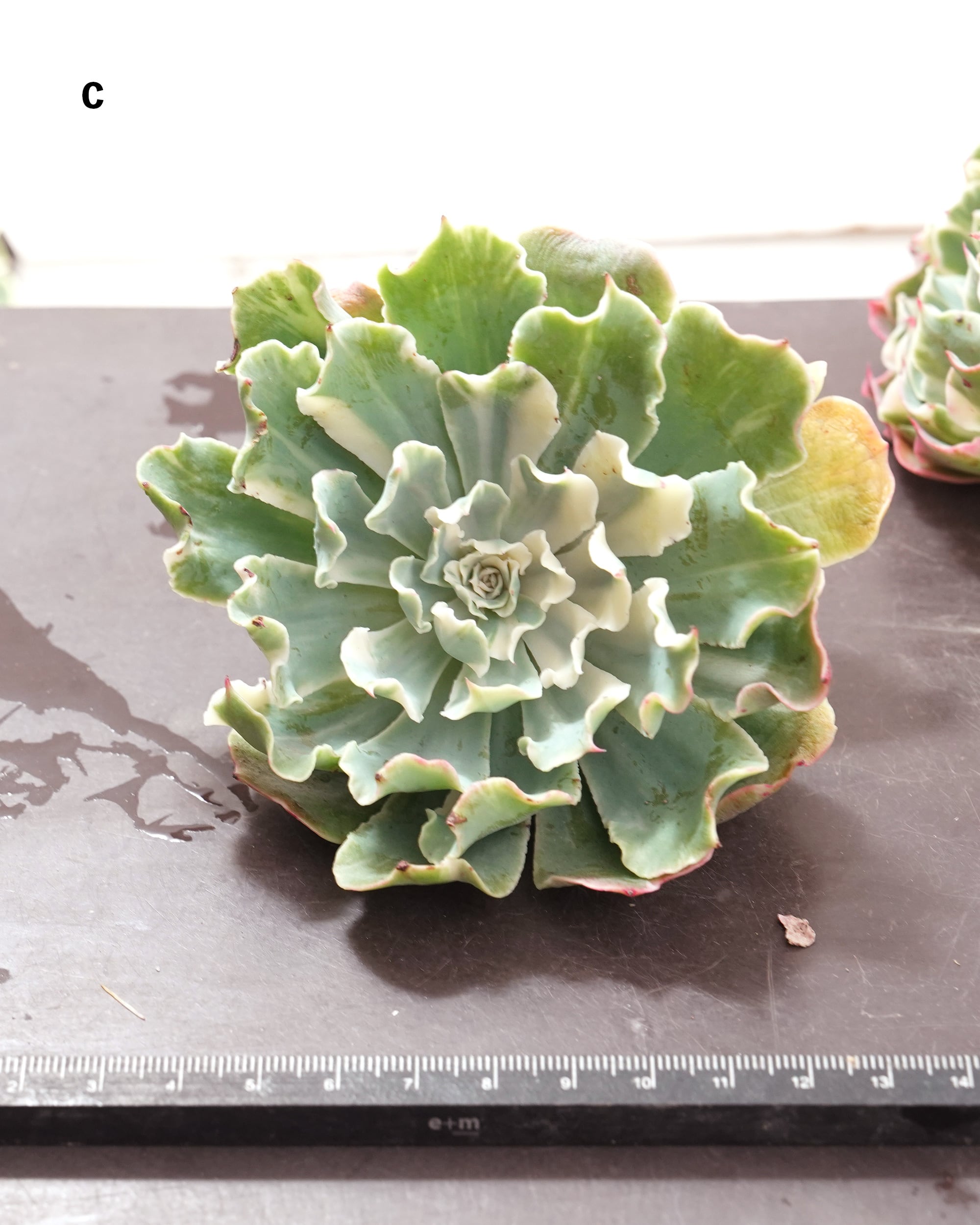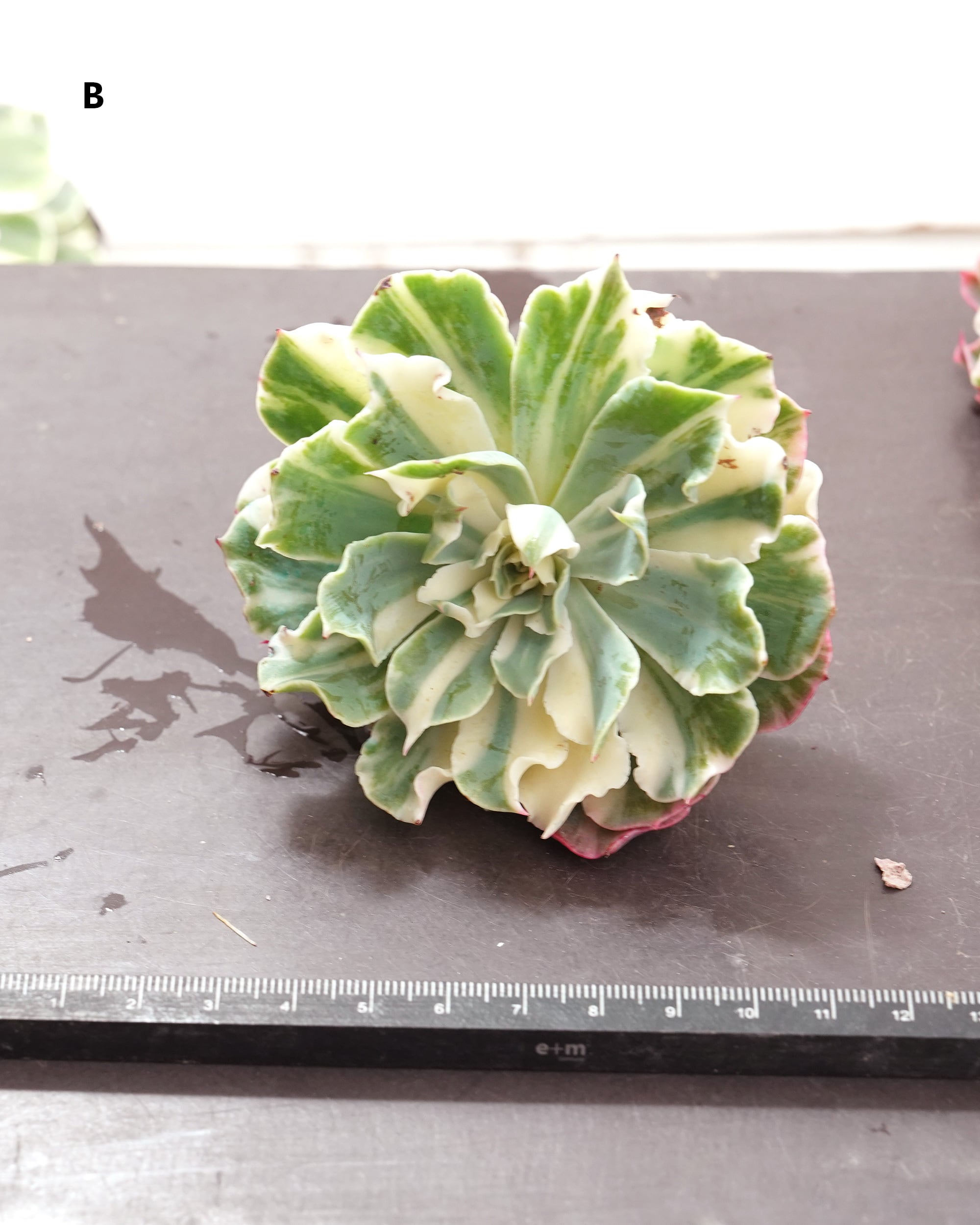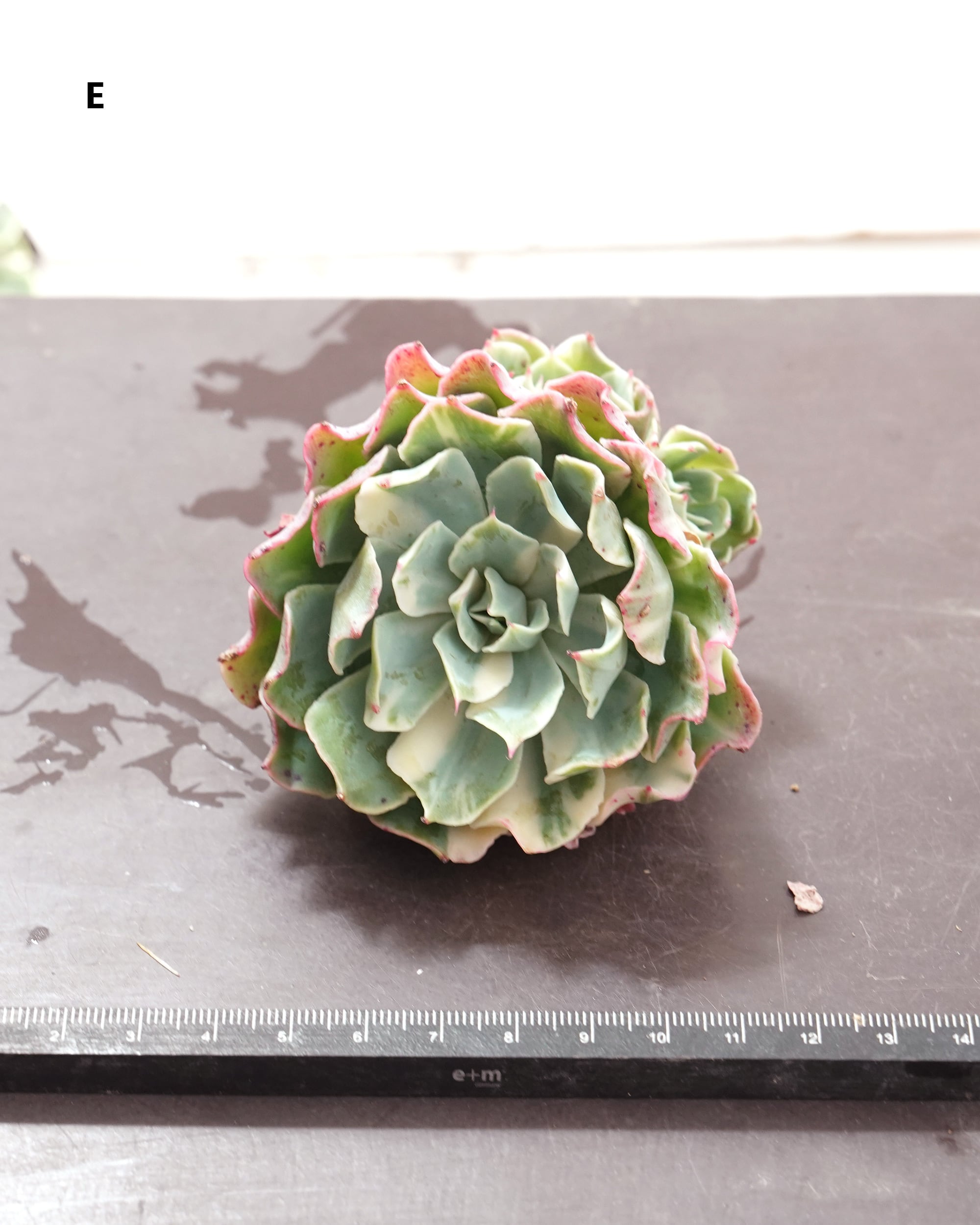 グリーンなウェーブエケベリア「ツナミ E. 'Tsunami'」の斑入りタイプ。おそらく2025年初頭から出てきたニューフェイス。明るいグリーンのウェーブはそのままに、白いストライプがランダムに入り、その芸術的な美しさと言うかかっこよさで目を引きます。ツナミの斑入りタイプには他に「白覆輪 E. 'Tsunami' Marginal Variegated」が出ていて、チワワ錦のように斑の増殖が安定しなくて2タイプに別れちゃうってことなのかと思っています。世間的には白覆輪のほうが評価が高いけど、個人的には、あちらは「リベリア錦 E. 'Liberia Variegated'」に似ていることもあって、こちらのストライプのほうがカッコよくて好きですね。