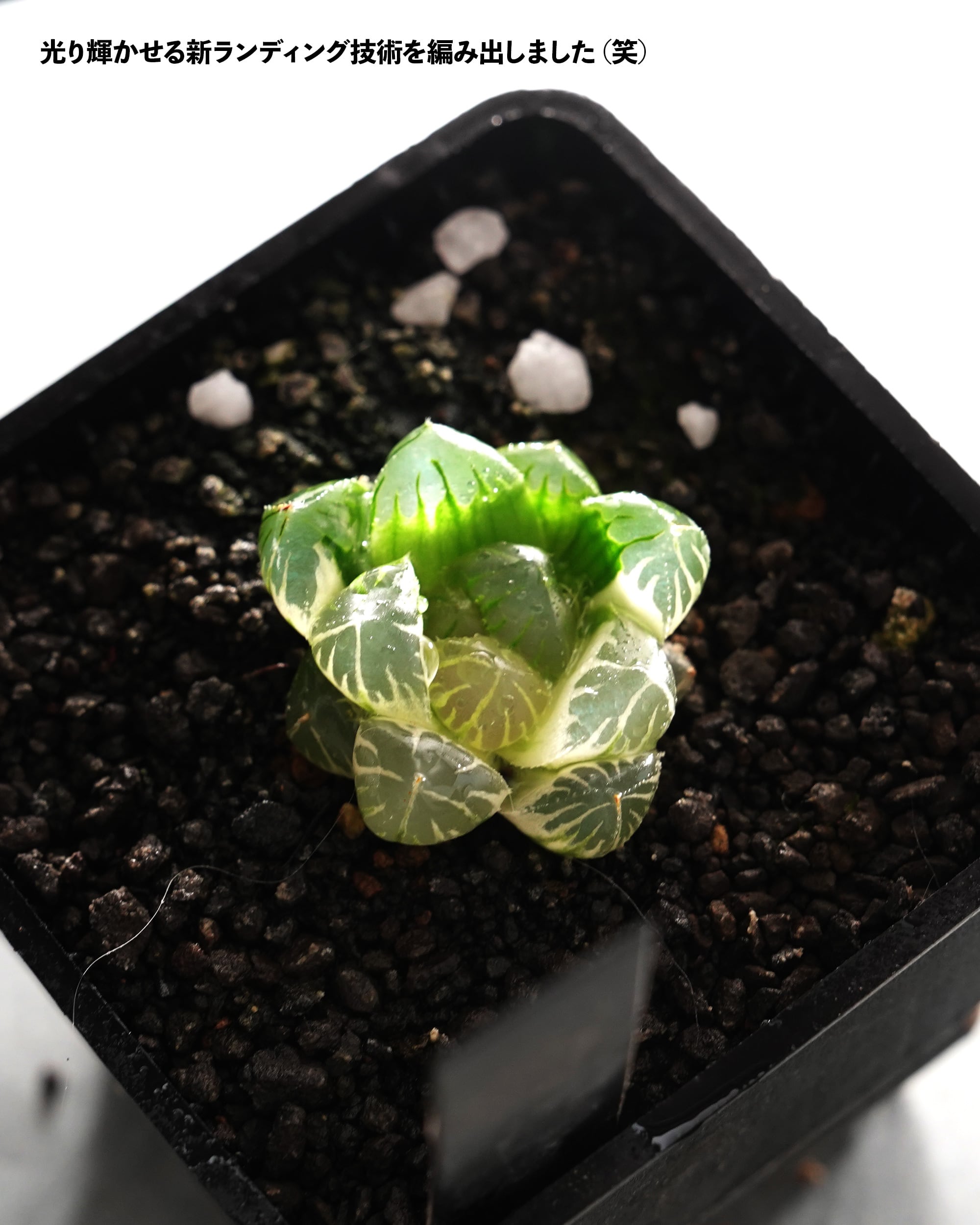 西澤です。「水中月」の陰陽斑をリリースする予定でしたが、直前に品質の問題が見つかり、急遽こちらのコンパクトなコのみをご紹介することになりました。ミニミニサイズではありますが、店長が「オブツーサ錦史上最高傑作」と絶賛する、ツヤ感とコントラストの強い美しいデザインの片鱗をしっかり感じていただけます。発根も確認済みで元気に水を吸っているので、これからの成長がとても楽しみな一株です♪