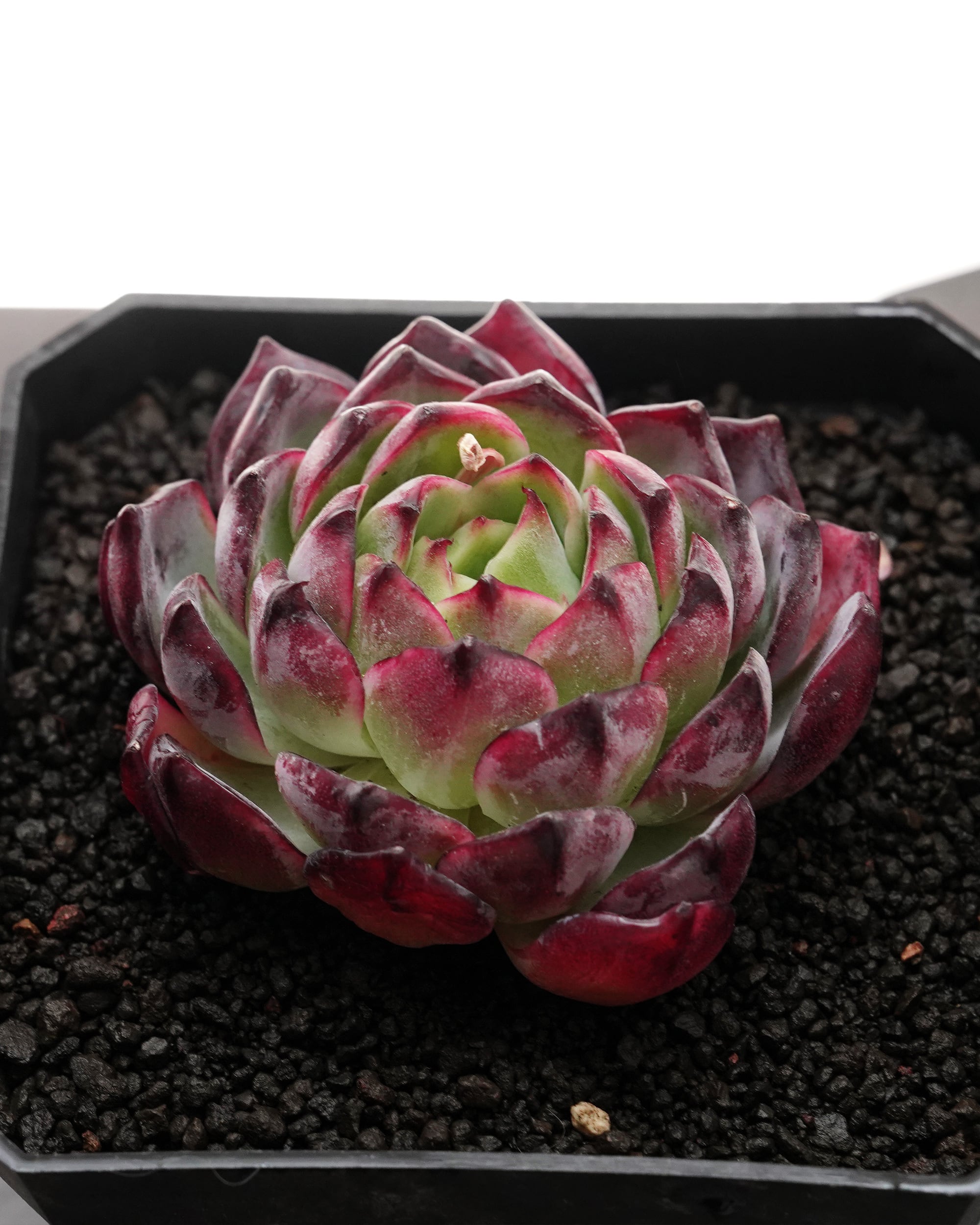 黒エケベリアのニューフェイス。おそらく2025年中国発信。丸みのあるむっちり葉っぱを広げるスタンダードなフォルムで、「ダークチョコレート E. 'Dark Chocolate'」「ブラックマンバ E. 'Black Mamba'」「ブラックダイアモンド E. 'Black Diamond'」「黒武士 E. 'Black Musa'」あたりに近い印象。海外の元ネタっぽい画像を見る限り中心の葉っぱはキールが立ちカッチリ堅そうな印象になるみたい。